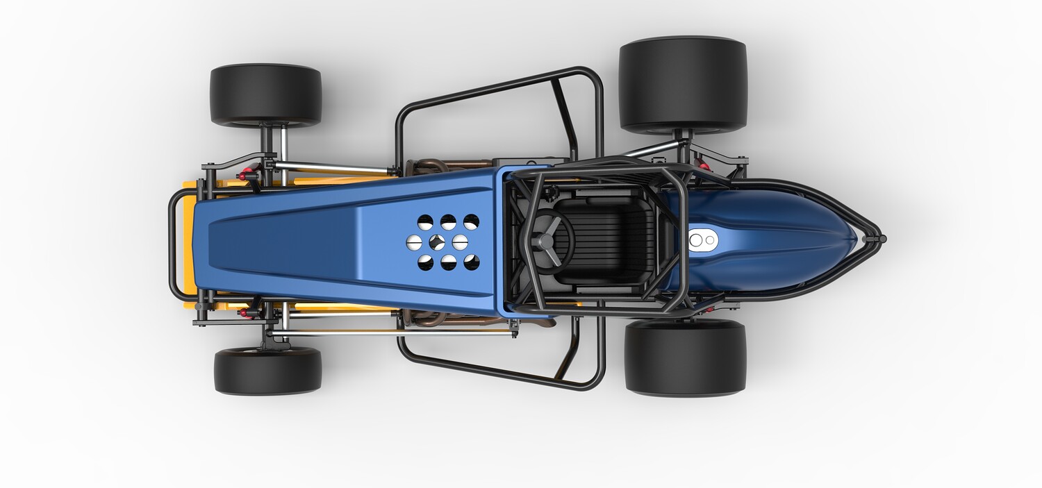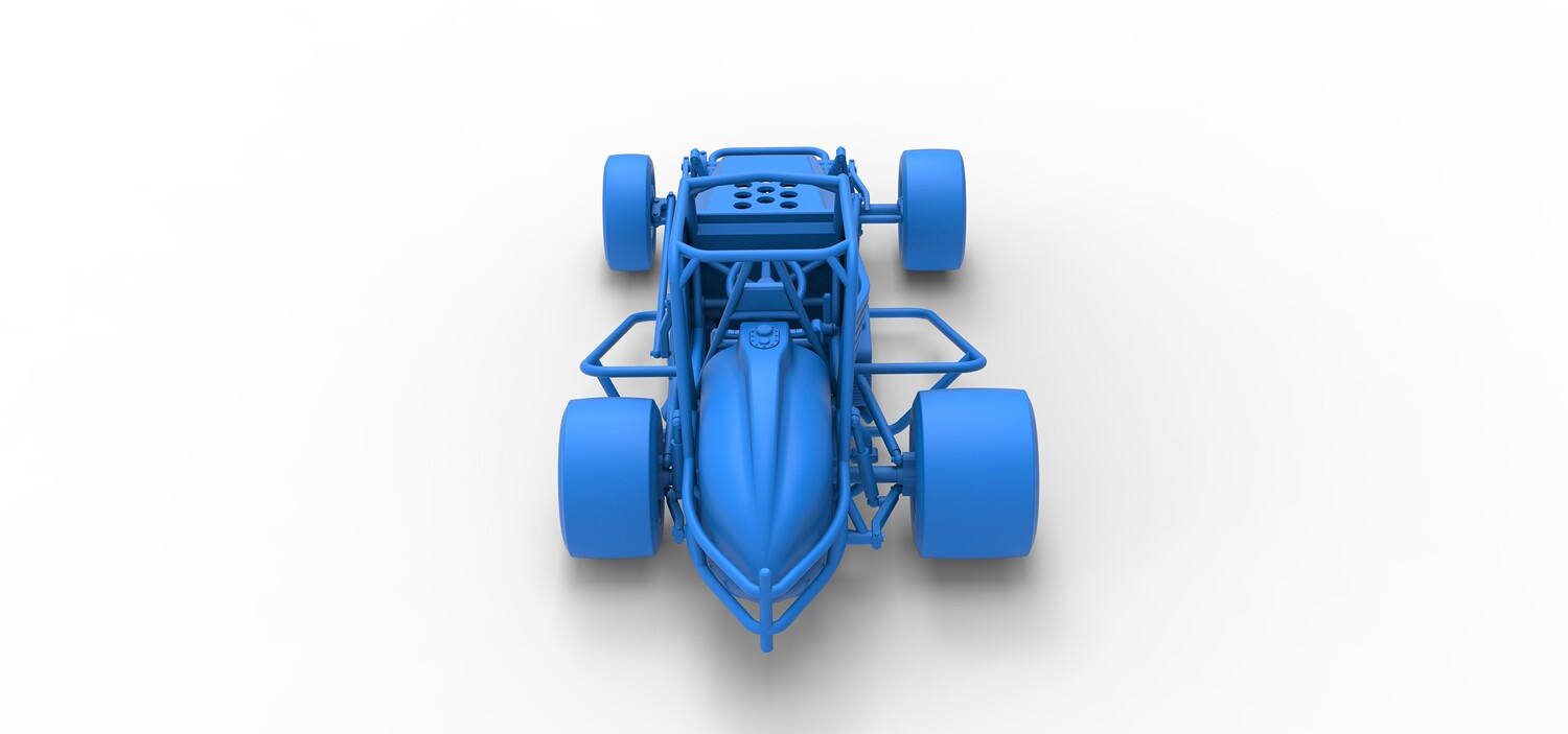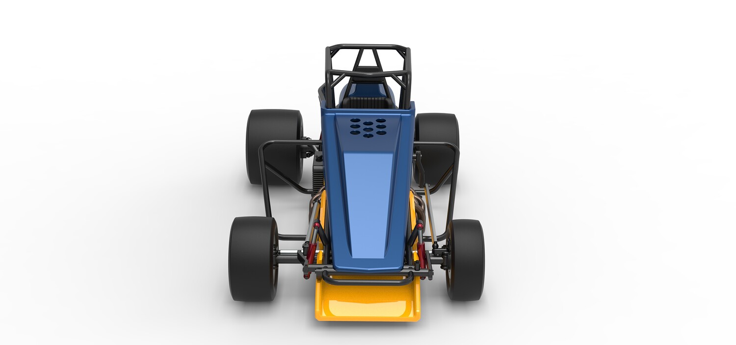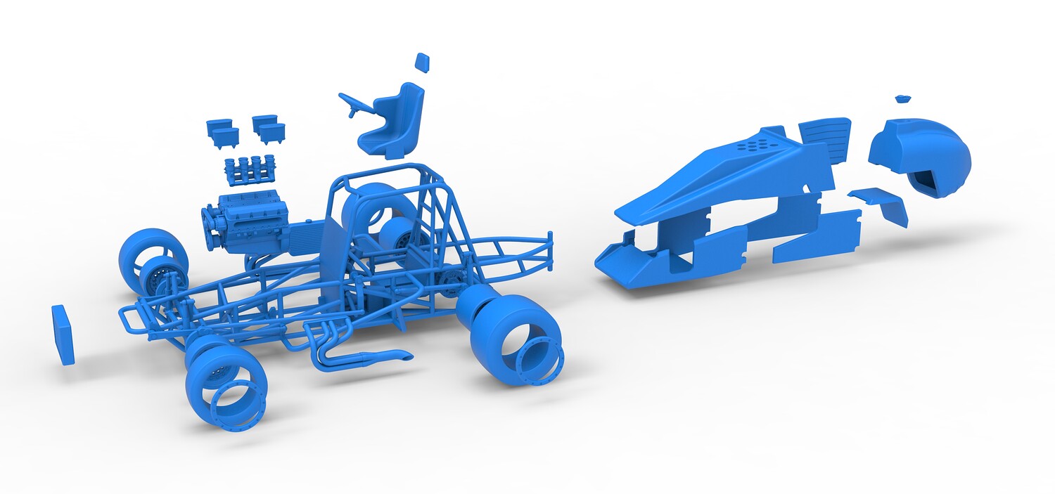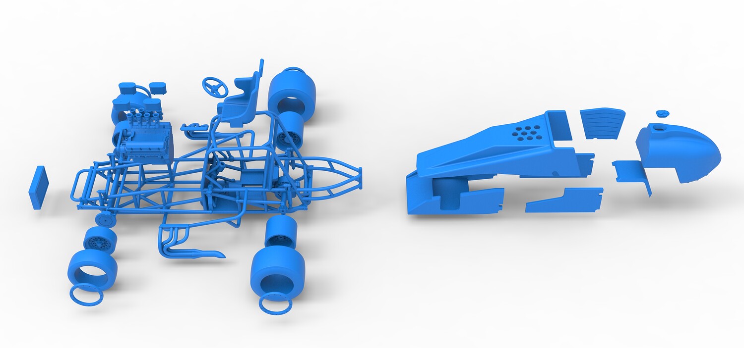The model consists of parts: Air filters, Air intake, Beadlock rings, Engine, Frame, Front left rim, Front left tire, Front right rim, Front right tire, Fuel tank bottom plate, Fuel tank insert, Fuel tank, Headrest, Hood, Left exhaust, Nose, Oil tank, Radiator, Rear left rim, Rear left tire, Rear right rim, Rear right tire, Right exhaust, Right side shield, Seat, Side plates, Steering wheel.