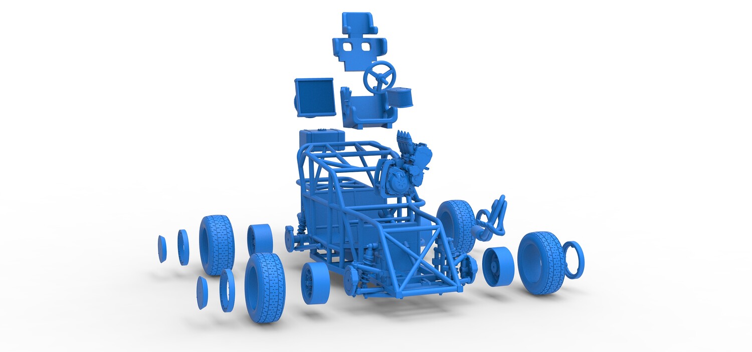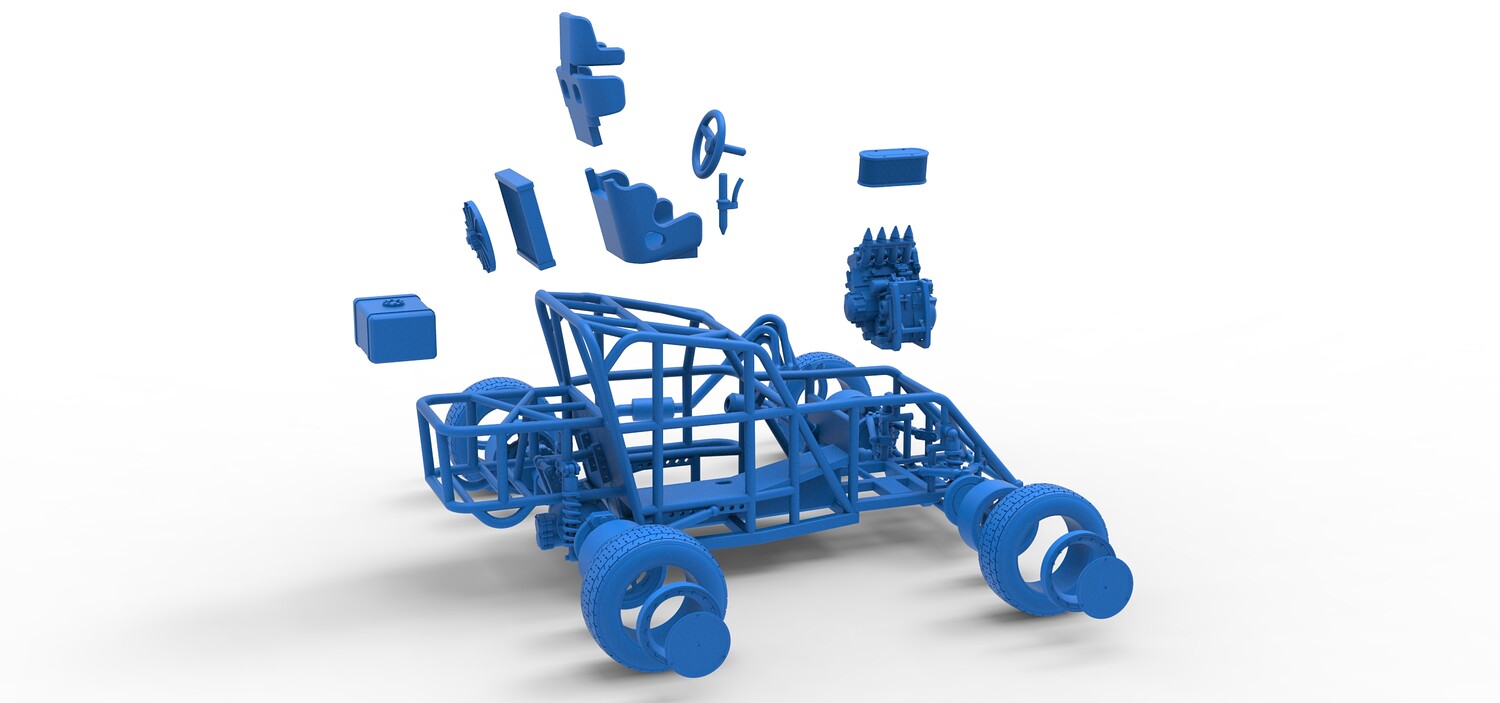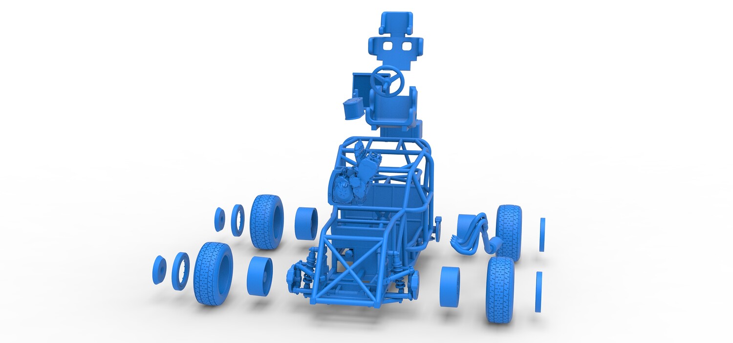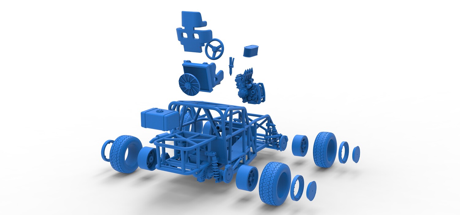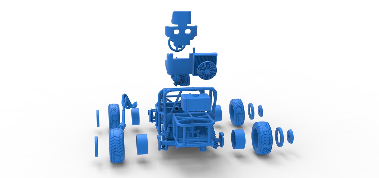 The model consists of parts: Air filter, Beadlock rings, Beadlock rings for mud guard, Engine, Exhaust, Fan, Frame, Front rims, Front tires, Mud guards, Radiator, Rear rims, Rear tires, Seat part 1,2, Shifter, Steering wheel, Tank.