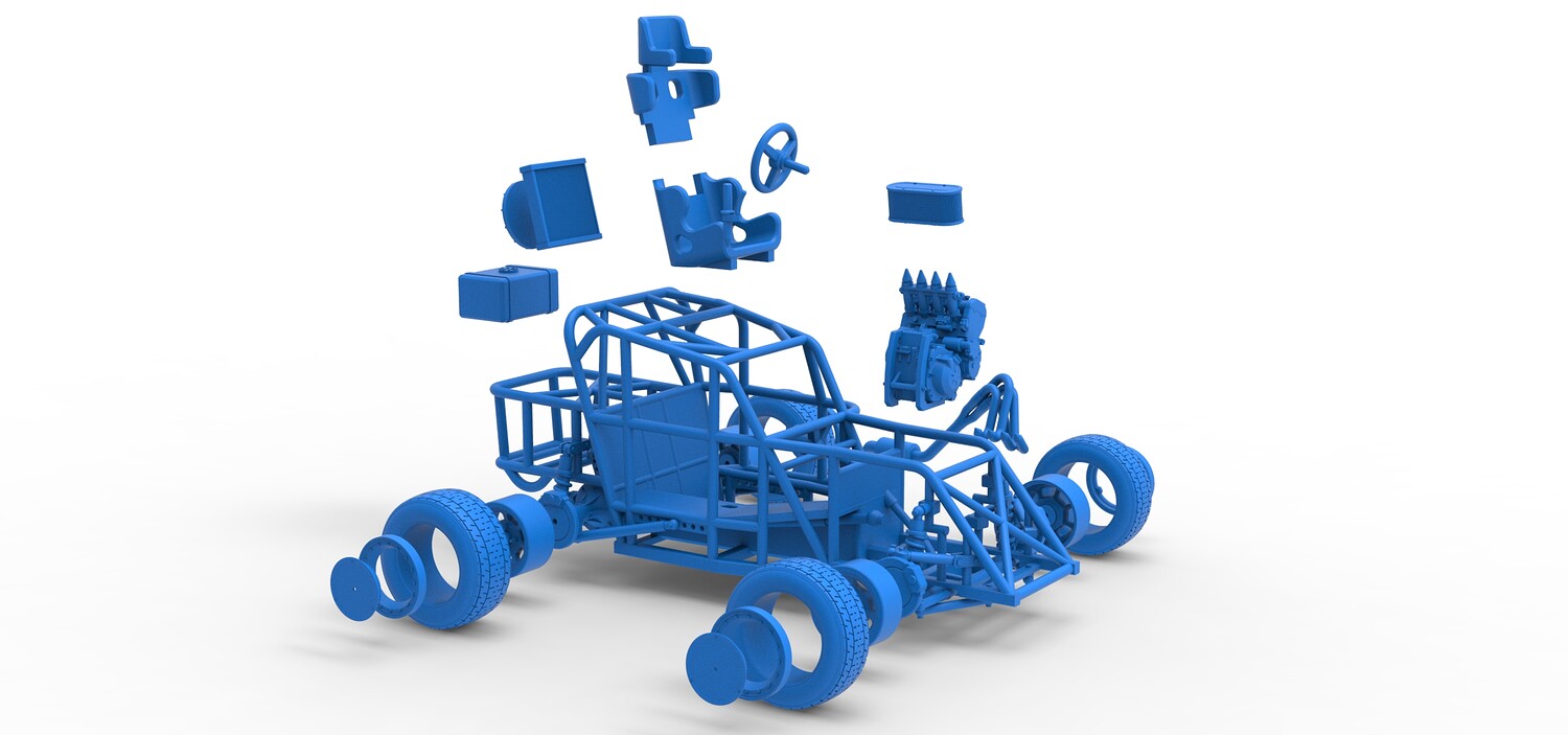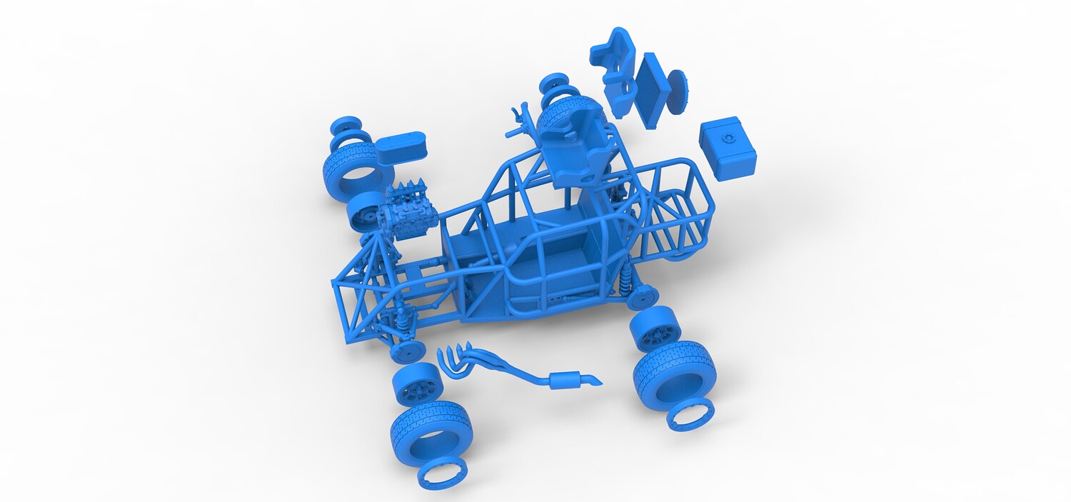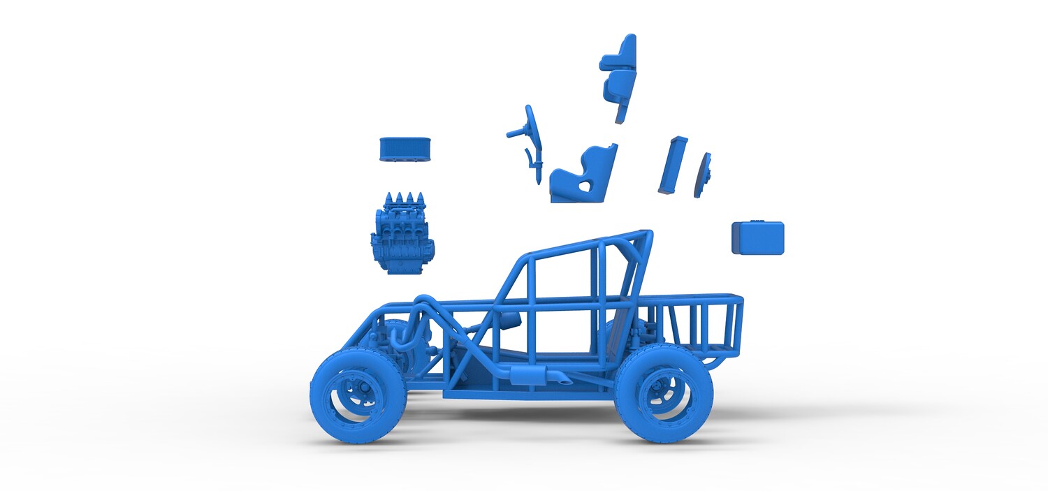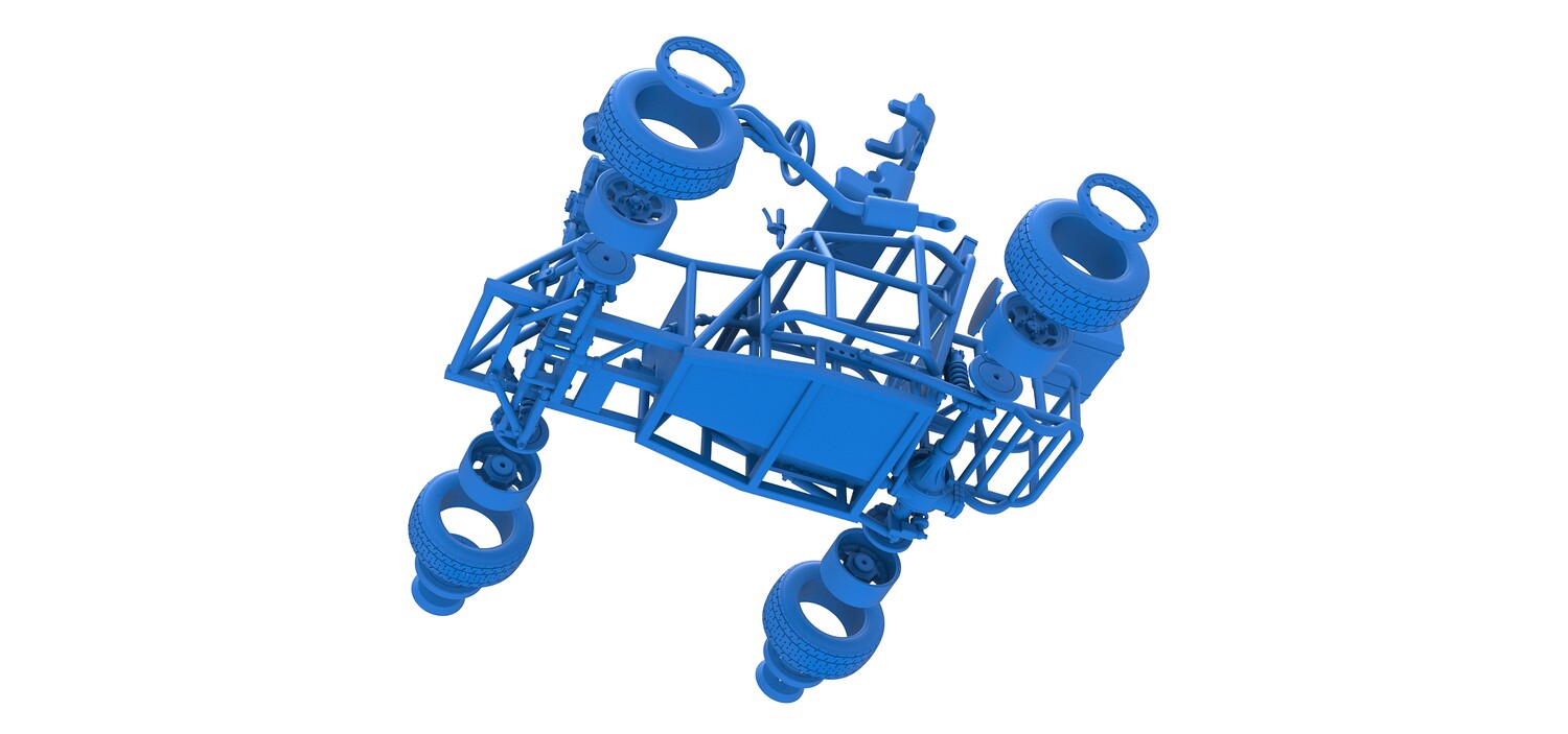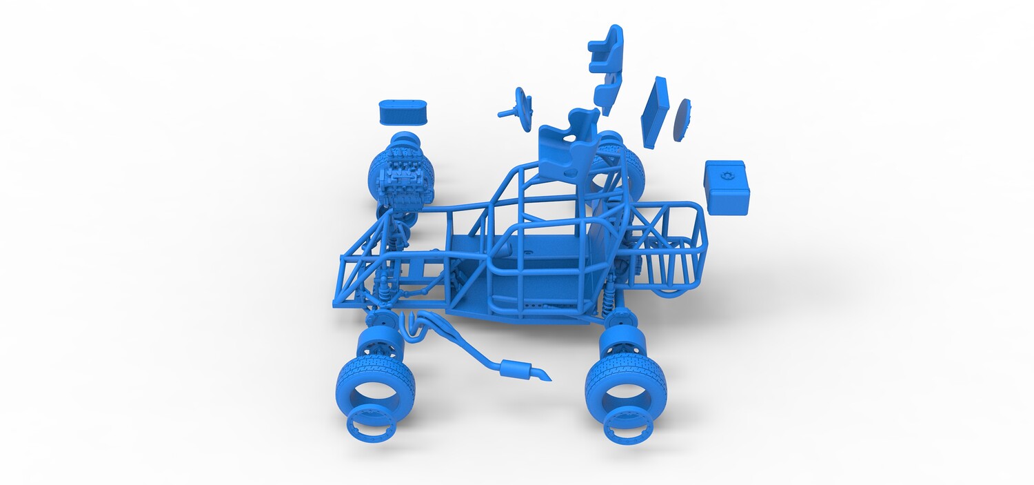 The model consists of parts: Air filter, Beadlock rings, Beadlock rings for mud guard, Engine, Exhaust, Fan, Frame, Front rims, Front tires, Mud guards, Radiator, Rear rims, Rear tires, Seat part 1,2, Shifter, Steering wheel, Tank.