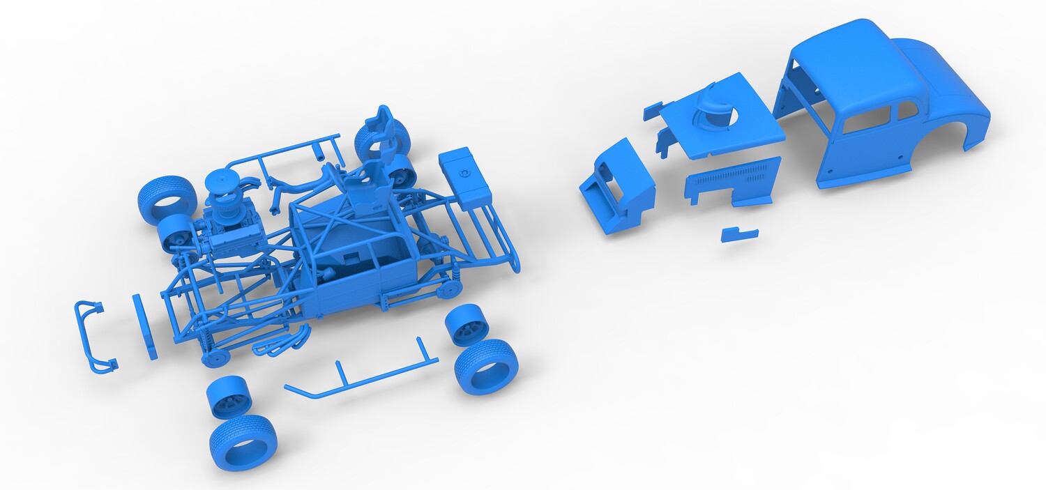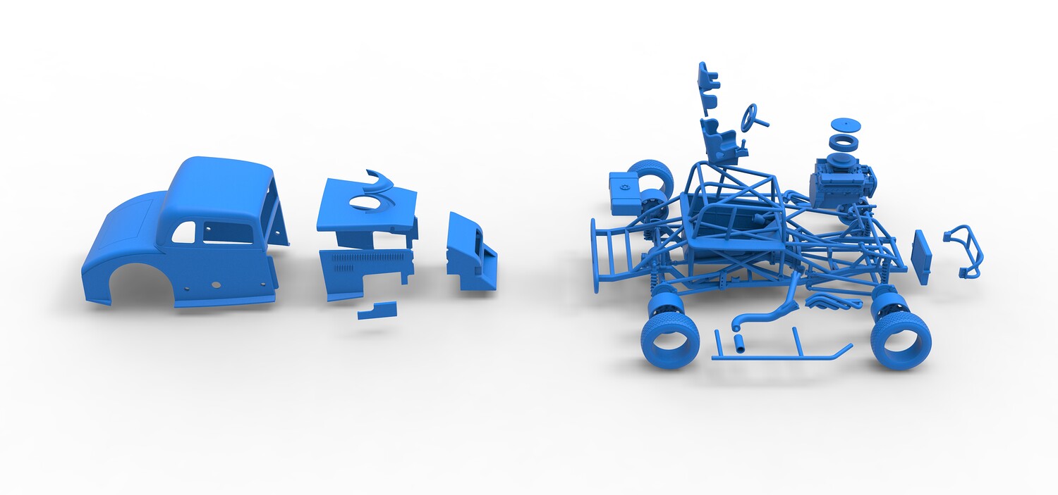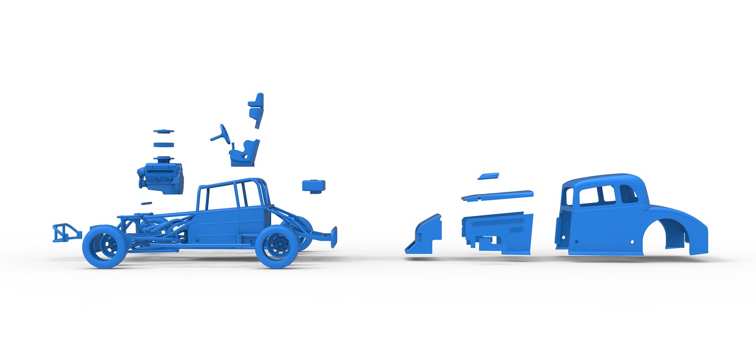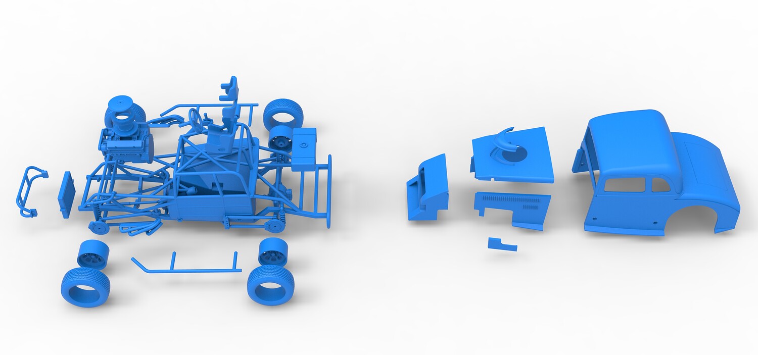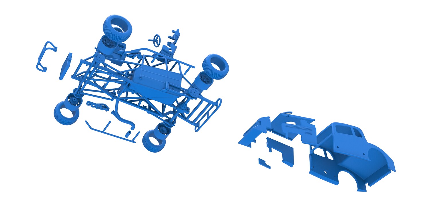The model consists of parts: Air filter cap, Air filter, Cover, Engine, Exhaust pipe part 1,2, Frame, Front bumper, Hood, Insert bar, Left bumper, Left exhaust, Nose, Radiator, Right bumper, Right exhaust, Rims, Seat part 1,2, Shell left part 1,2, Shell main part, Shell right part 1,2, Shifter, Steering wheel, Tank, Tires.