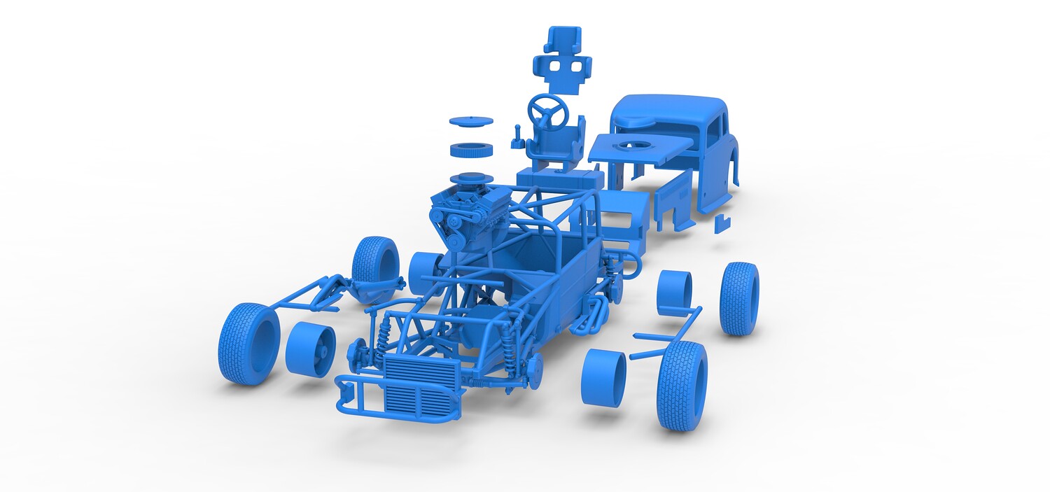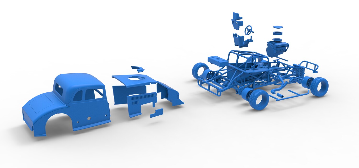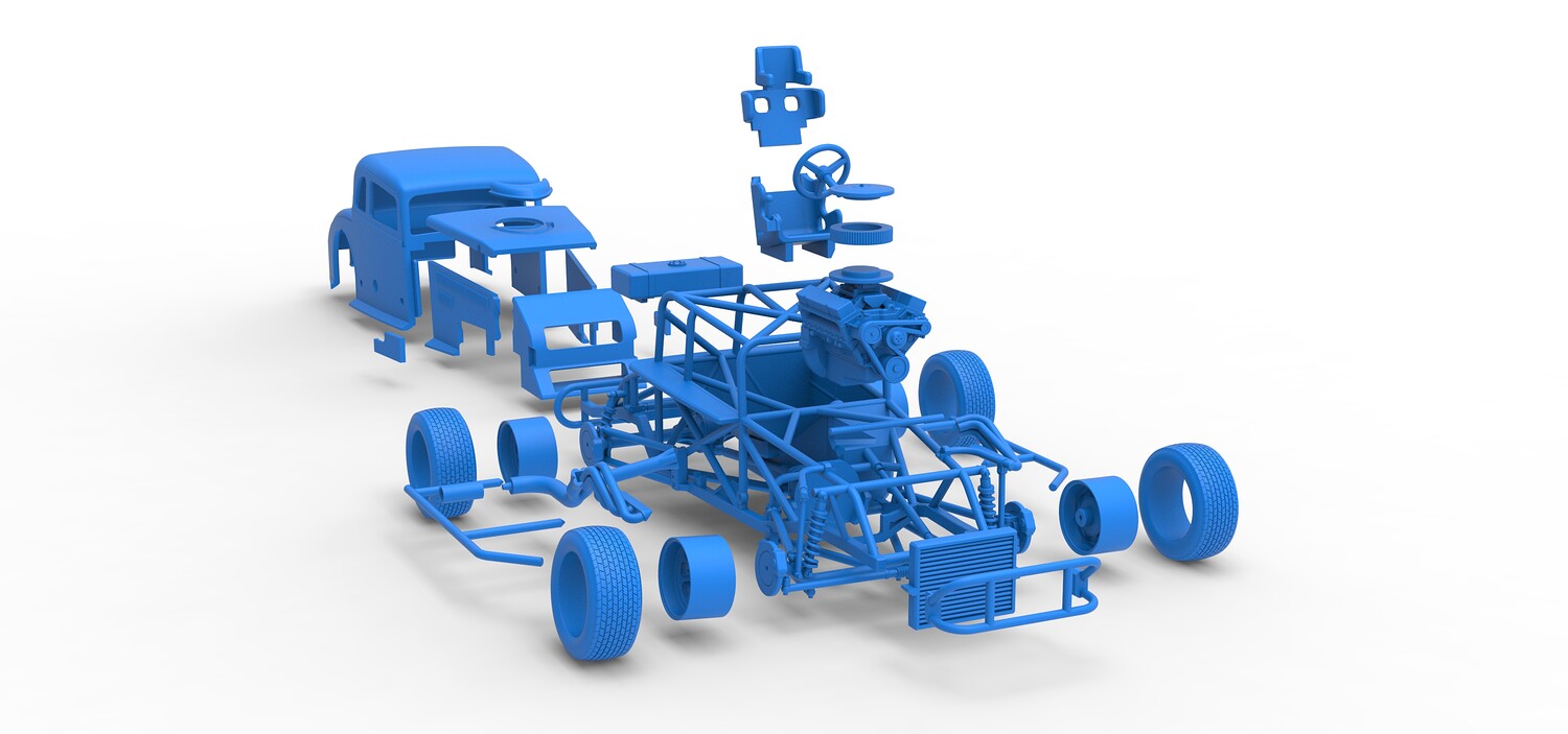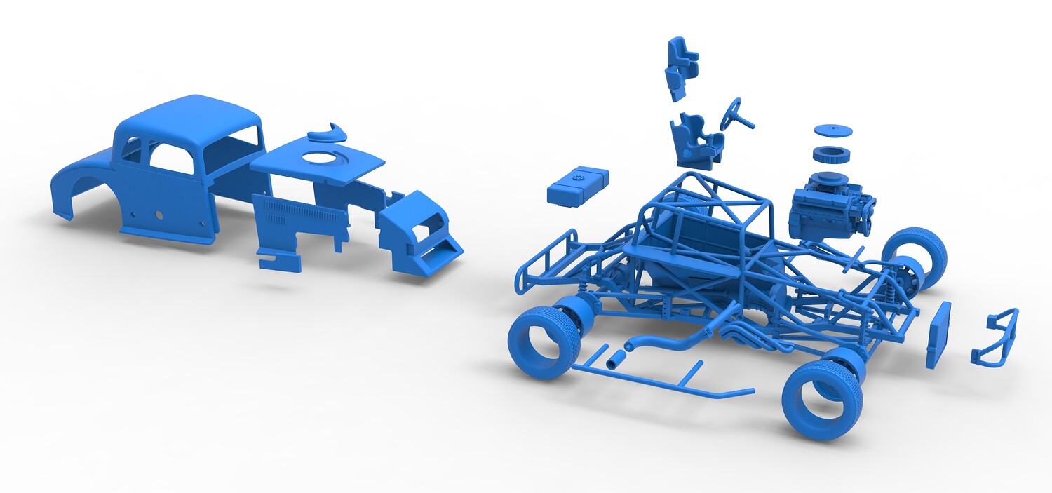 The model consists of parts: Air filter cap, Air filter, Cover, Engine, Exhaust pipe part 1,2, Frame, Front bumper, Hood, Insert bar, Left bumper, Left exhaust, Nose, Radiator, Right bumper, Right exhaust, Rims, Seat part 1,2, Shell left part 1,2, Shell main part, Shell right part 1,2, Shifter, Steering wheel, Tank, Tires.