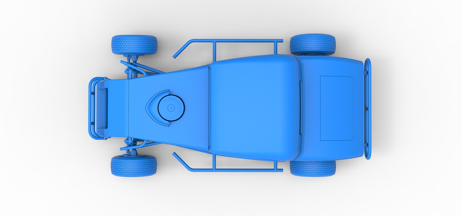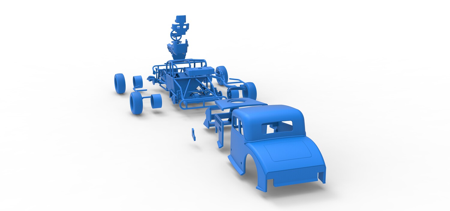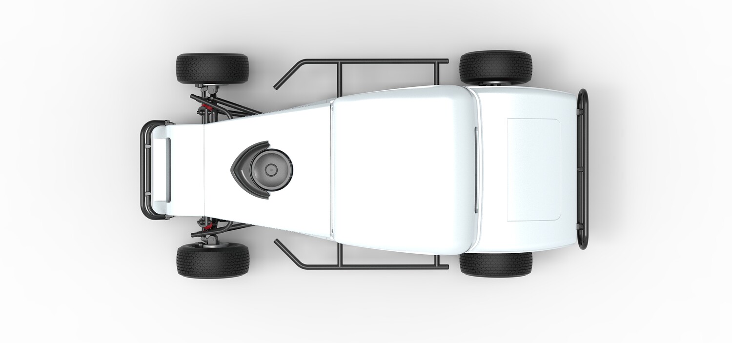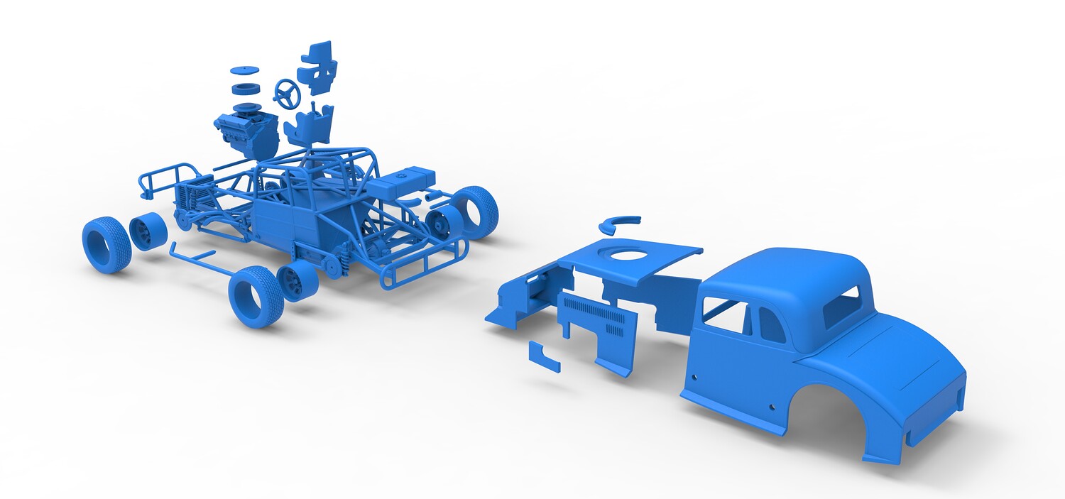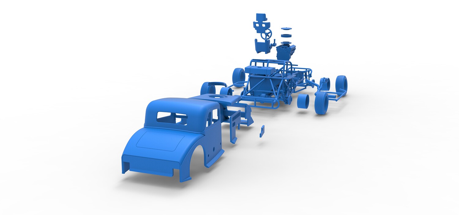 The model consists of parts: Air filter cap, Air filter, Cover, Engine, Exhaust pipe part 1,2, Frame, Front bumper, Hood, Insert bar, Left bumper, Left exhaust, Nose, Radiator, Right bumper, Right exhaust, Rims, Seat part 1,2, Shell left part 1,2, Shell main part, Shell right part 1,2, Shifter, Steering wheel, Tank, Tires.