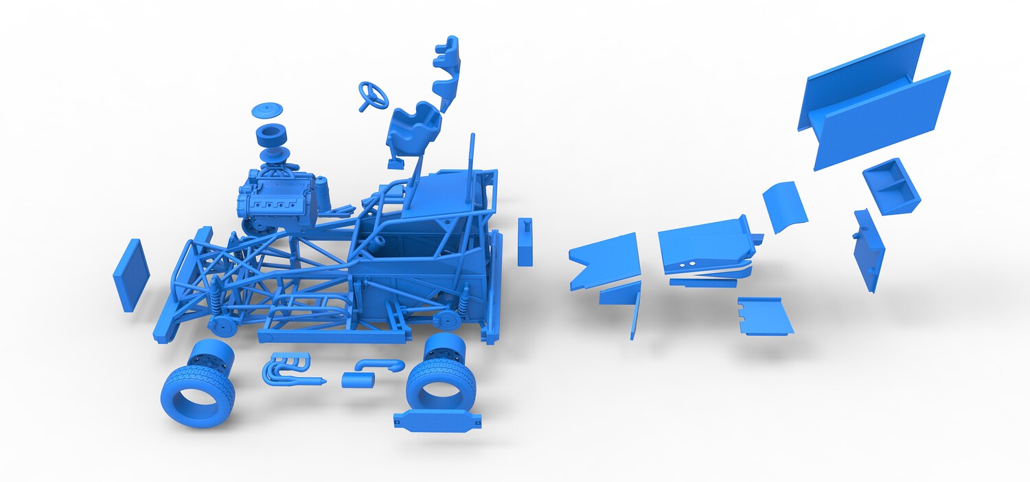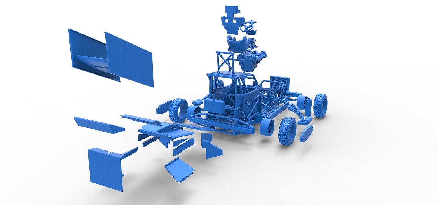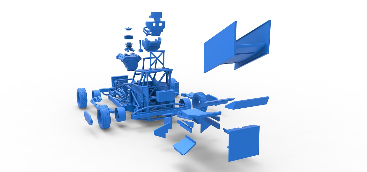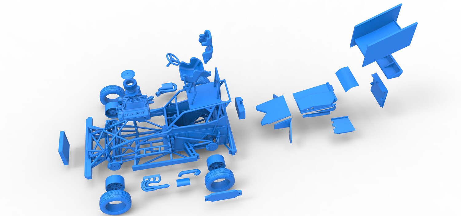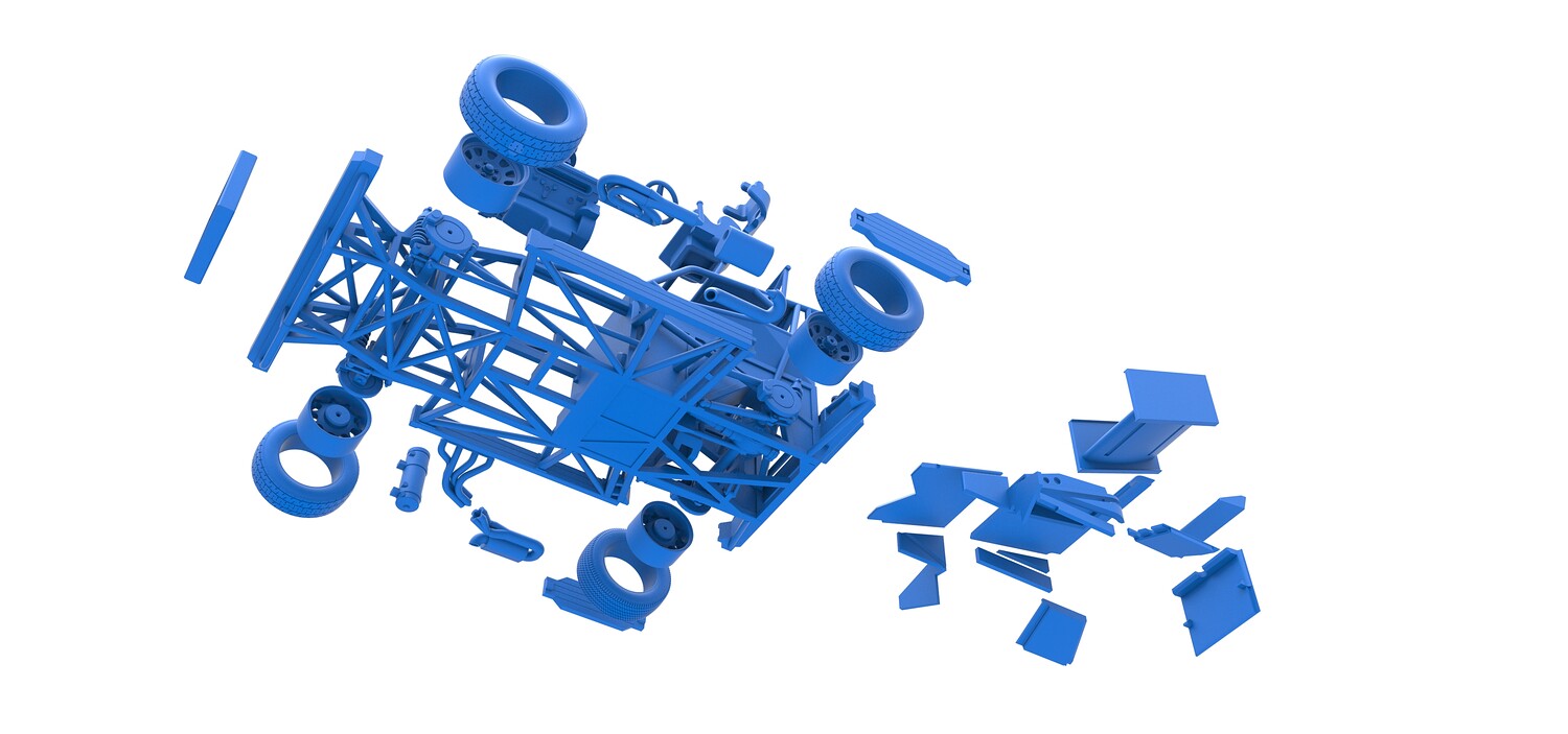 The model consists of parts: Air filter cap, Air filter, Air intake, Engine, Frame, Front rims, Fuel tank, Hood, Left exhaust part 1-3, Oil tank, Radiator, Rear right tire, Rear rims, Rear wheel guards, Right exhaust part 1,2, Seat part 1,2, Shell front part, Shell left part 1-4, Shell rear part, Shell right part 1-4, Shifter, Spoiler, Steering wheel, Tires, Top wing, Visor.