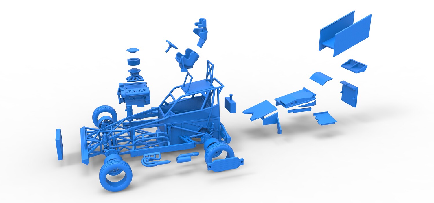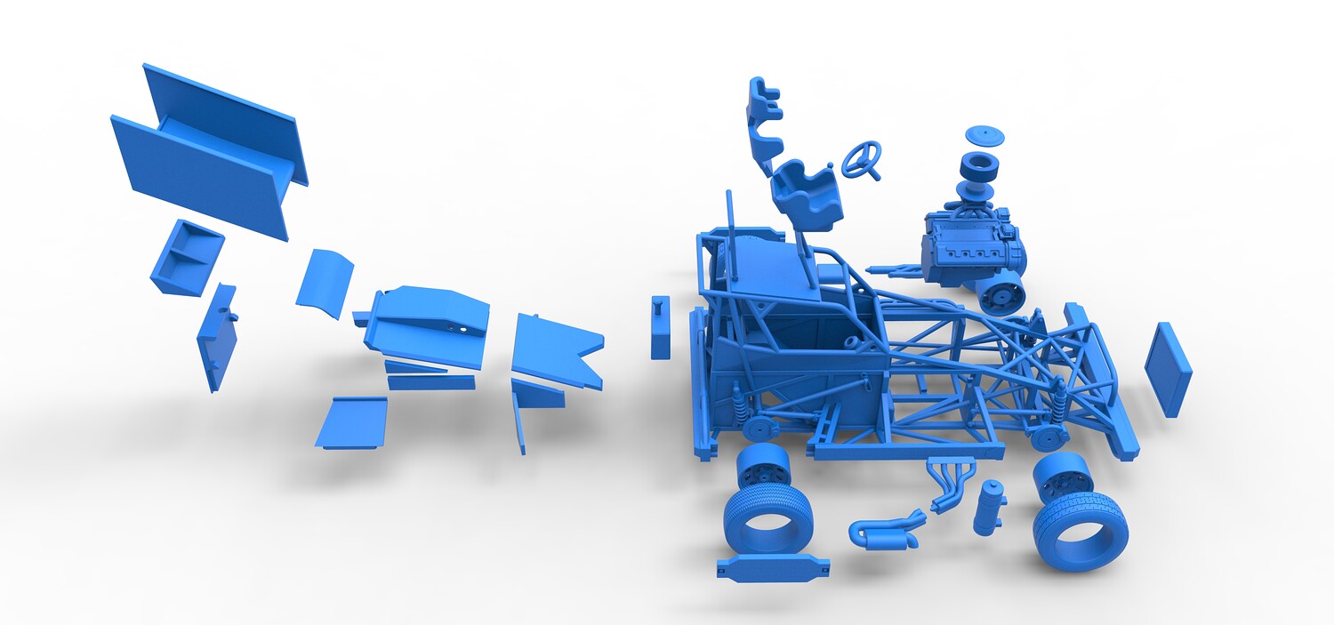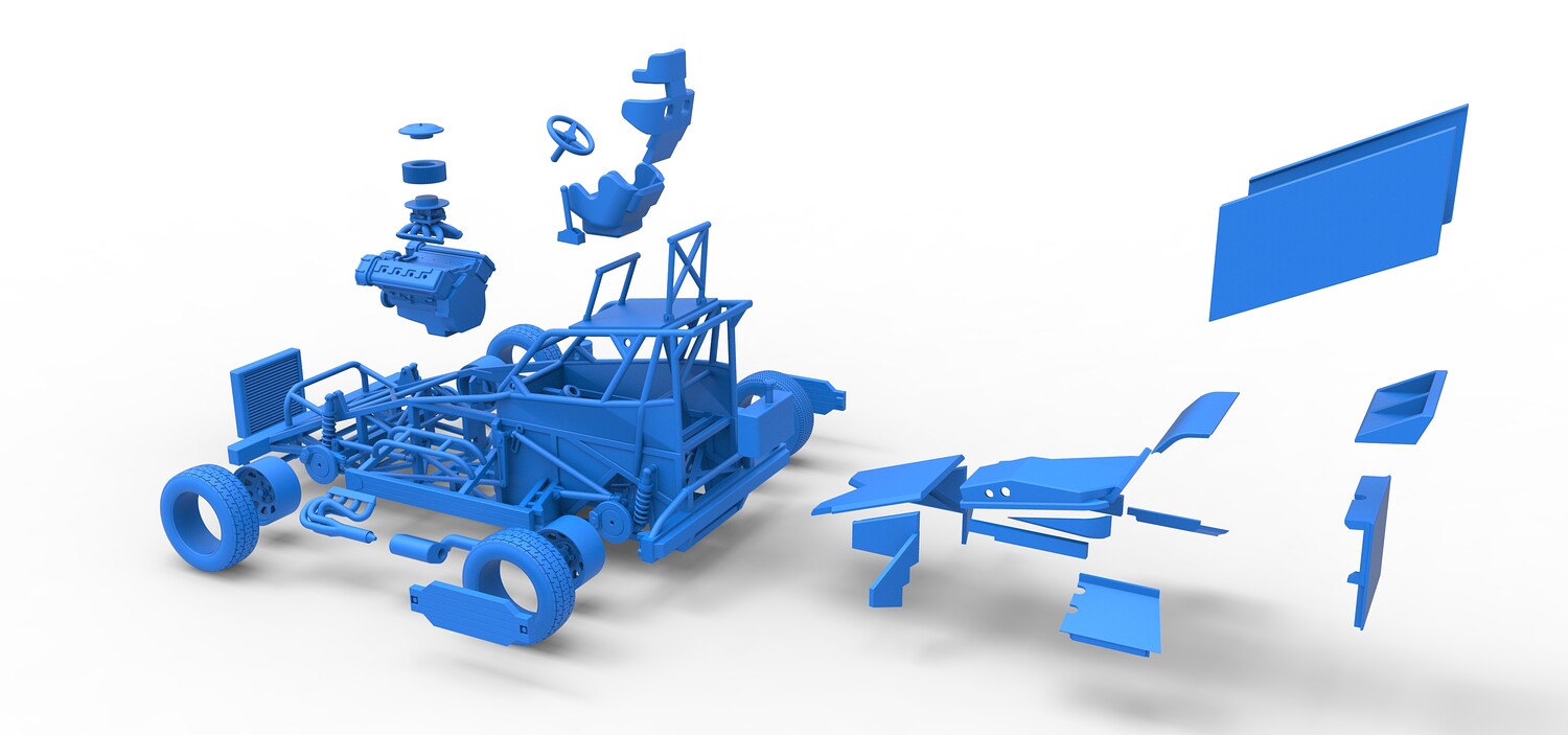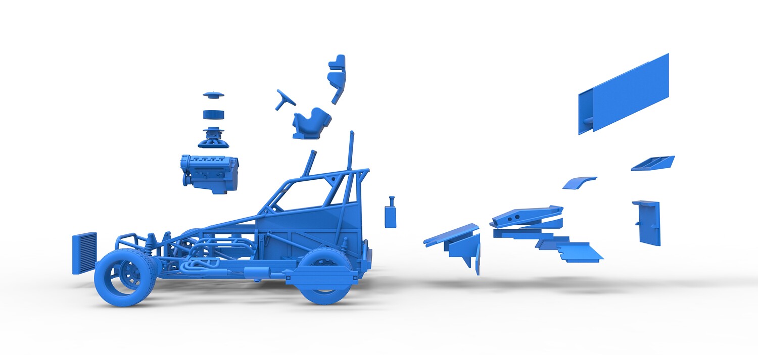 The model consists of parts: Air filter cap, Air filter, Air intake, Engine, Frame, Front rims, Fuel tank, Hood, Left exhaust part 1-3, Oil tank, Radiator, Rear right tire, Rear rims, Rear wheel guards, Right exhaust part 1,2, Seat part 1,2, Shell front part, Shell left part 1-4, Shell rear part, Shell right part 1-4, Shifter, Spoiler, Steering wheel, Tires, Top wing, Visor.