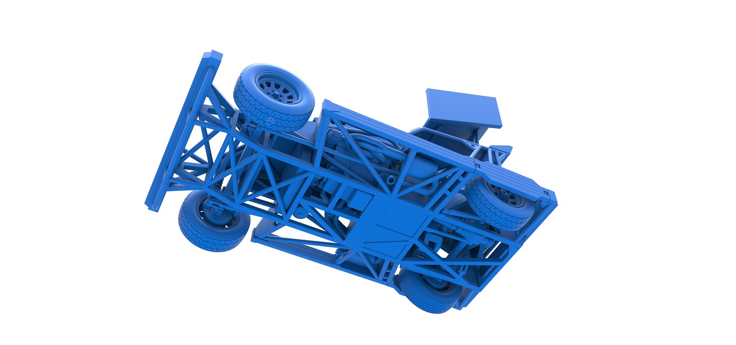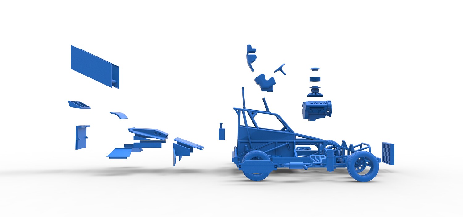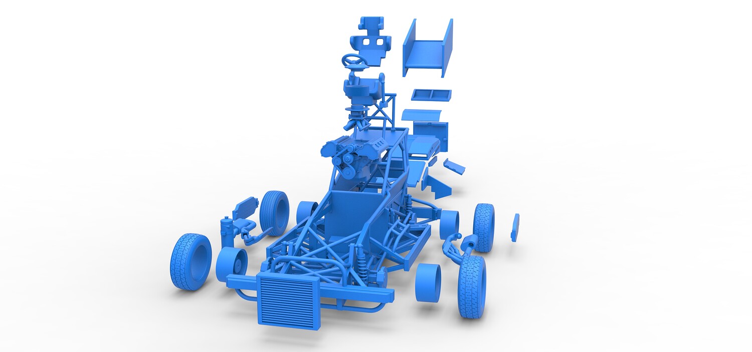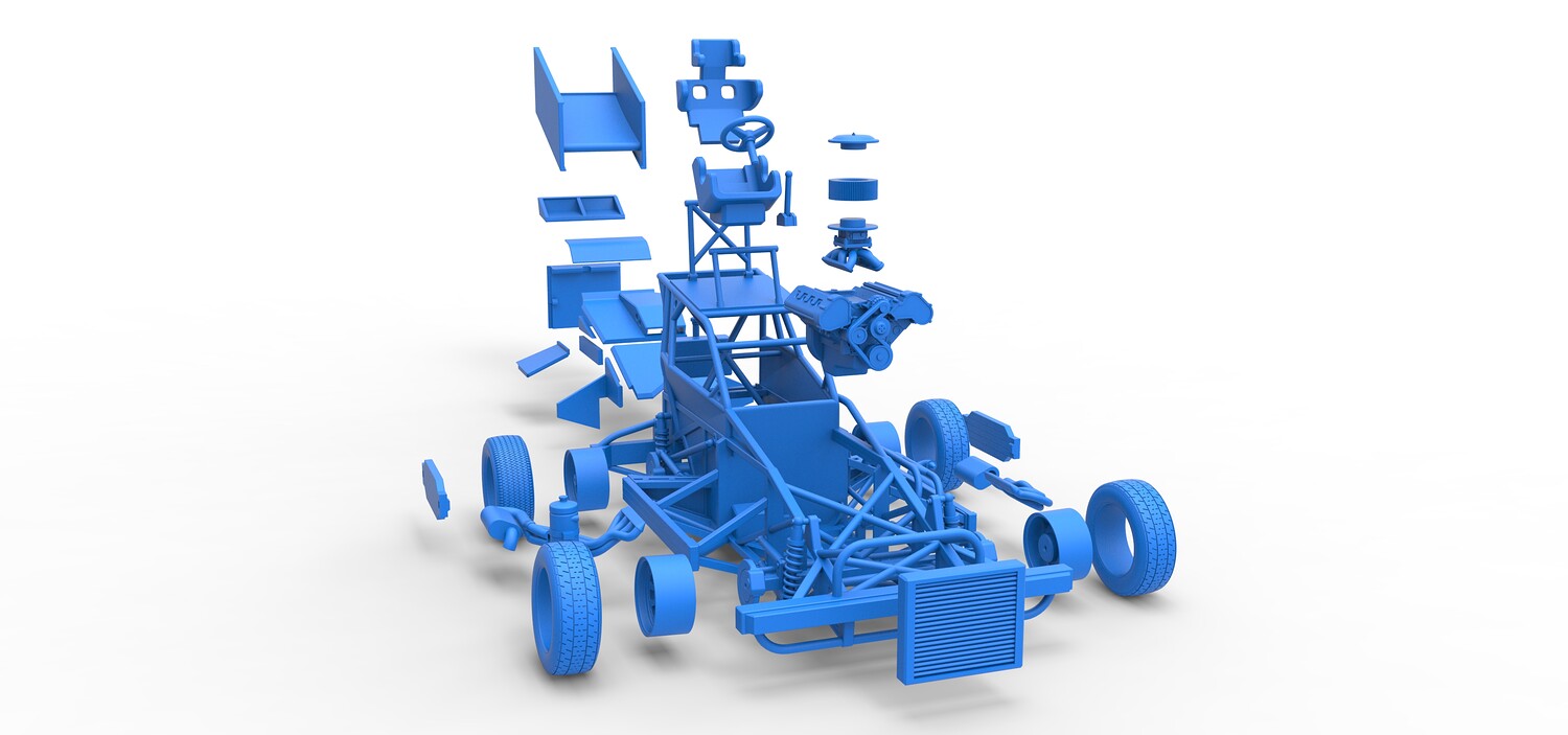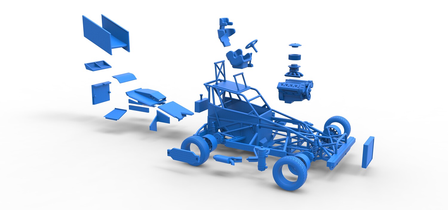 The model consists of parts: Air filter cap, Air filter, Air intake, Engine, Frame, Front rims, Fuel tank, Hood, Left exhaust part 1-3, Oil tank, Radiator, Rear right tire, Rear rims, Rear wheel guards, Right exhaust part 1,2, Seat part 1,2, Shell front part, Shell left part 1-4, Shell rear part, Shell right part 1-4, Shifter, Spoiler, Steering wheel, Tires, Top wing, Visor.
