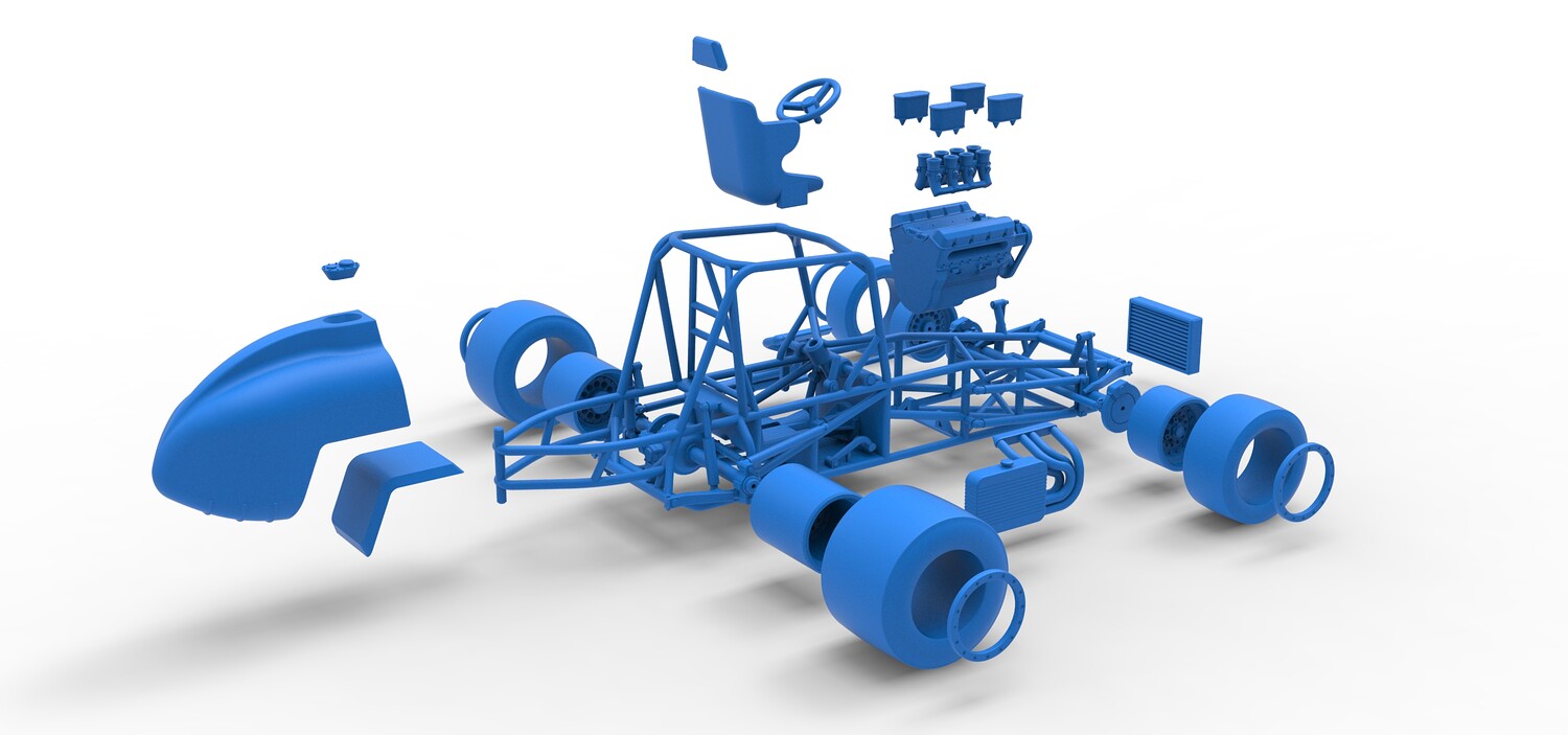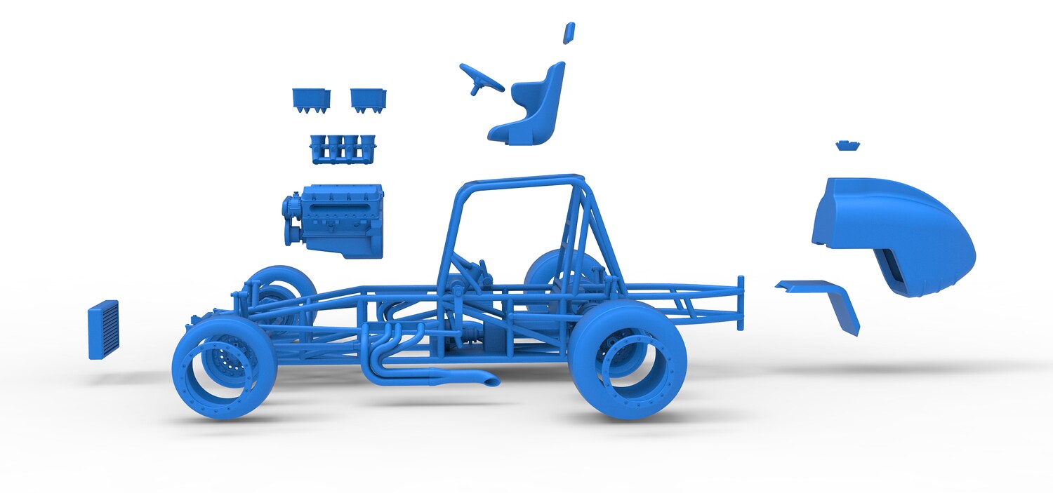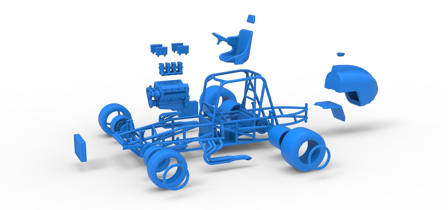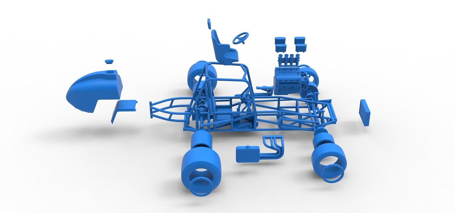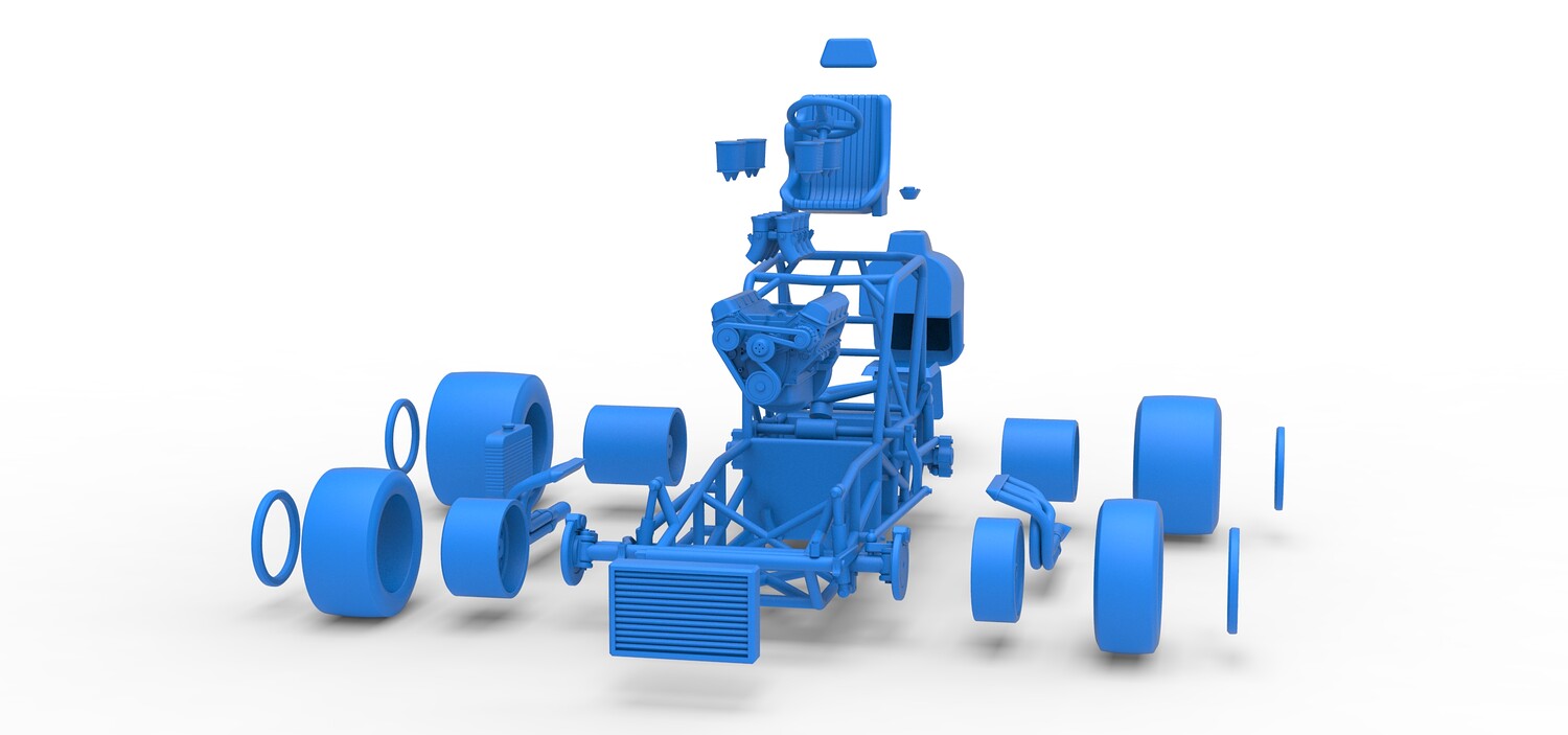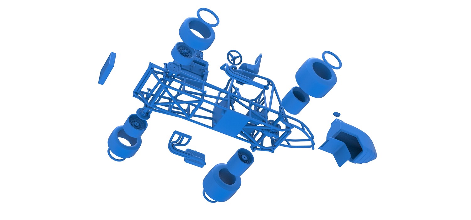 The model consists of parts: Air filters, Air intake, Beadlock rings, Engine, Frame, Front left rim, Front left tire, Front right rim, Front right tire, Fuel tank bottom plate, Fuel tank insert, Fuel tank, Headrest, Left exhaust, Oil tank, Radiator, Rear left rim, Rear left tire, Rear right rim, Rear right tire, Right exhaust, Seat, Steering wheel.