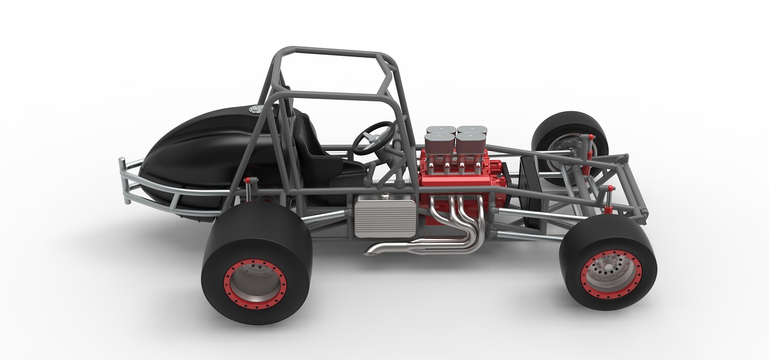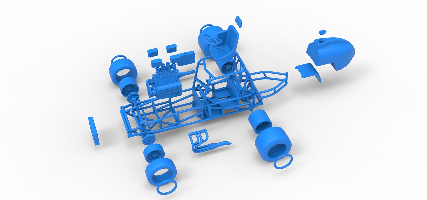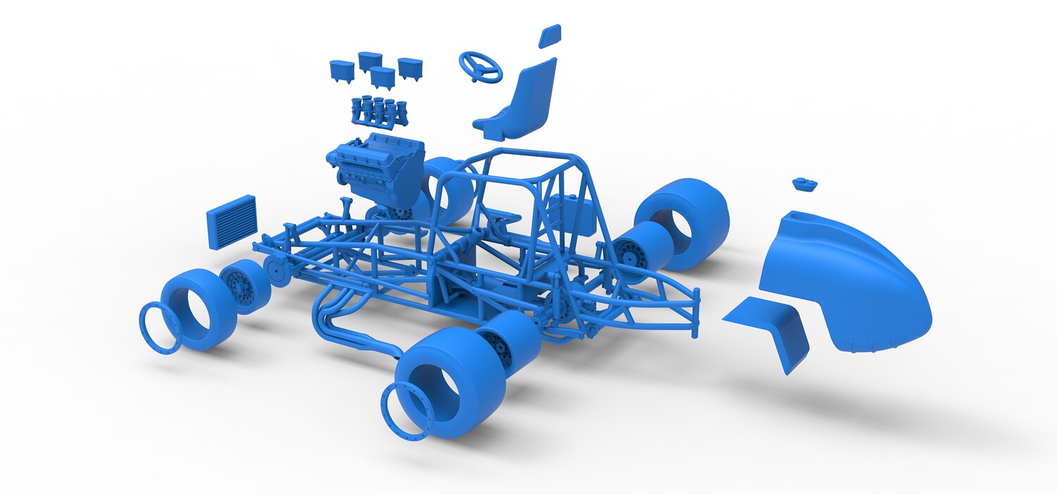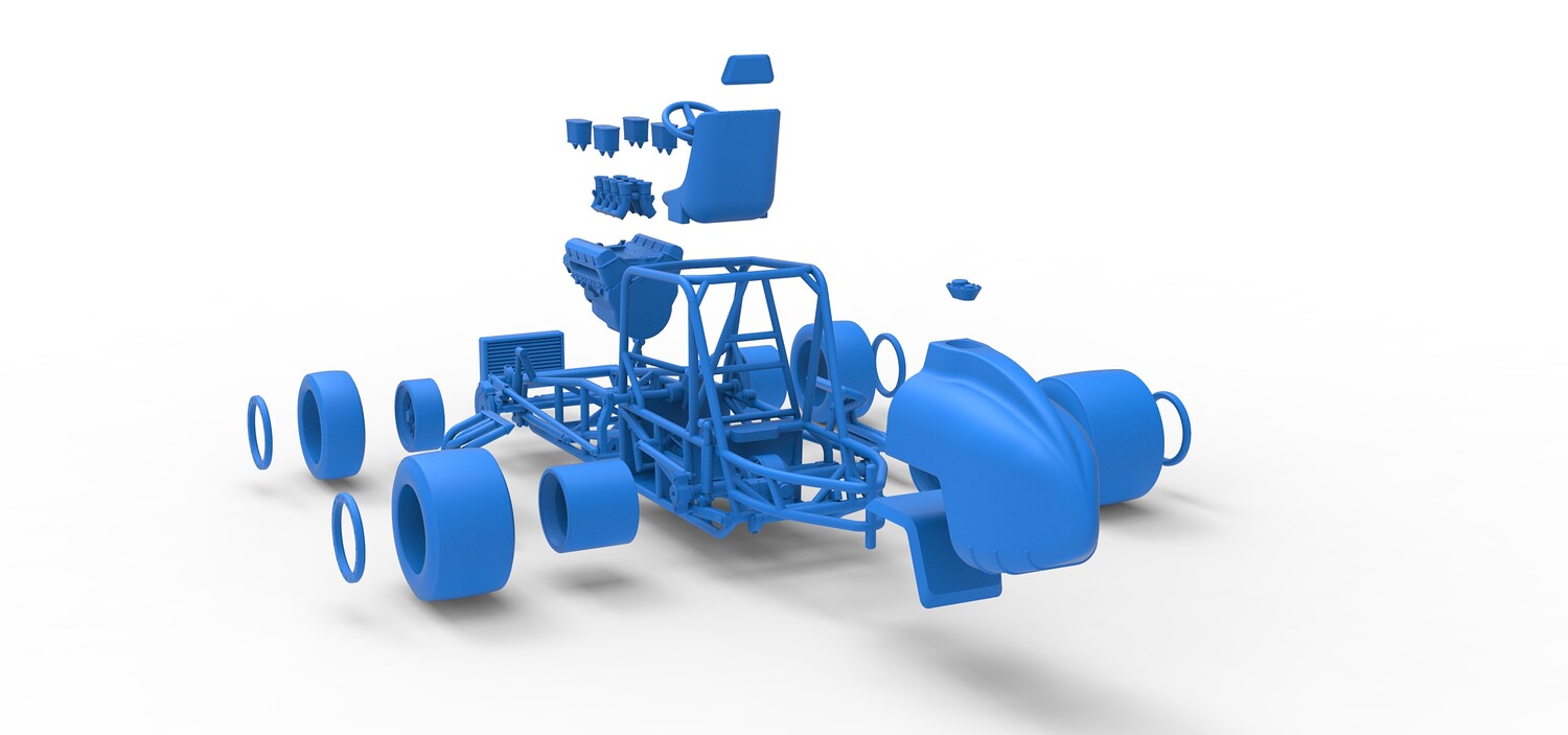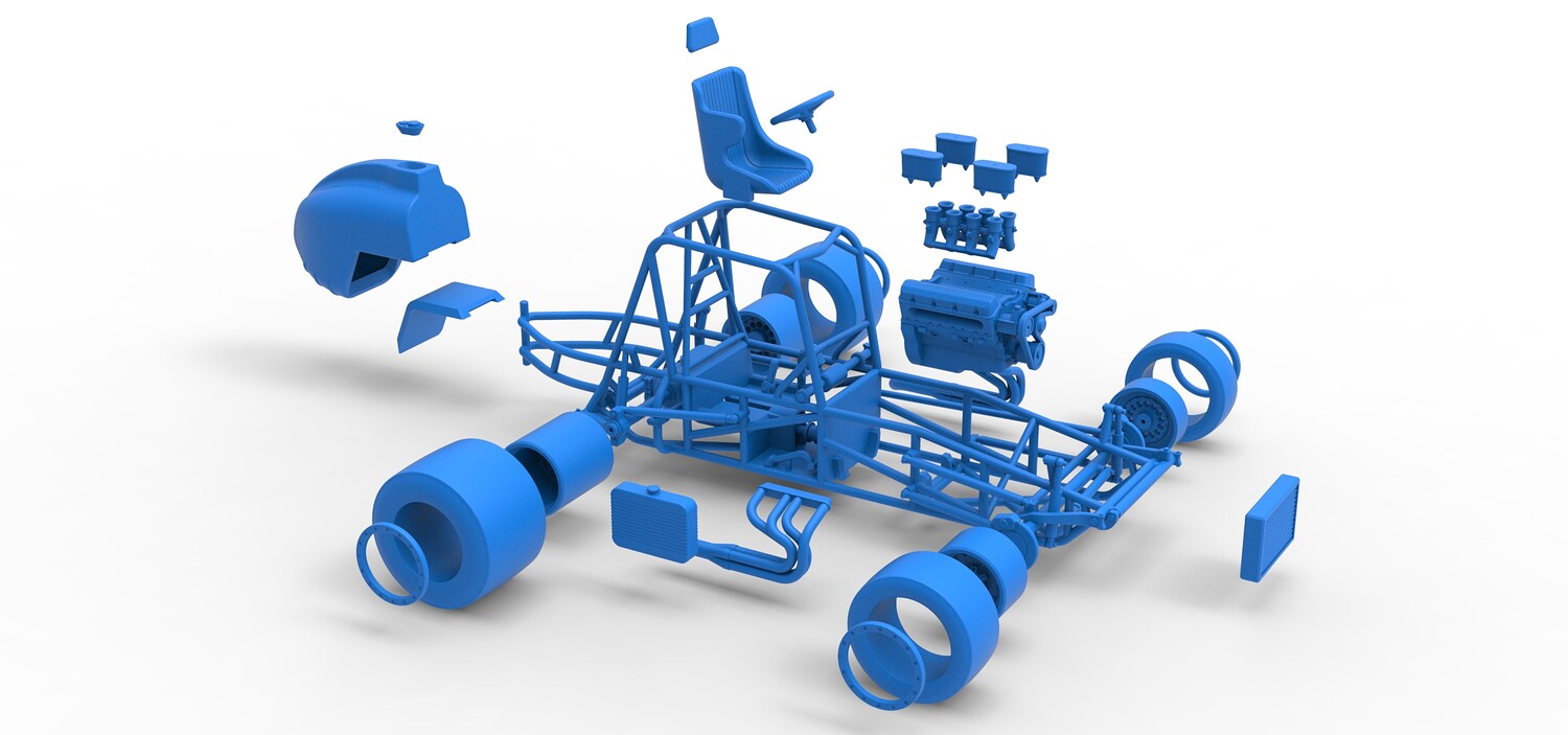 The model consists of parts: Air filters, Air intake, Beadlock rings, Engine, Frame, Front left rim, Front left tire, Front right rim, Front right tire, Fuel tank bottom plate, Fuel tank insert, Fuel tank, Headrest, Left exhaust, Oil tank, Radiator, Rear left rim, Rear left tire, Rear right rim, Rear right tire, Right exhaust, Seat, Steering wheel.