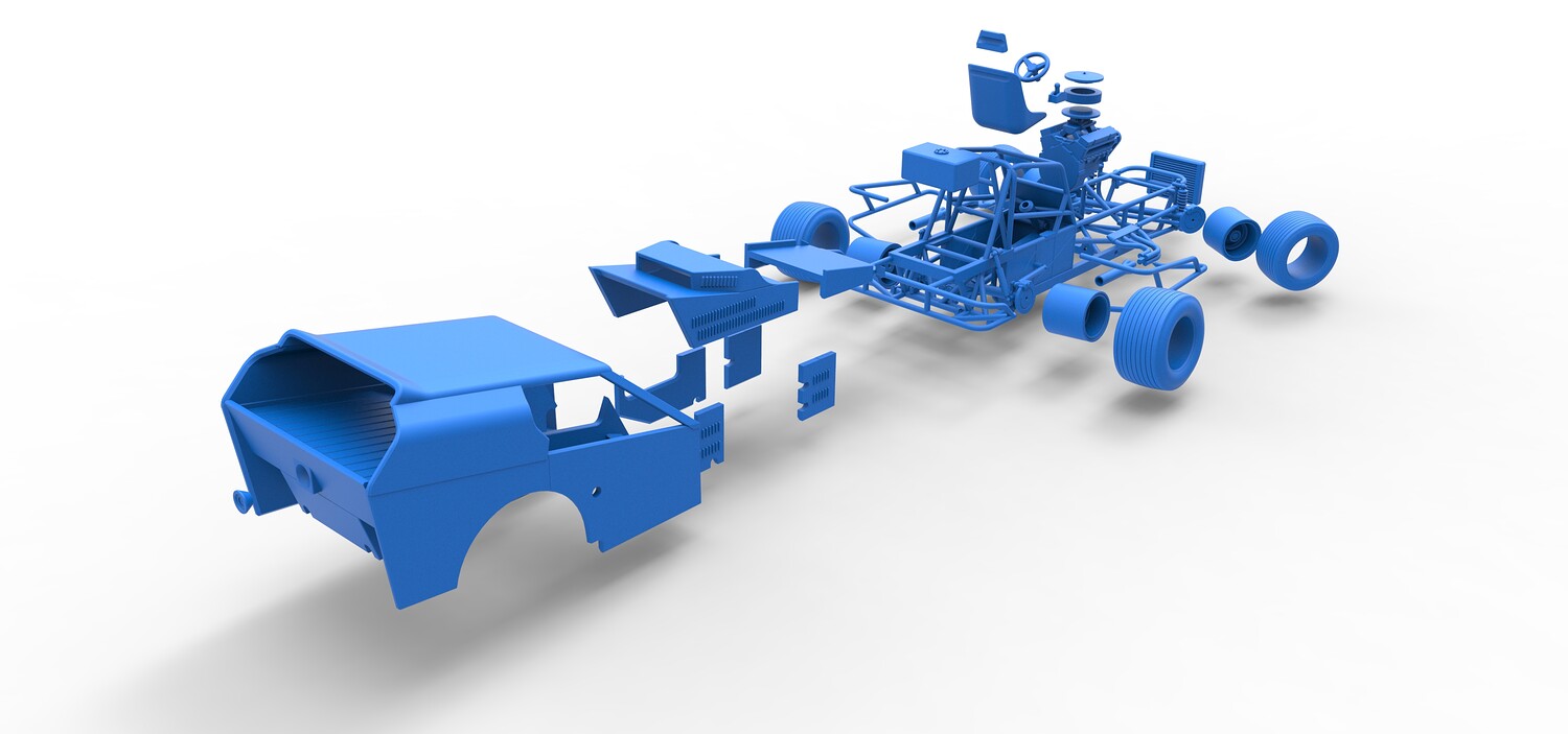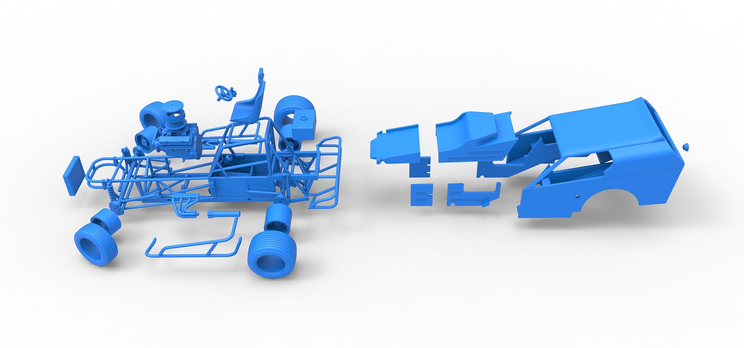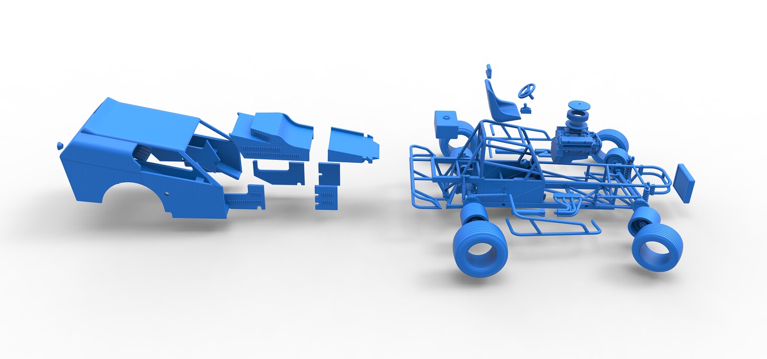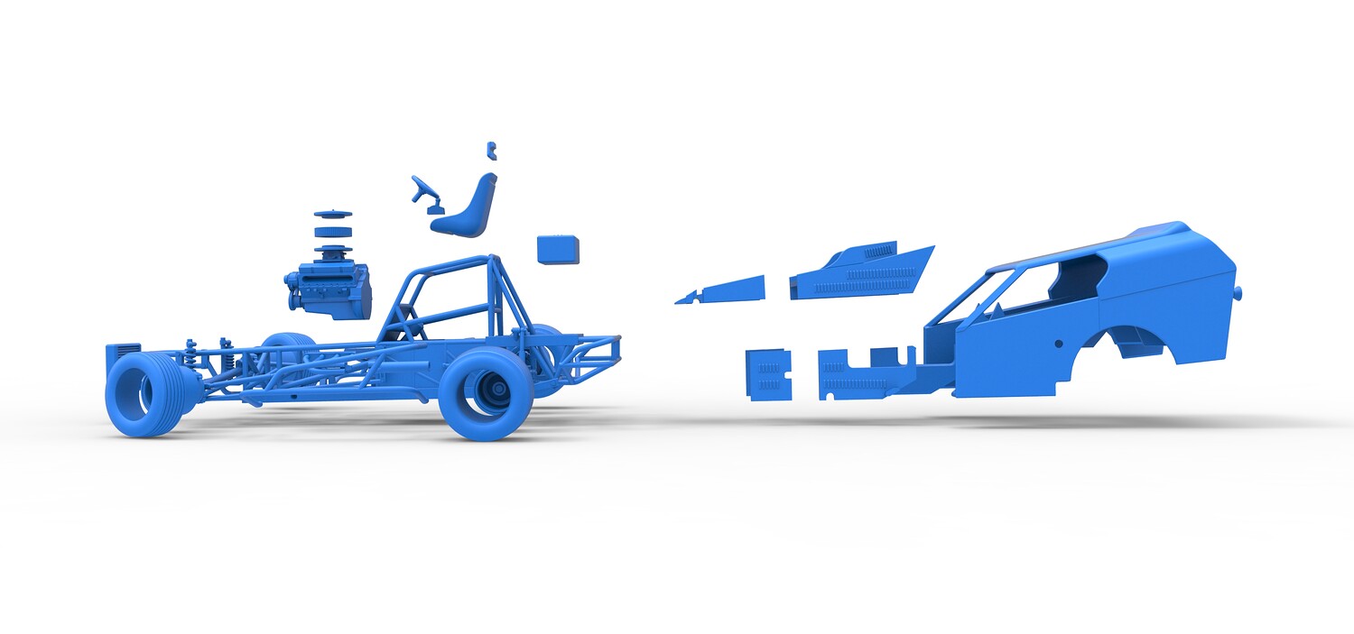 The model consists of parts: Air filter cap, Air filter, Engine, Exhaust pipes, Frame, Front left rim, Front left tire, Front right rim, Front right tire, Fuel cap, Headrest, Hood, Left bumper, Left header, Nose, Radiator, Rear left tire, Rear right tire, Rear rims, Right bumper, Right header, Seat, Shell left part 1,2, Shell main part, Shell right part, Shifter, Steering wheel, Tank.