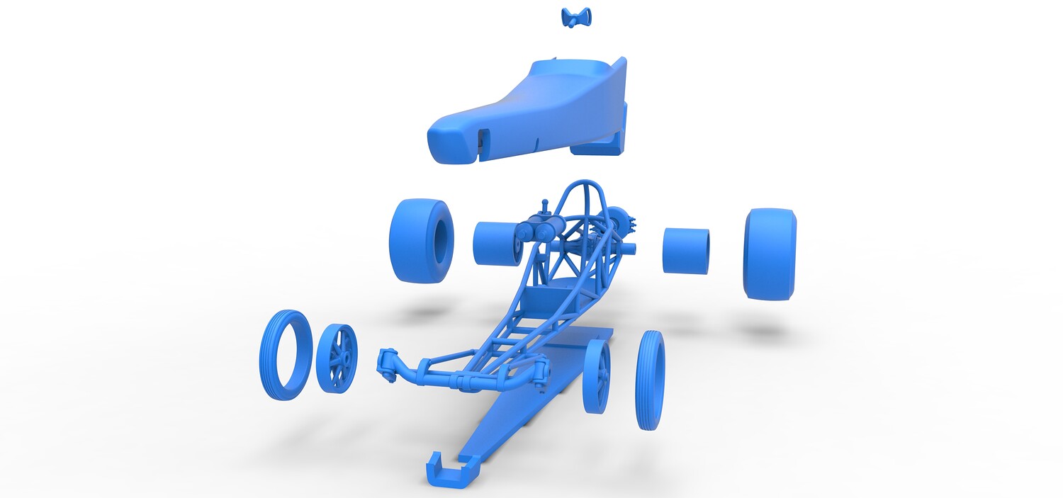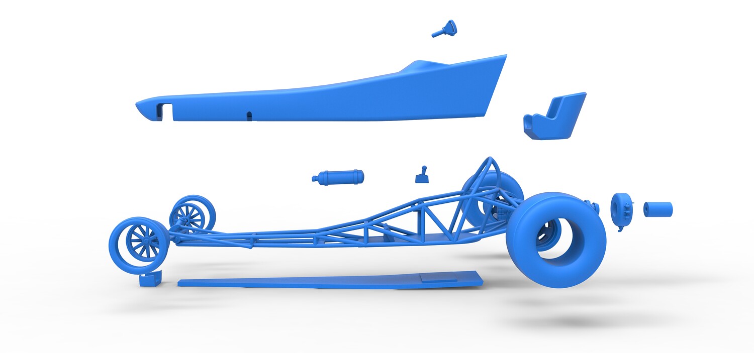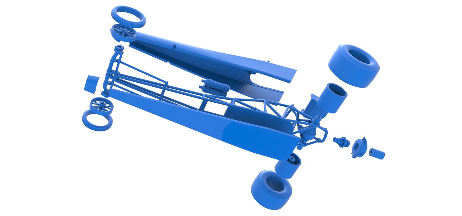 The model consists of parts: Body, Combustion chamber, Exhaust pipe, Front rims, Front tires, Rear rims, Rear tires, Reductor, Seat, Shell part 1-3, Shifter, Steering wheel, Tank.