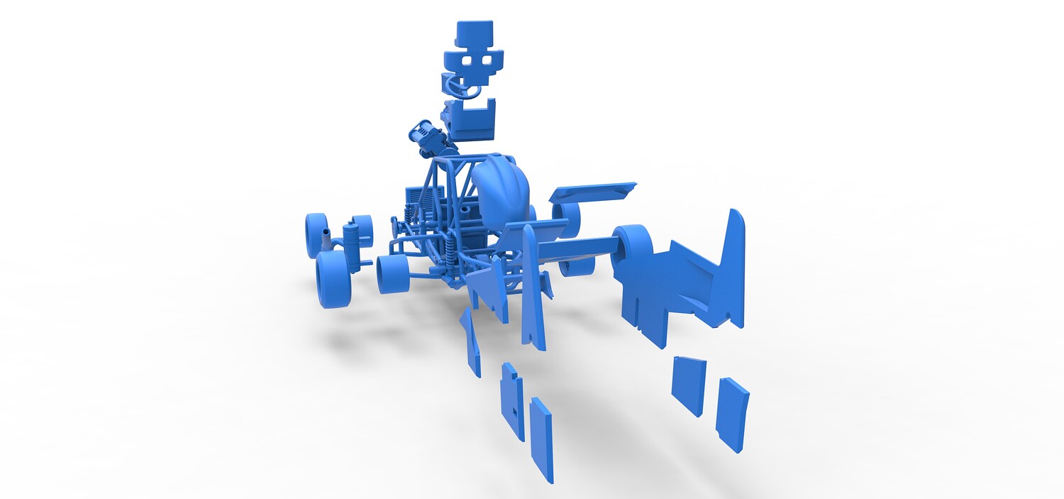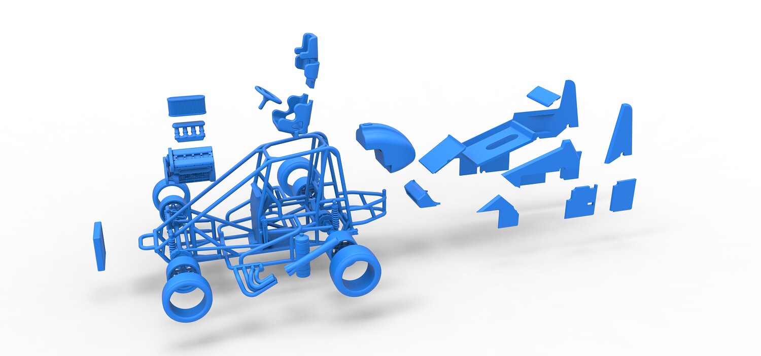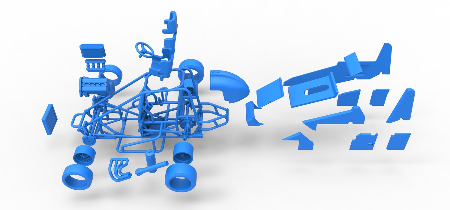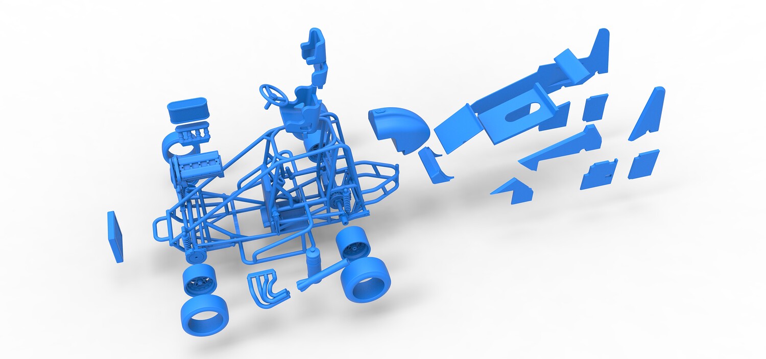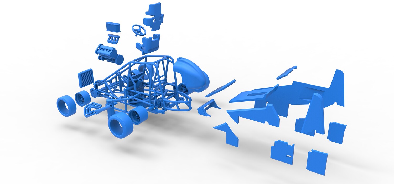 The model consists of parts: Air filter, Air intake, Body, Engine, Exhaust pipes part 1,2, Front rims, Front tires, Fuel tank, Oil tank, Radiator, Rear left rim, Rear left tire, Rear right rim, Rear right tire, Seat part 1,2, Shell central part 1-4, Shell left part 1-5, Shell right part 1-3, Steering wheel.