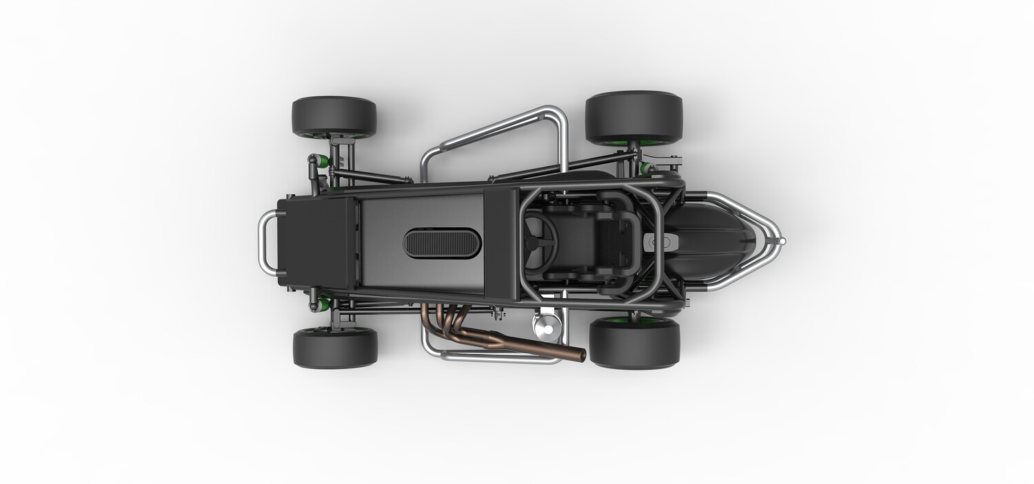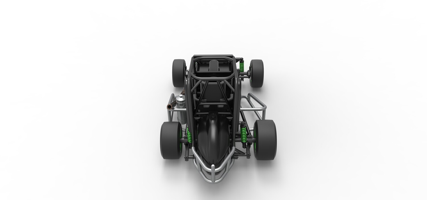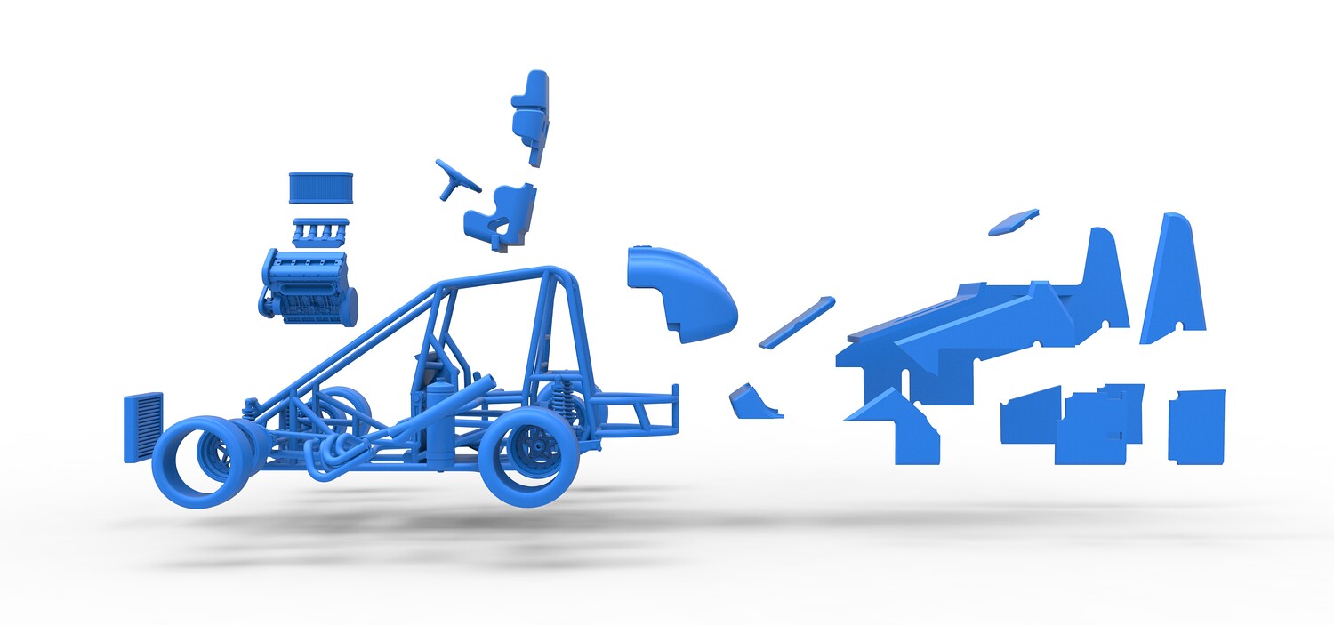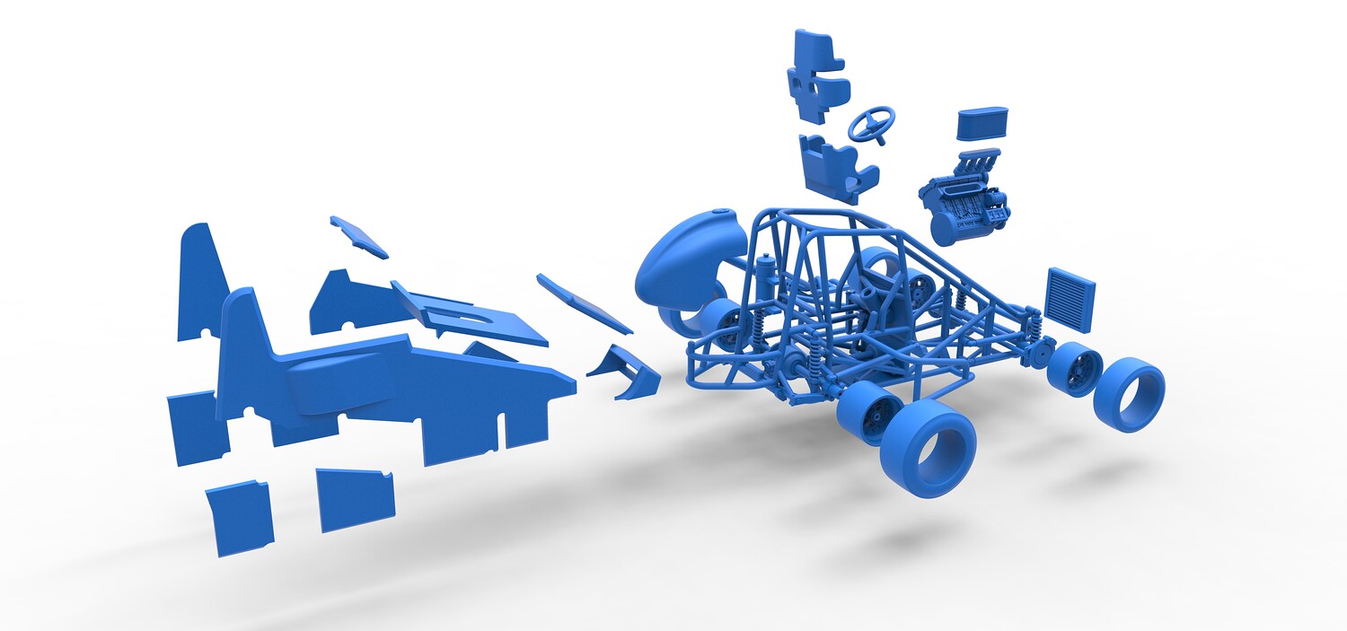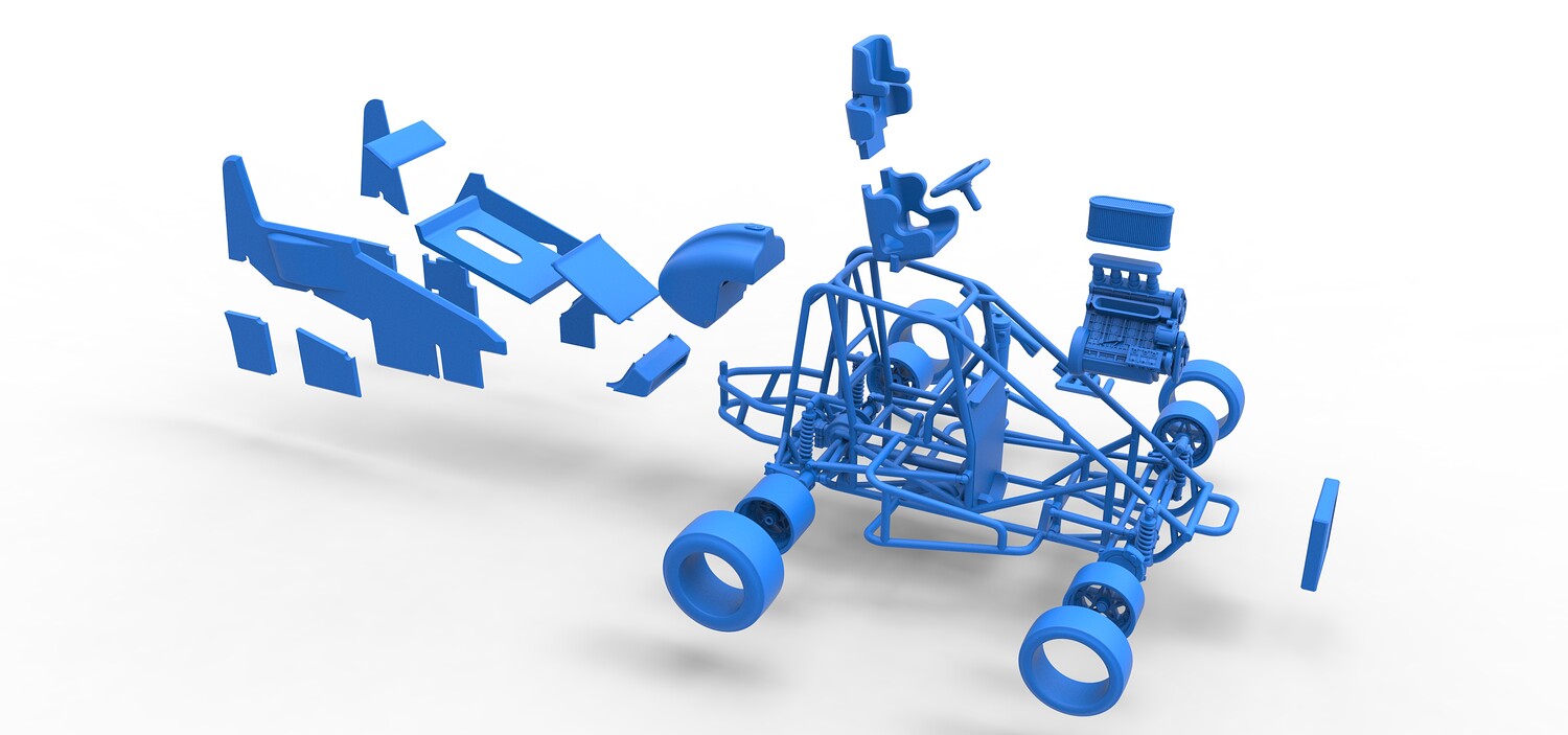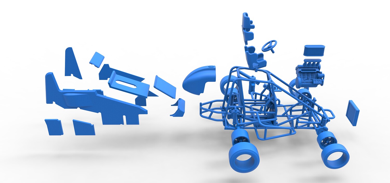 The model consists of parts: Air filter, Air intake, Body, Engine, Exhaust pipes part 1,2, Front rims, Front tires, Fuel tank, Oil tank, Radiator, Rear left rim, Rear left tire, Rear right rim, Rear right tire, Seat part 1,2, Shell central part 1-4, Shell left part 1-5, Shell right part 1-3, Steering wheel.