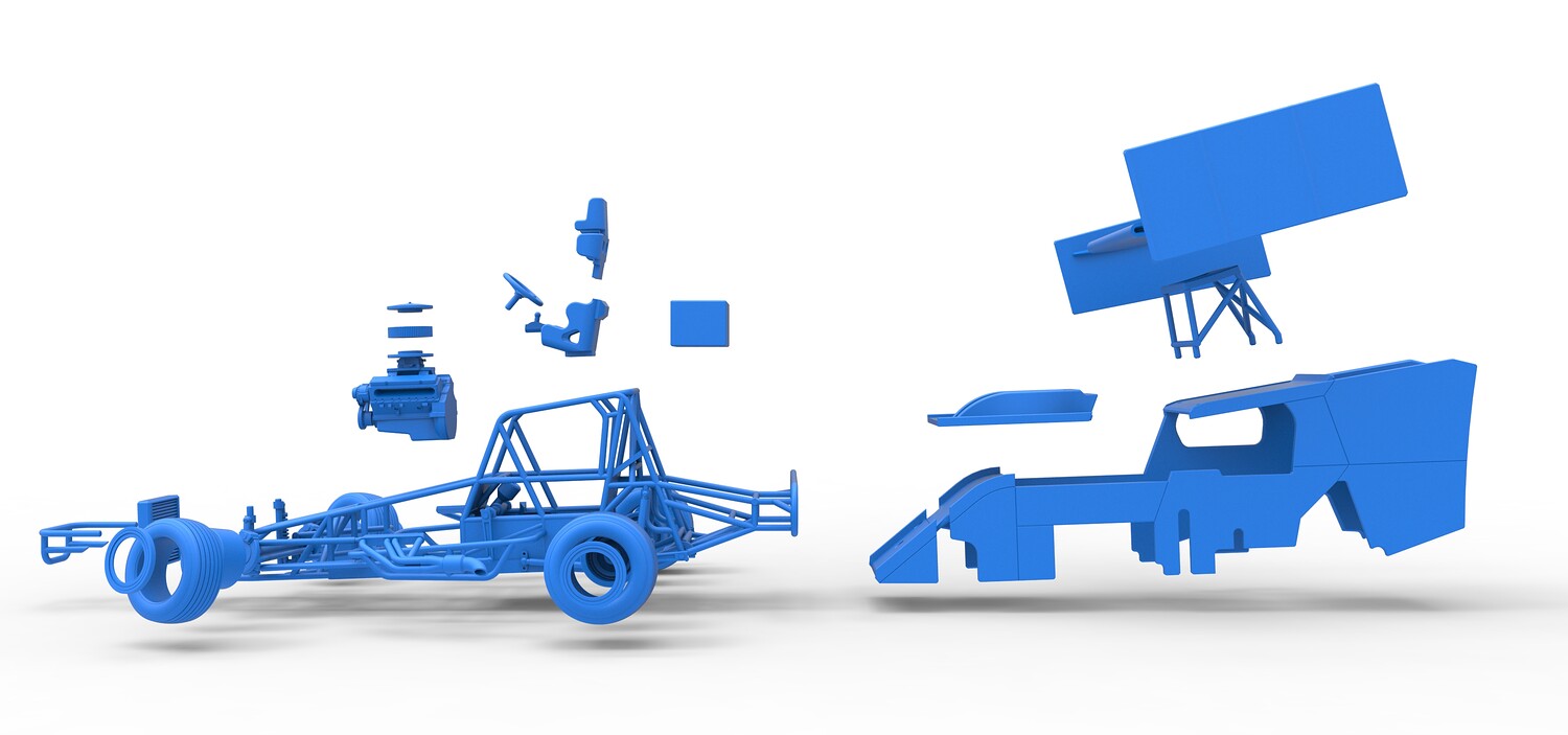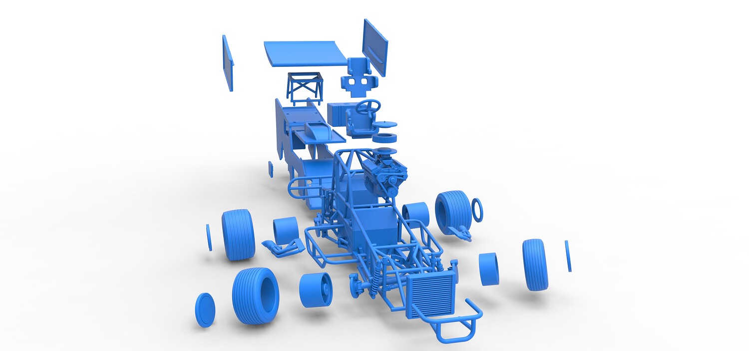 The model consists of parts: Air filter cap, Air filter, Beadlock rings with covers, Beadlock rings, Engine, Frame, Front bumper, Front left rim, Front left tire, Front right rim, Front right tire, Hood, Left exhaust, Radiator, Rear left tire, Rear right tire, Rear rims, Right exhaust, Seat part 1,2, Shell, Shifter, Side shell plate, Steering wheel, Tank, Top wing central part, Top wing left part, Top wing mount, Top wing right part.