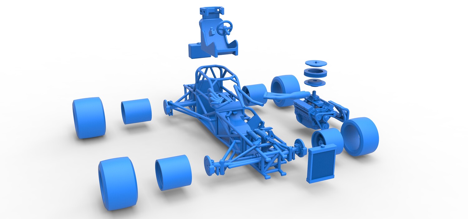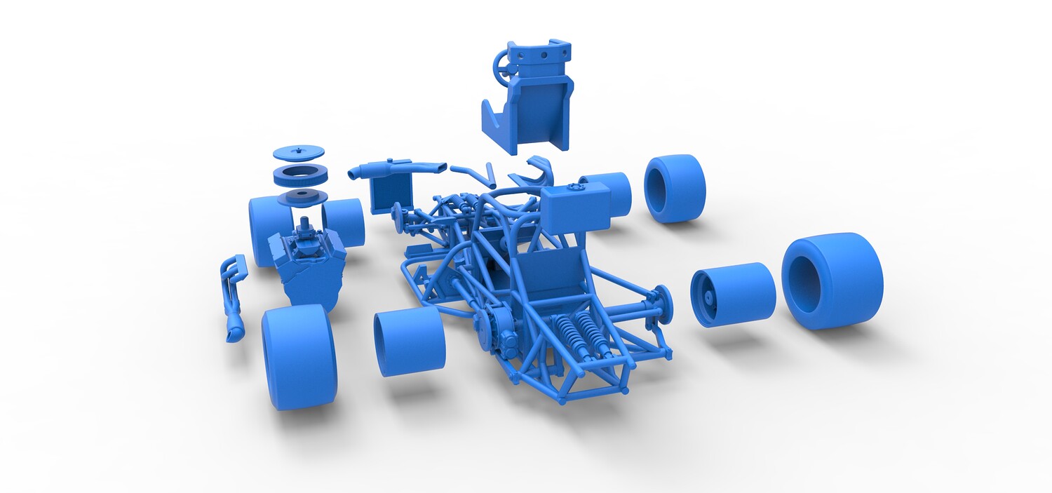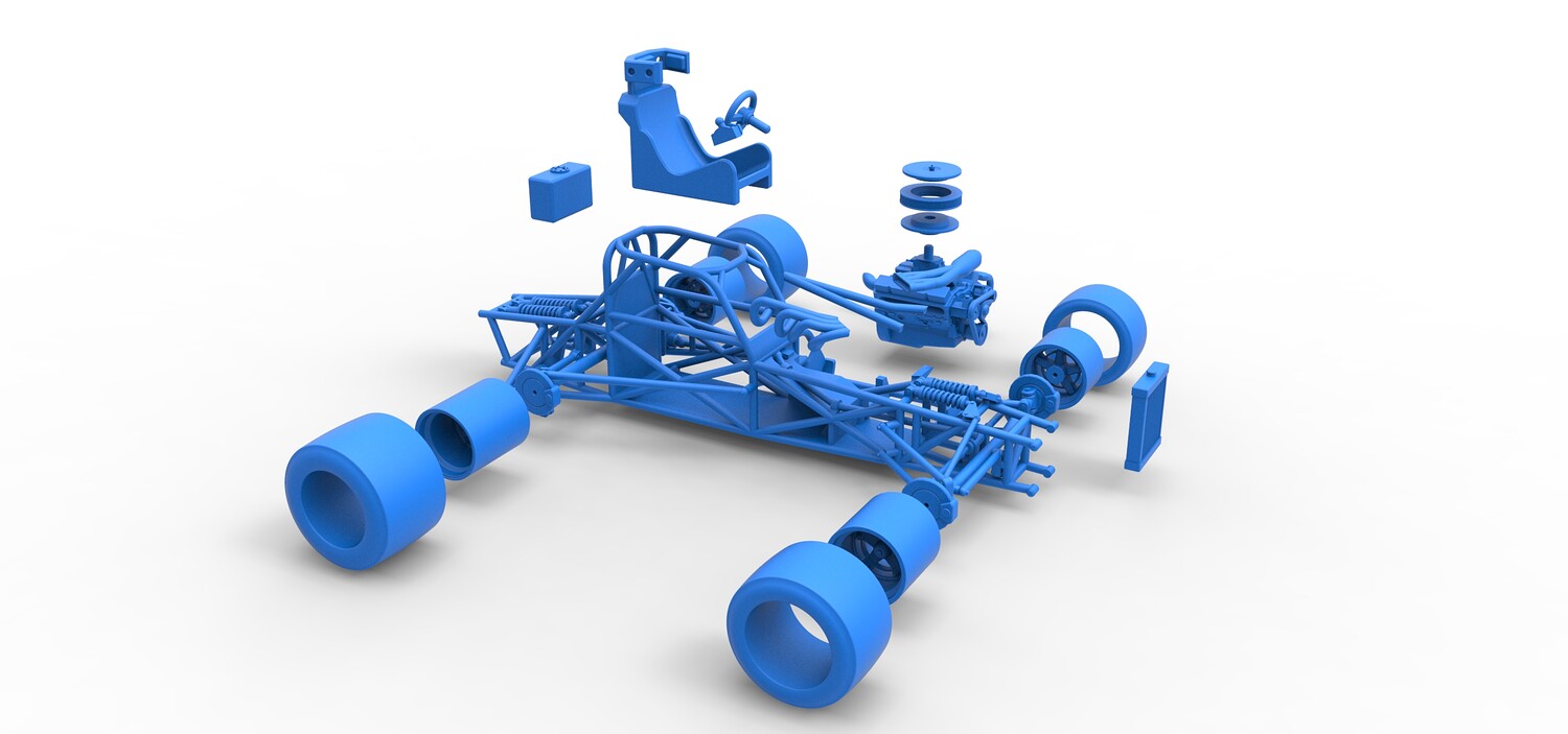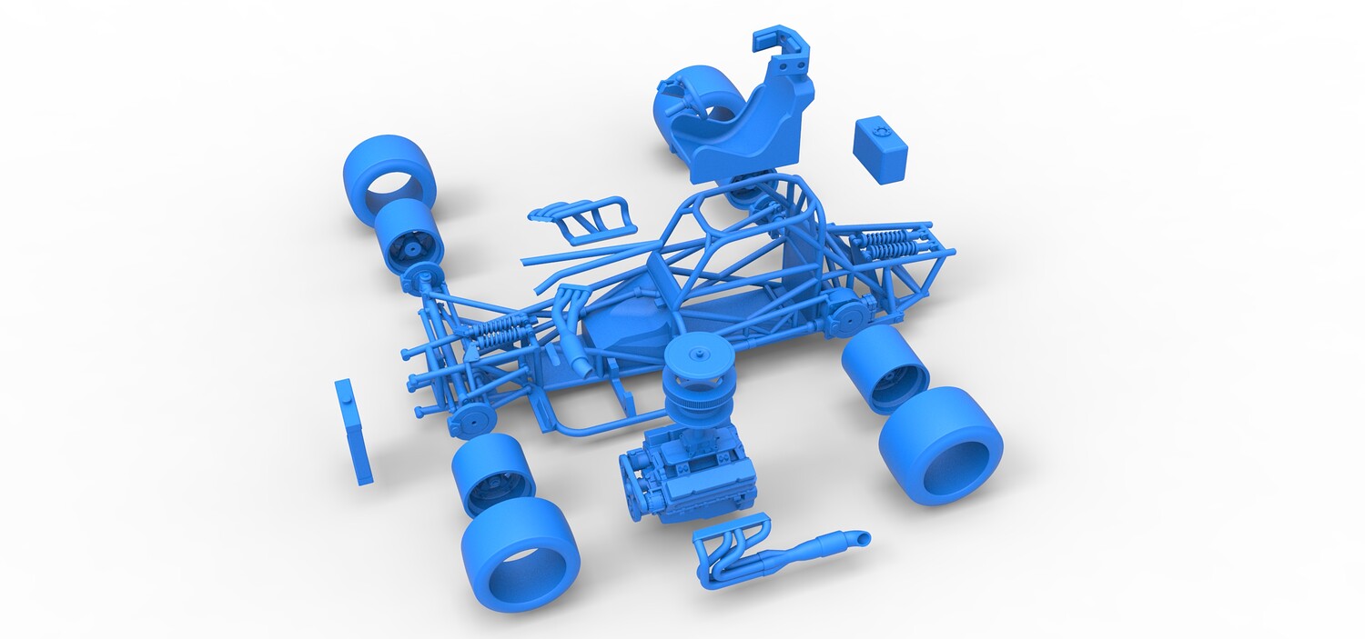 The model consists of parts: Air filter part 1-3, Engine, Frame, Front left rim, Front left tire, Front right rim, Front right tire, Left exhaust, Radiator, Rear left rim, Rear left tire, Rear right rim, Rear right tire, Right exhaust part 1,2, Seat, Shifter, Spacer, Steering wheel, Tank.