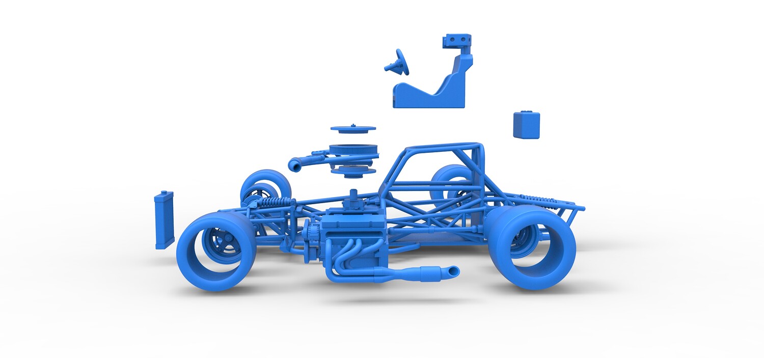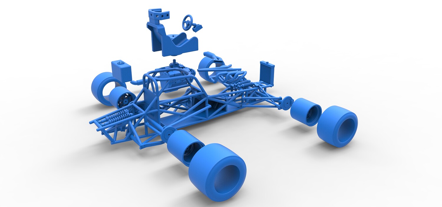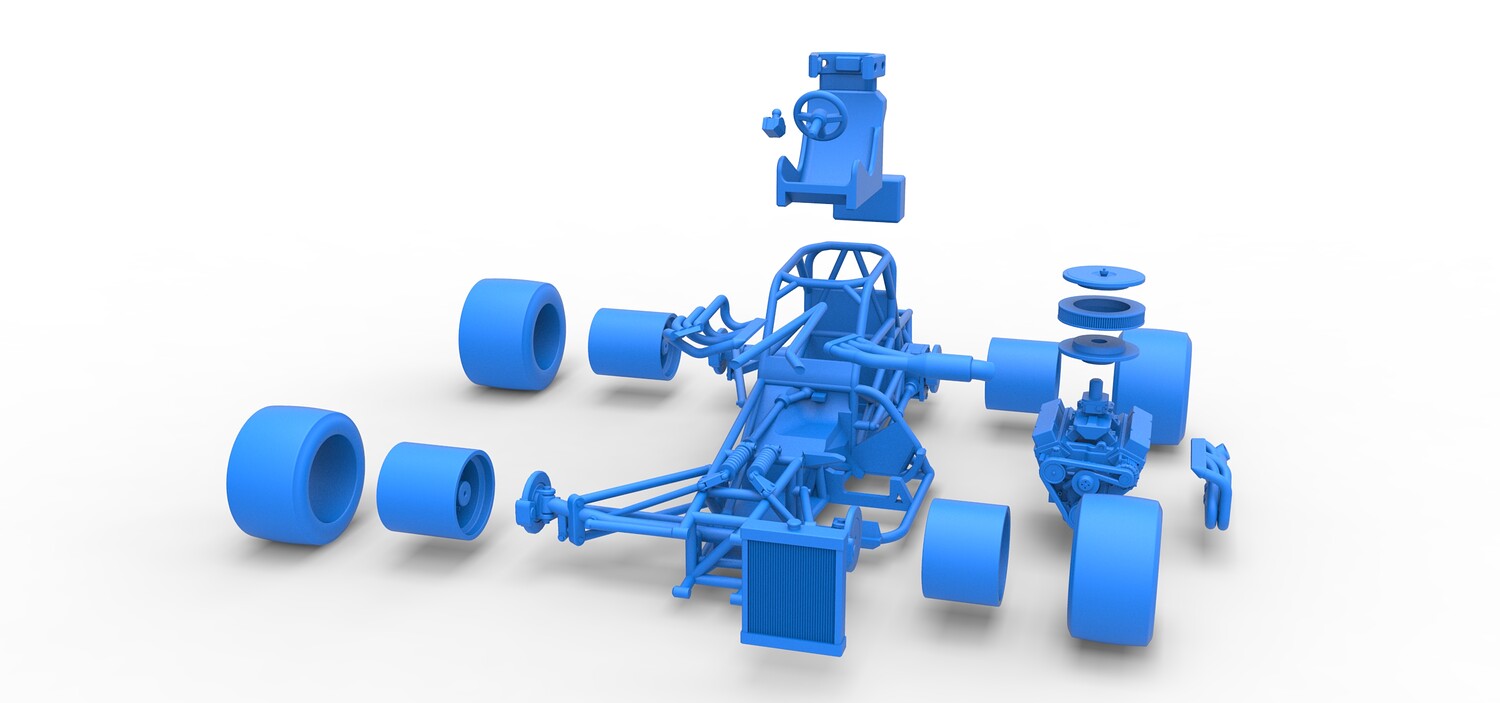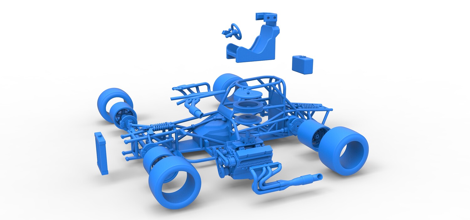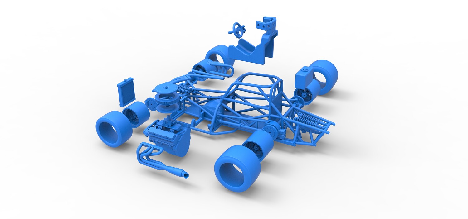 The model consists of parts: Air filter part 1-3, Engine, Frame, Front left rim, Front left tire, Front right rim, Front right tire, Left exhaust, Radiator, Rear left rim, Rear left tire, Rear right rim, Rear right tire, Right exhaust part 1,2, Seat, Shifter, Spacer, Steering wheel, Tank.