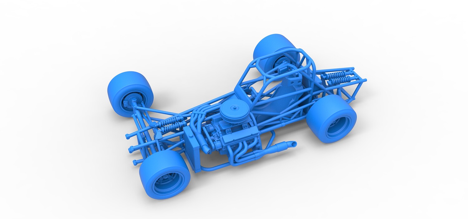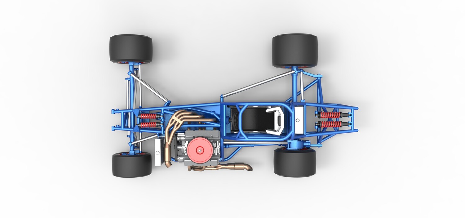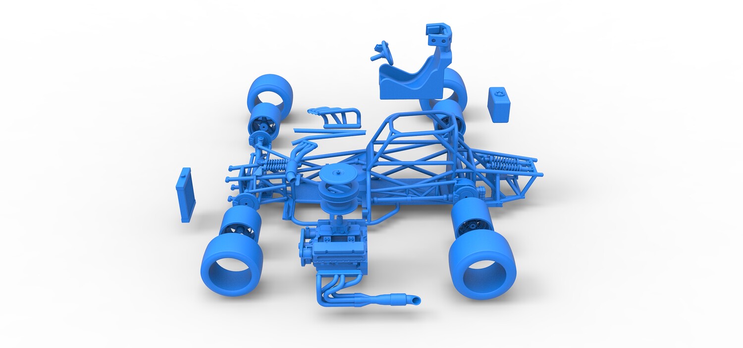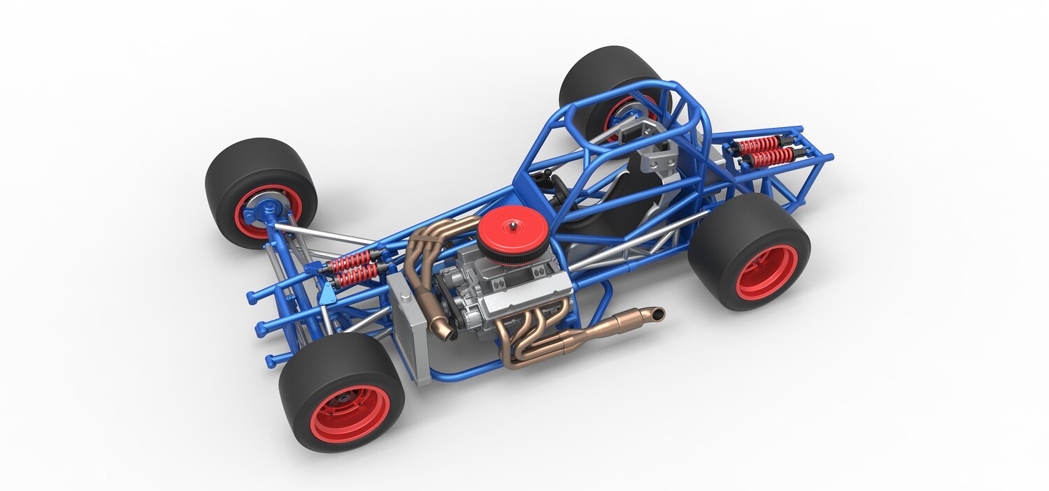 The model consists of parts: Air filter part 1-3, Engine, Frame, Front left rim, Front left tire, Front right rim, Front right tire, Left exhaust, Radiator, Rear left rim, Rear left tire, Rear right rim, Rear right tire, Right exhaust part 1,2, Seat, Shifter, Spacer, Steering wheel, Tank.