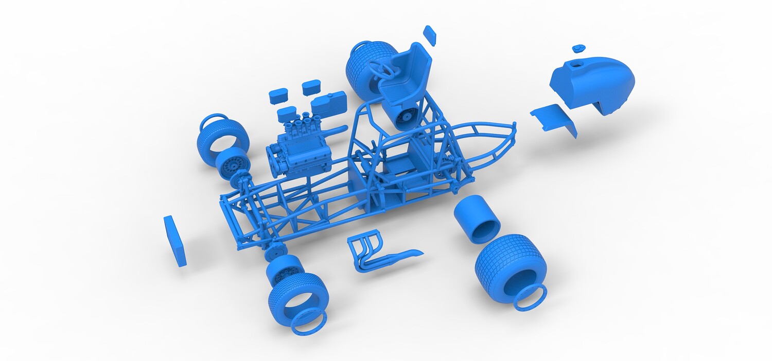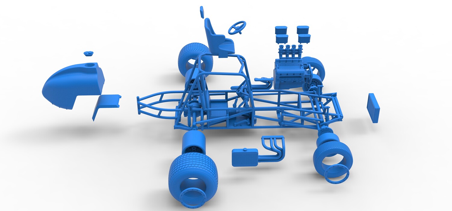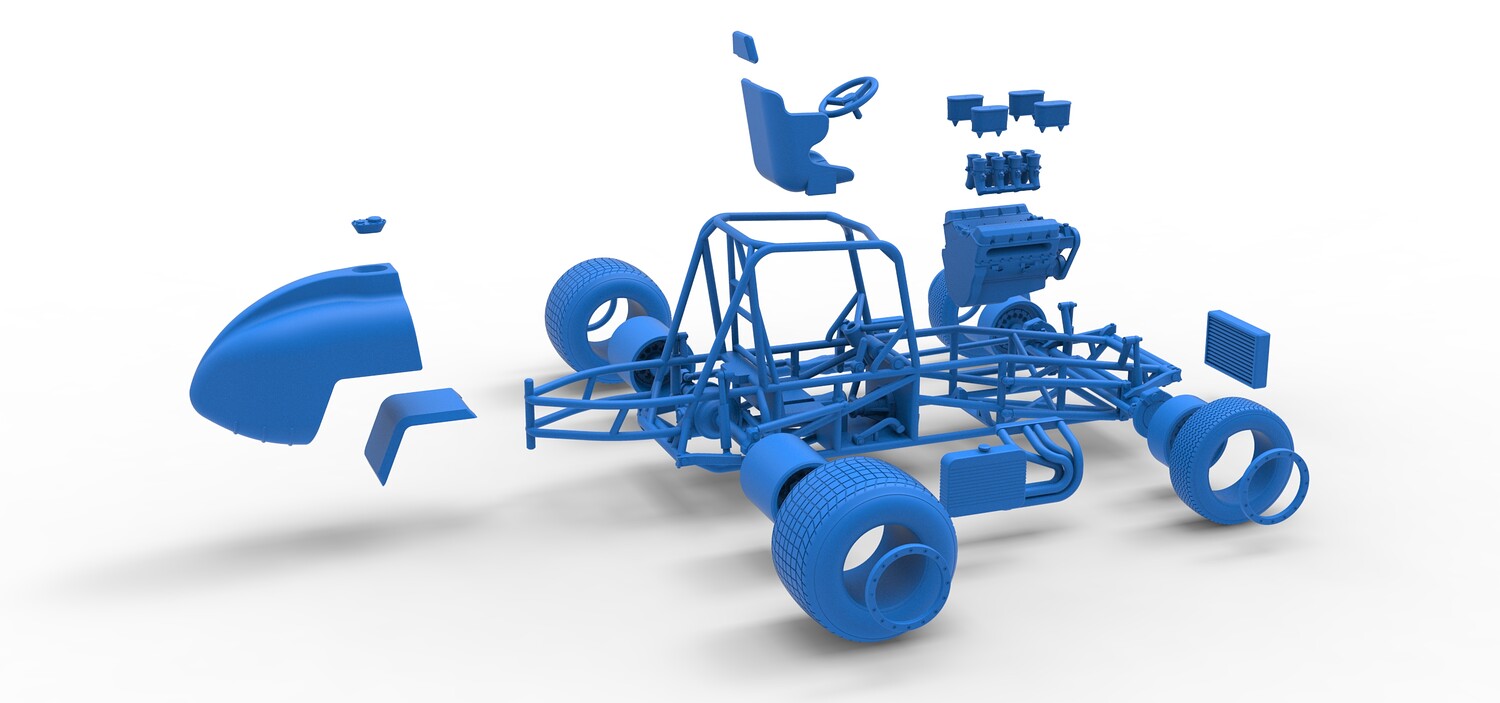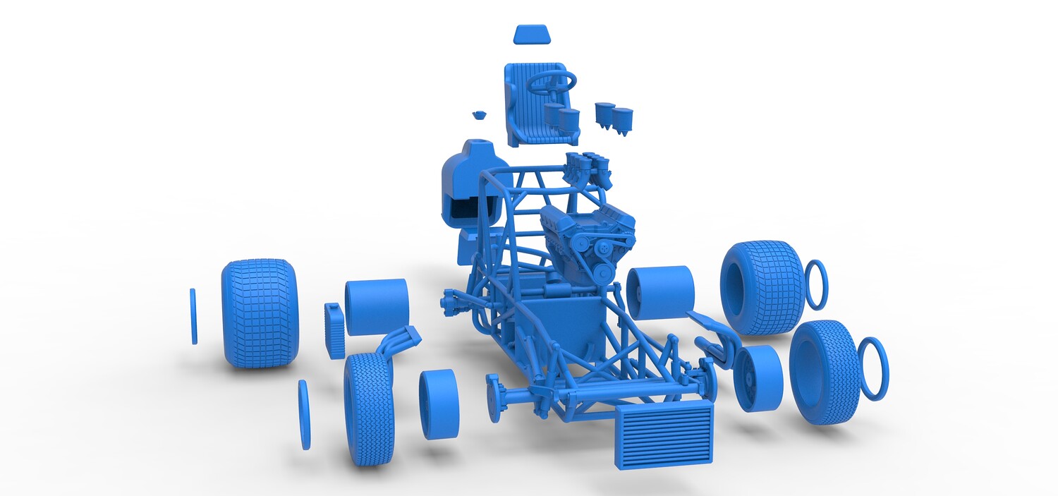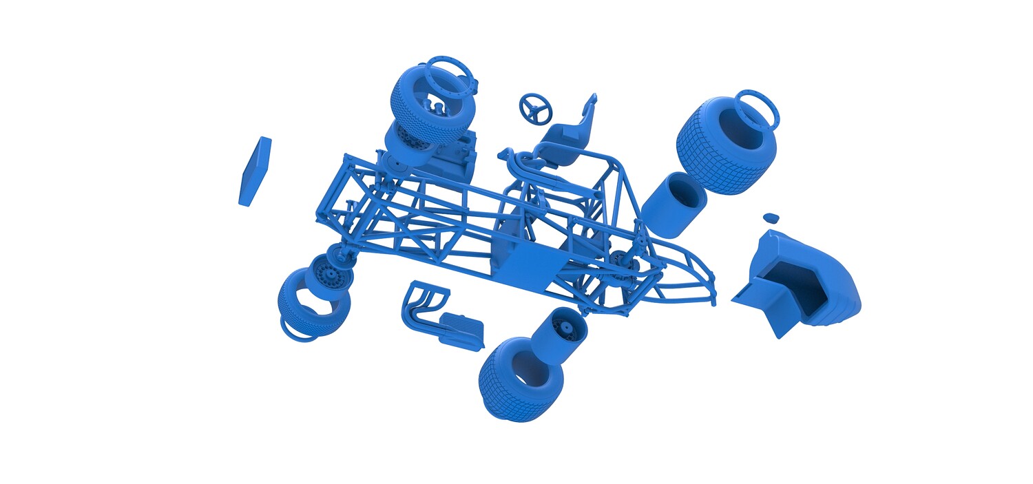 The model consists of parts: Air filters, Air intake, Beadlock rings, Engine, Frame, Front rims, Front tires, Fuel tank bottom plate, Fuel tank insert, Fuel tank, Headrest, Left exhaust, Oil tank, Radiator, Rear left tire, Rear right tire, Rear rims, Right exhaust, Seat, Steering wheel.