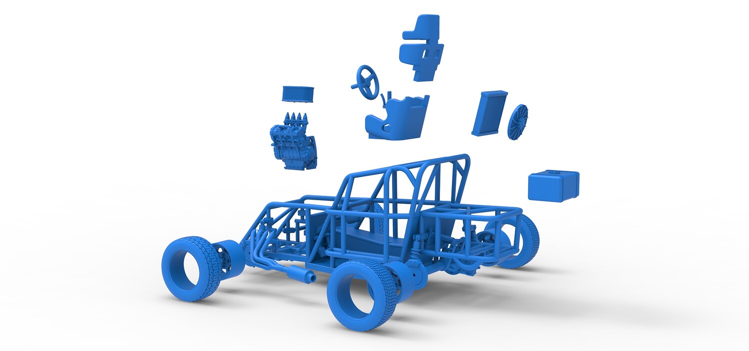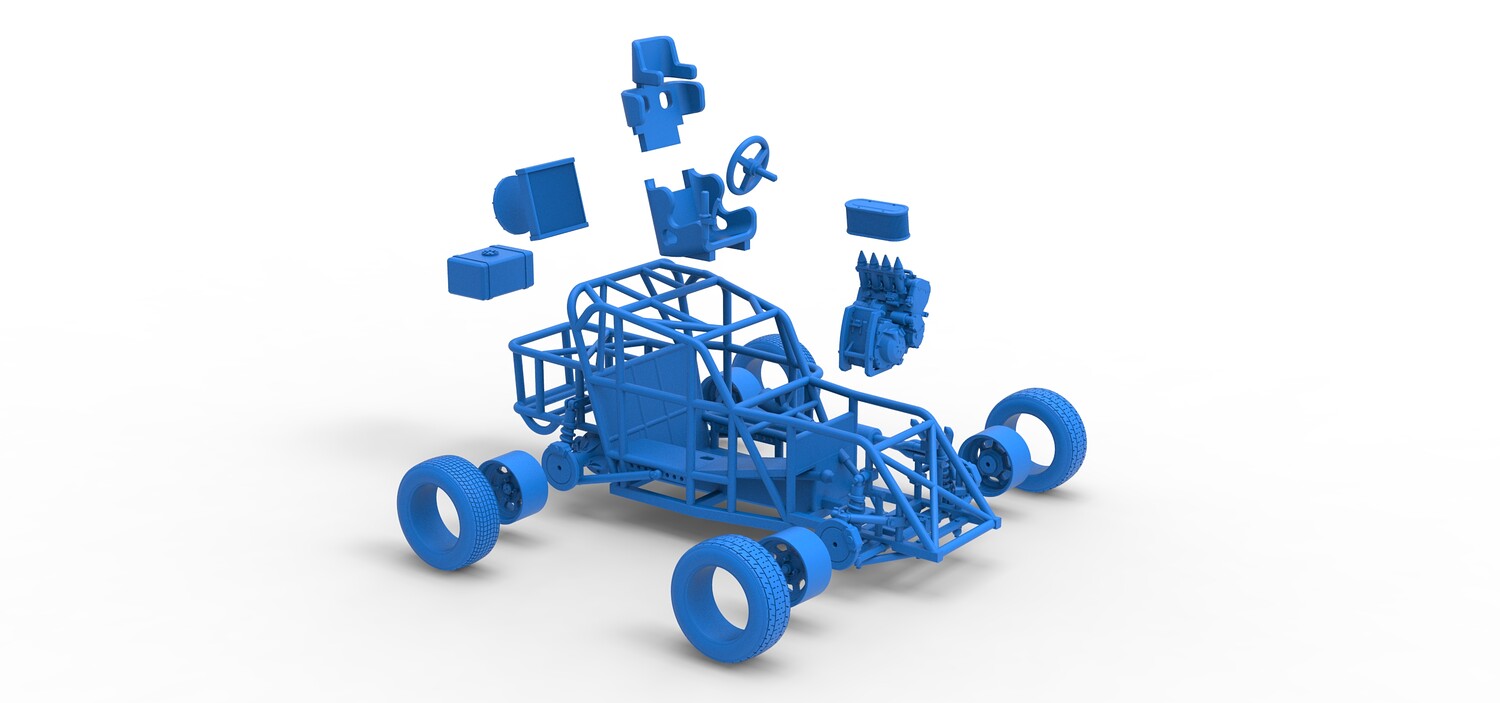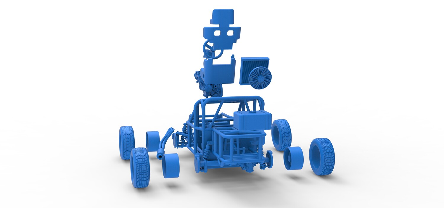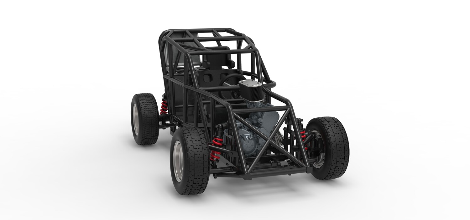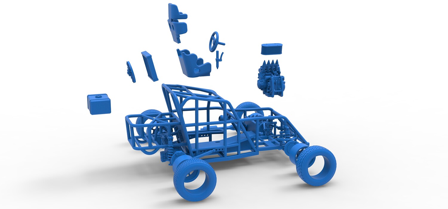 The model consists of parts: Air filter, Engine, Exhaust, Fan, Frame, Front rims, Front tires, Radiator, Rear rims, Rear tires, Seat part 1,2, Shifter, Steering wheel, Tank.