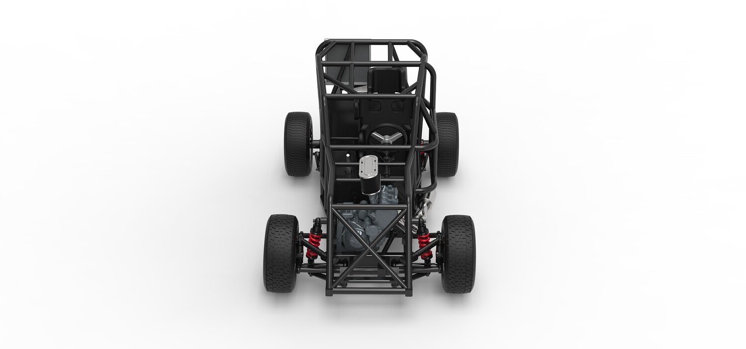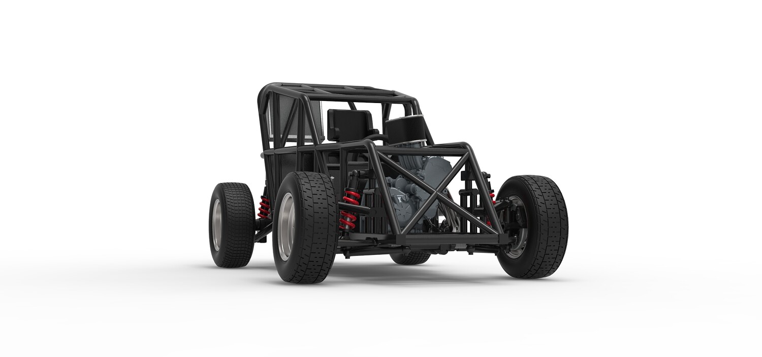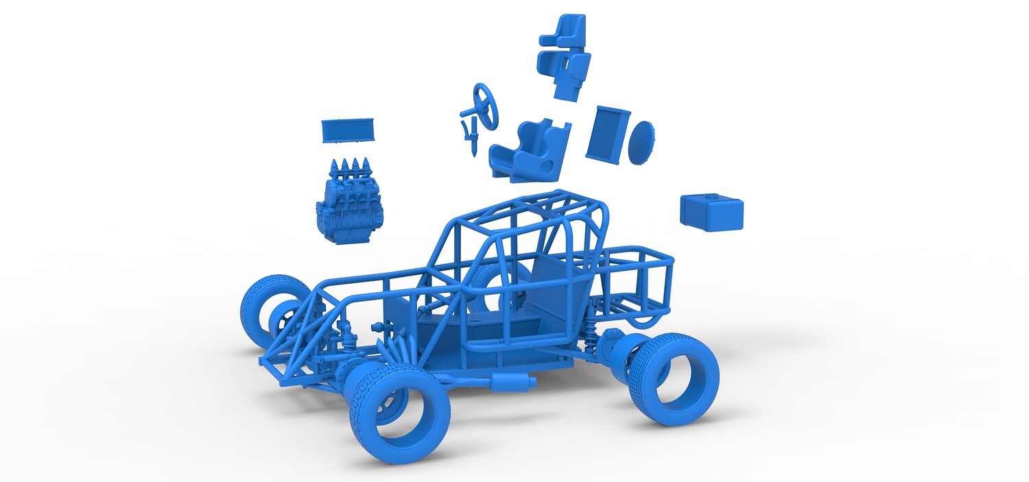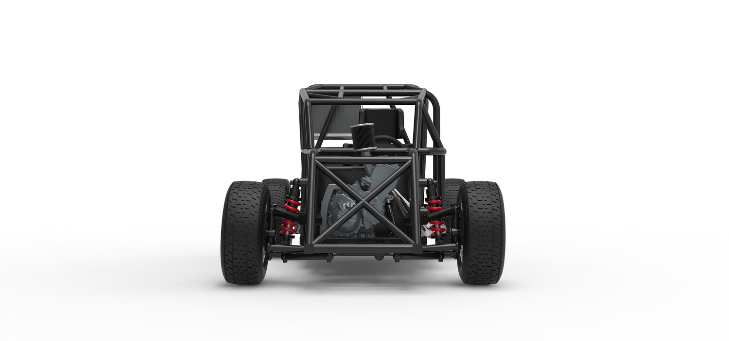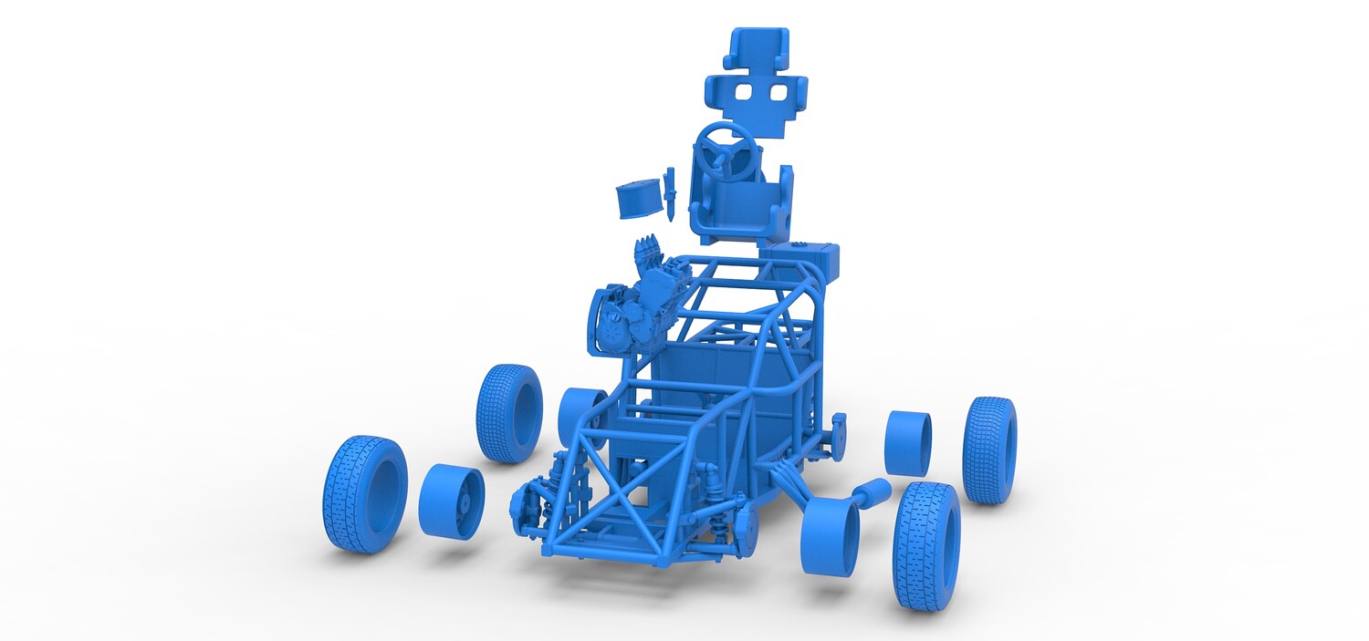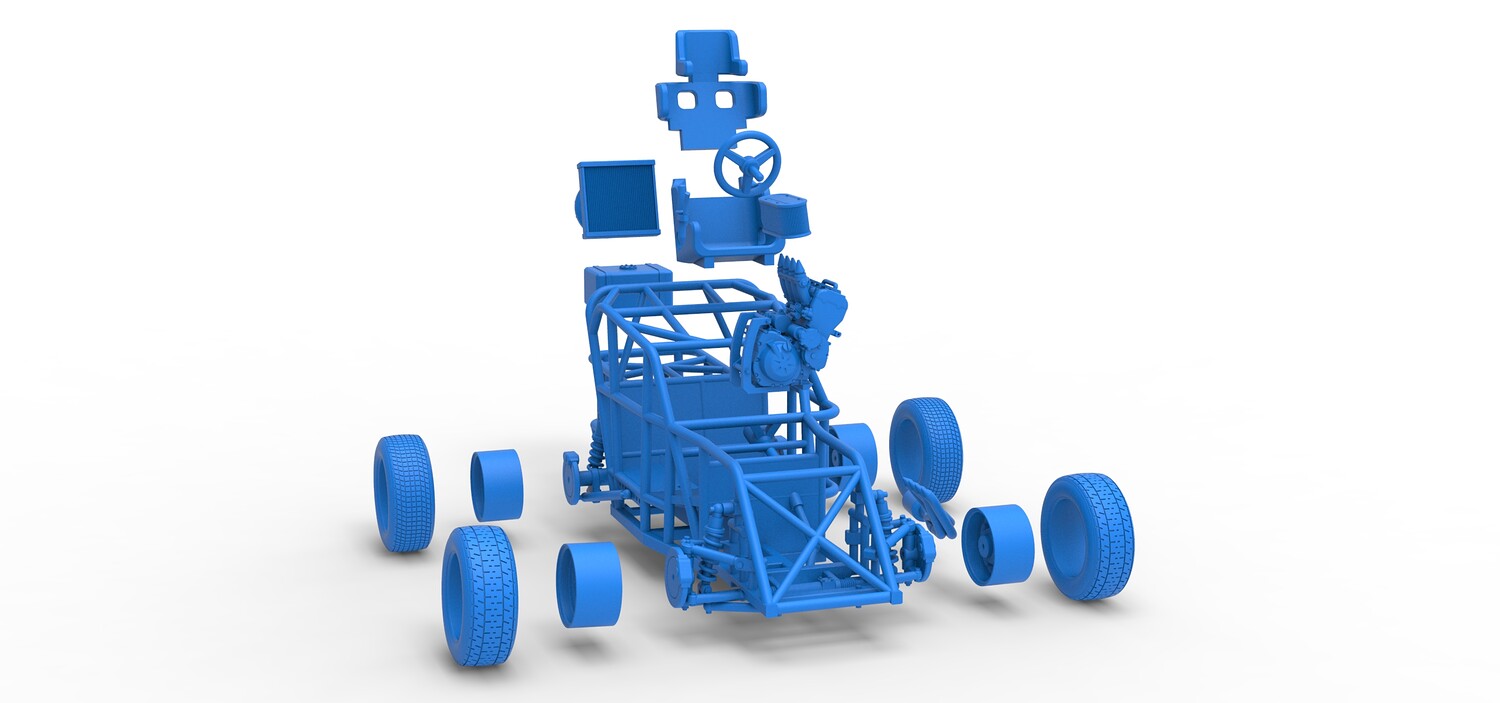 The model consists of parts: Air filter, Engine, Exhaust, Fan, Frame, Front rims, Front tires, Radiator, Rear rims, Rear tires, Seat part 1,2, Shifter, Steering wheel, Tank.