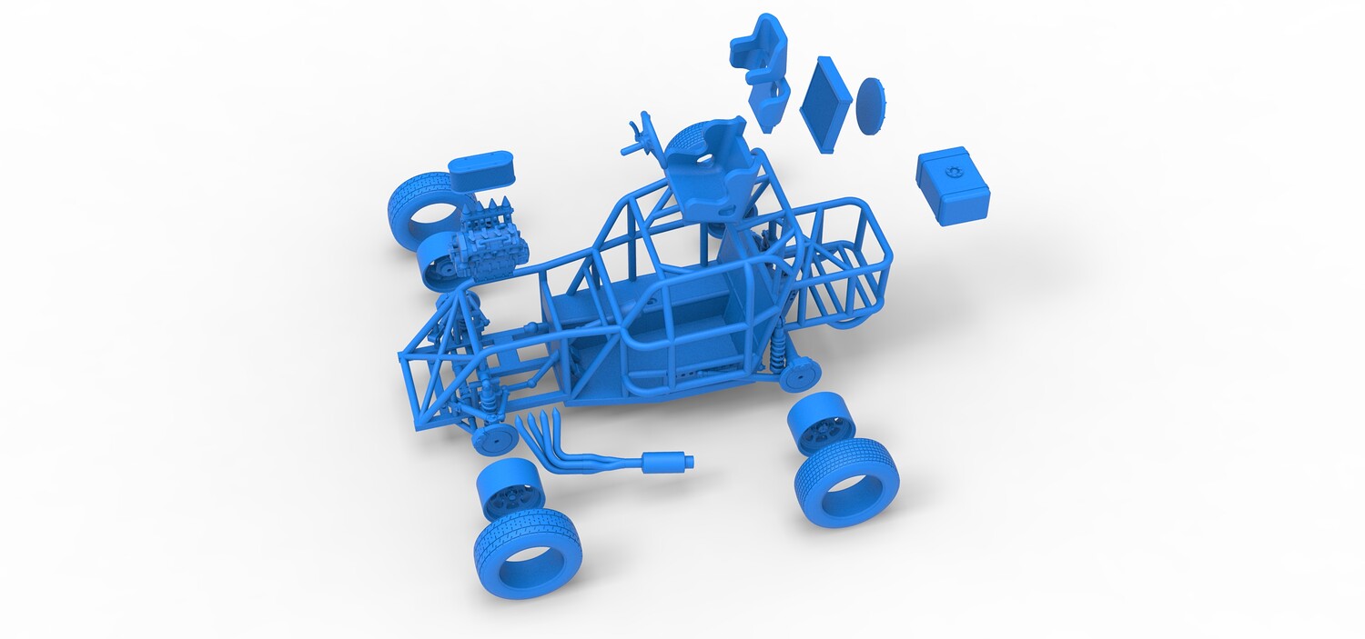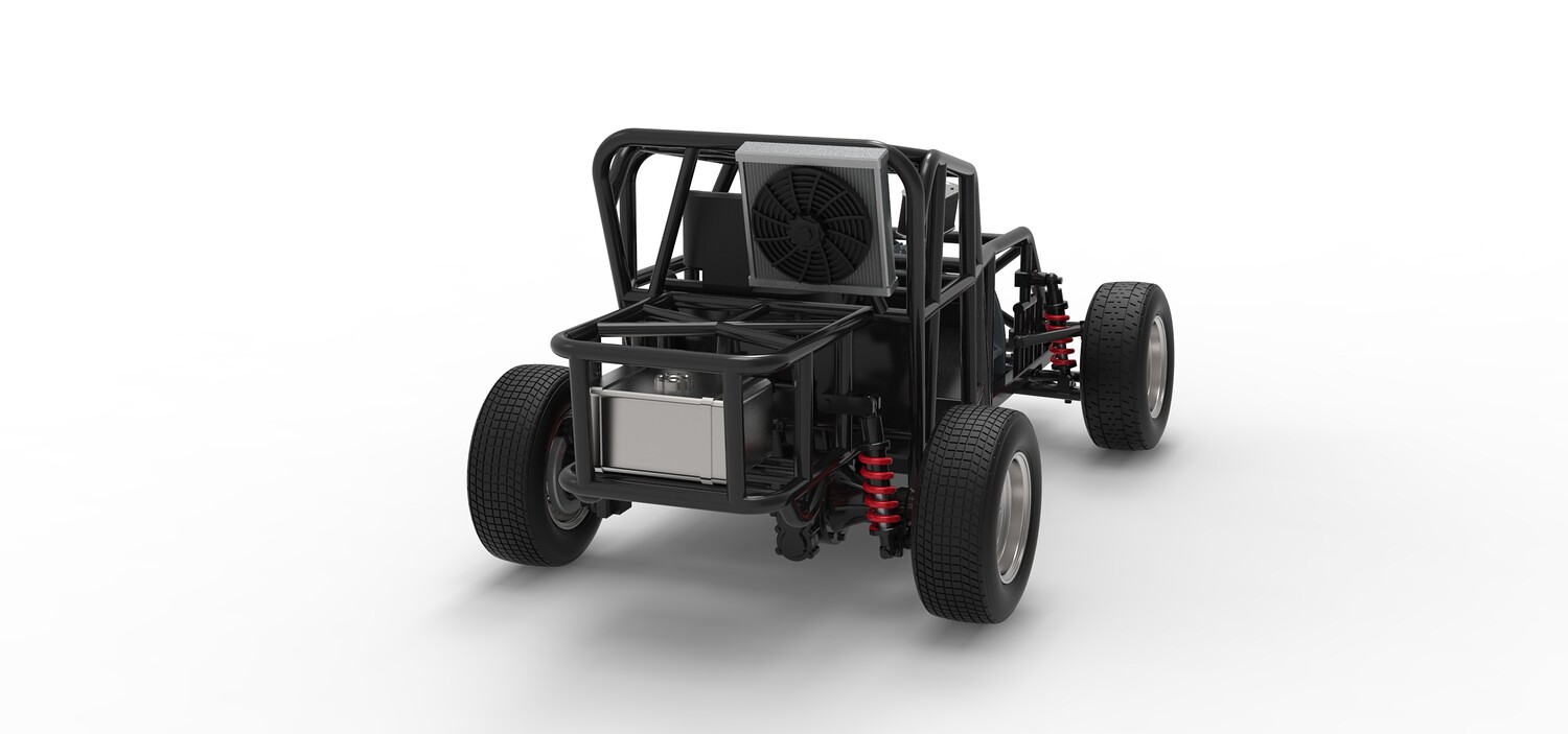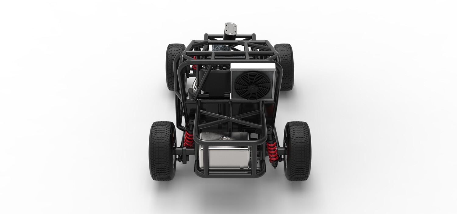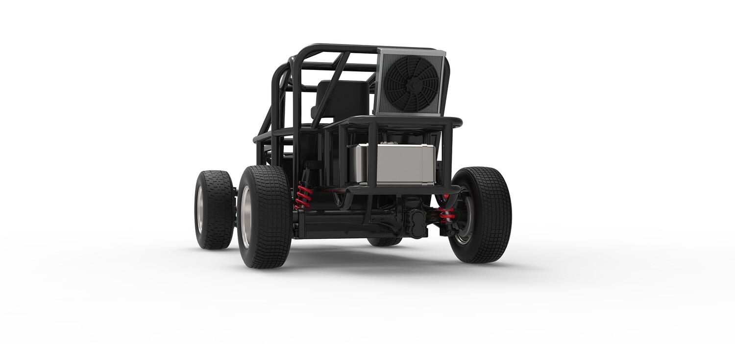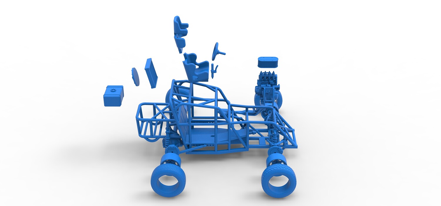 The model consists of parts: Air filter, Engine, Exhaust, Fan, Frame, Front rims, Front tires, Radiator, Rear rims, Rear tires, Seat part 1,2, Shifter, Steering wheel, Tank.