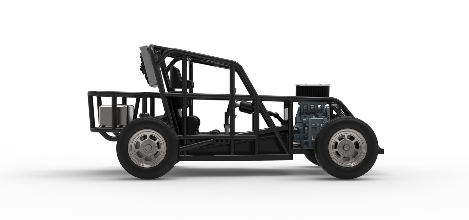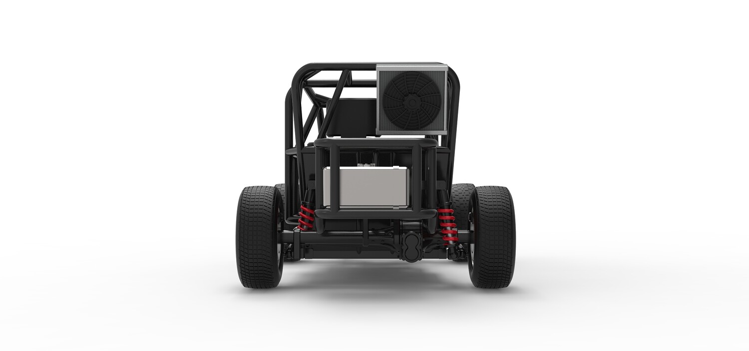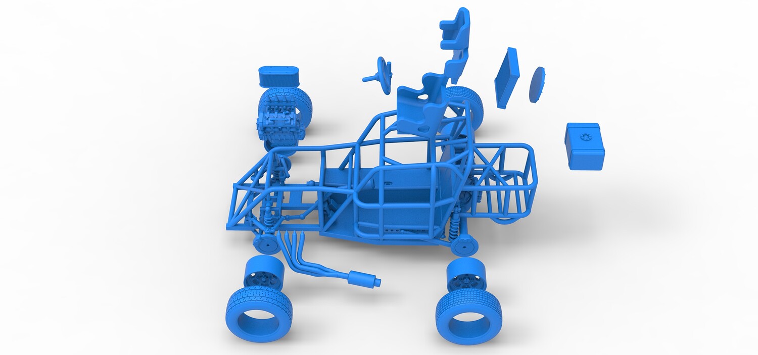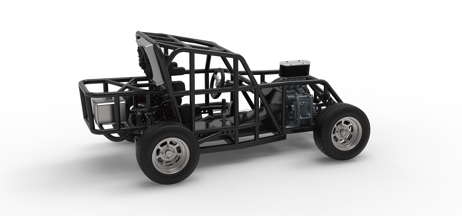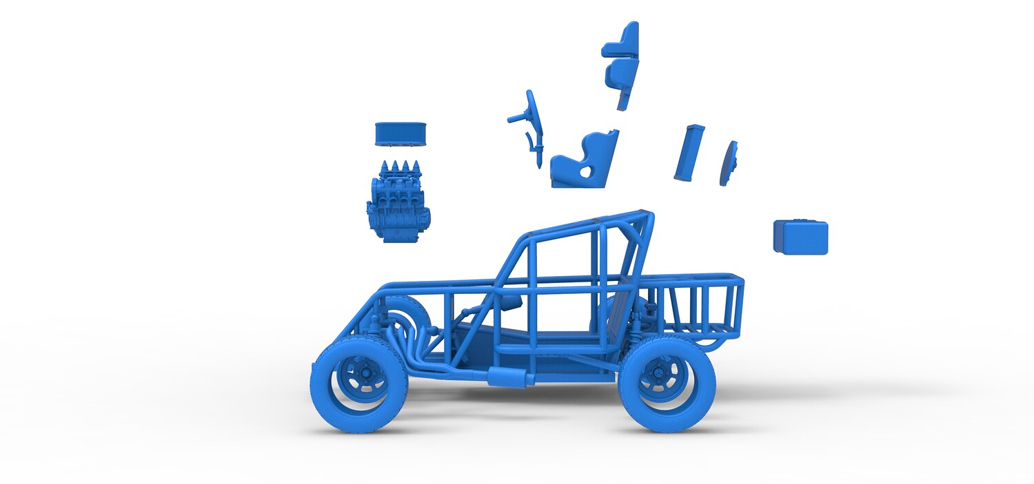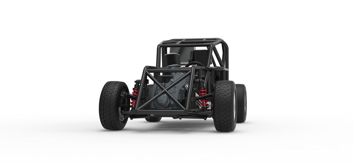 The model consists of parts: Air filter, Engine, Exhaust, Fan, Frame, Front rims, Front tires, Radiator, Rear rims, Rear tires, Seat part 1,2, Shifter, Steering wheel, Tank.