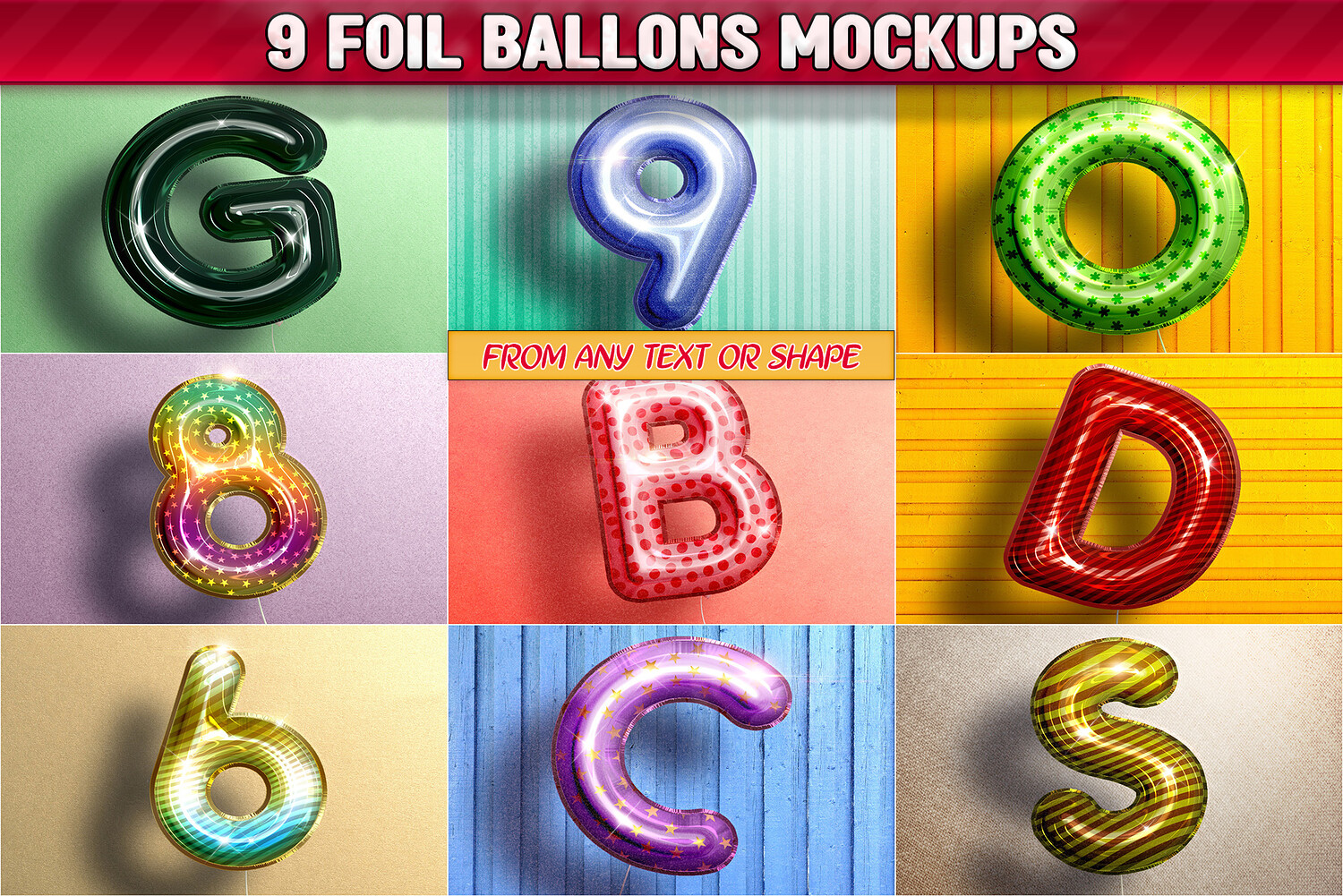 Create stunning party designs with this set of 9 realistic foil balloon mockups! Easily transform any text or shape into glossy 3D balloon letters and numbers with a professional, inflated foil effect.