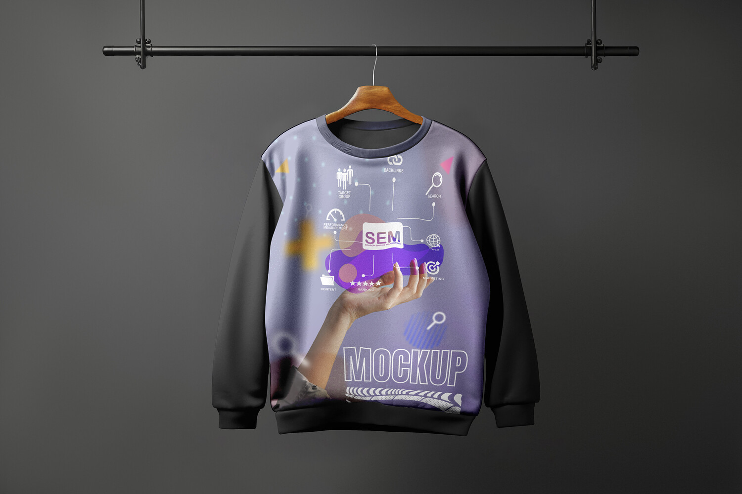 Showcase your apparel designs with this versatile T-shirt and sweatshirt mockup. The image features a realistic-looking garment hanging from a clothing rack against a dark background, providing a professional and clean way to display your custom clothing, graphic art, or brand identity. This template is perfect for e-commerce, portfolios, and fashion-related projects.