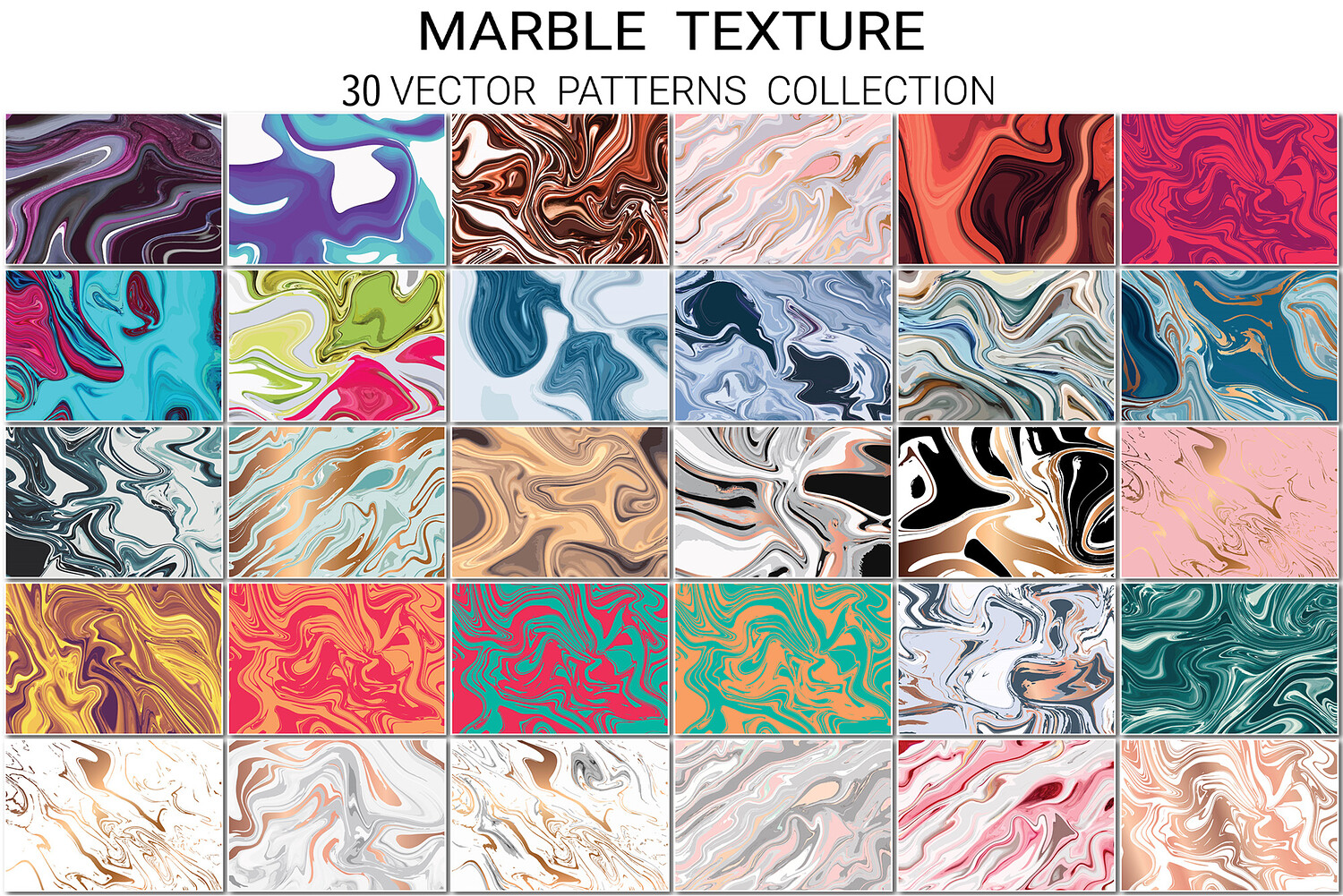 A collection of 30 marble texture designs showcasing various vibrant and intricate patterns. Ideal for creative projects, graphic design, and backgrounds, these vector illustrations encompass a variety of styles and color palettes.