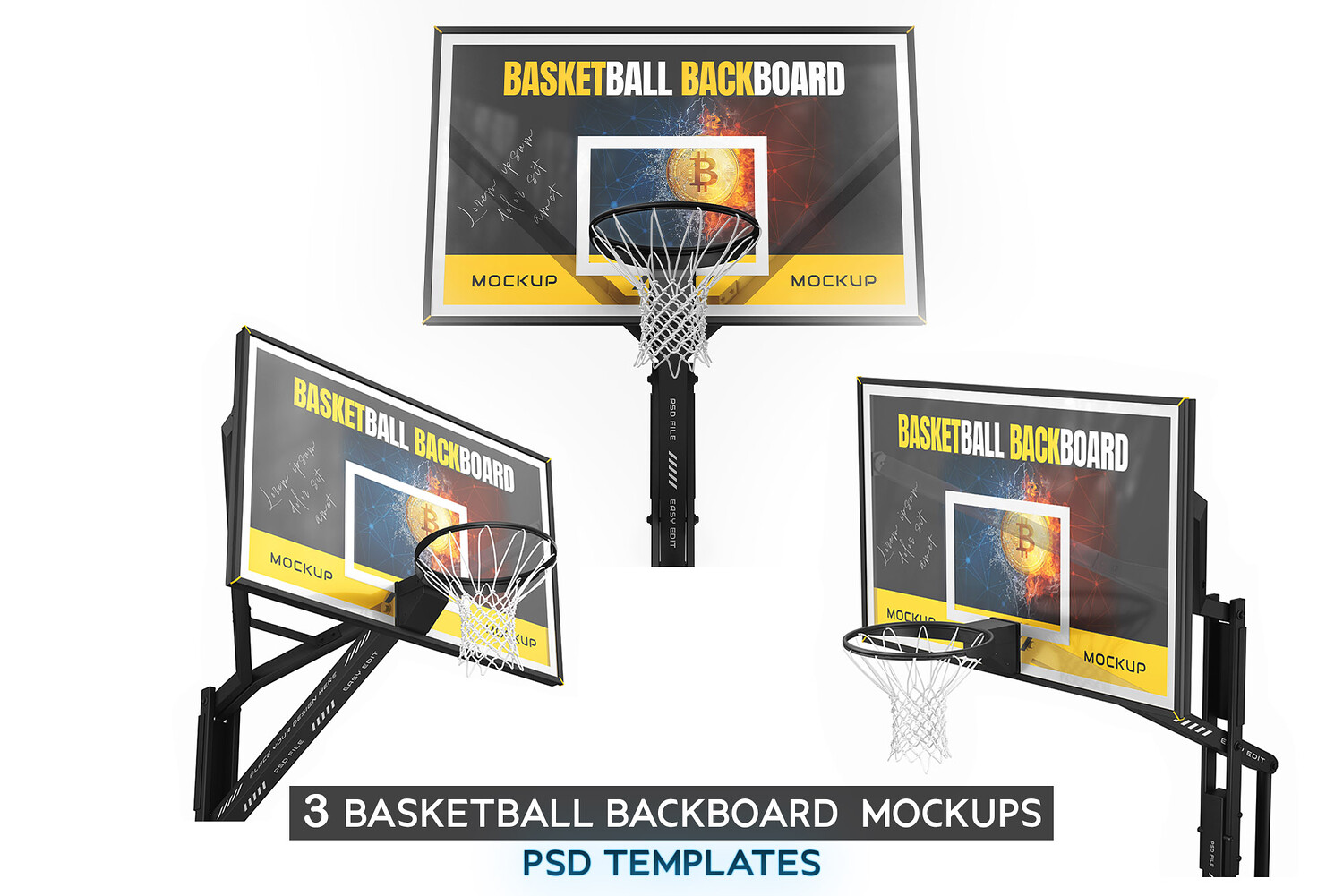 3 Basketball Backboard Mockups PSD Bundle, Sports Branding & Arena Advertising