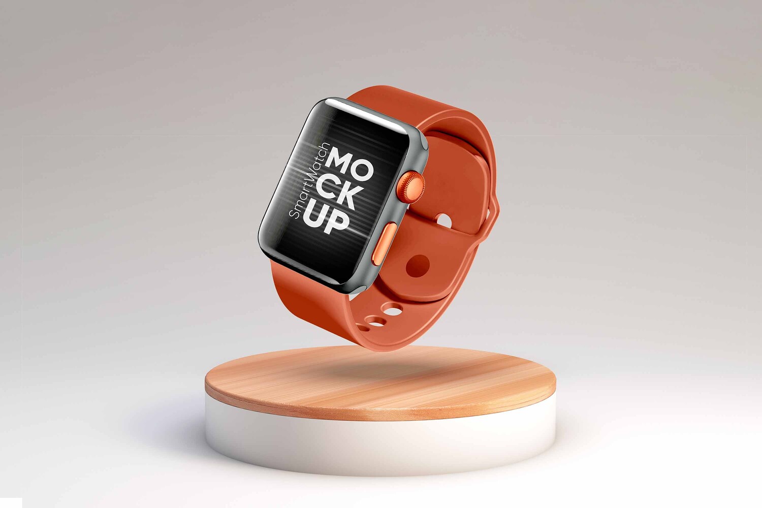 Smartwatch Mockup PSD Template with Orange Band on Wooden Pedestal