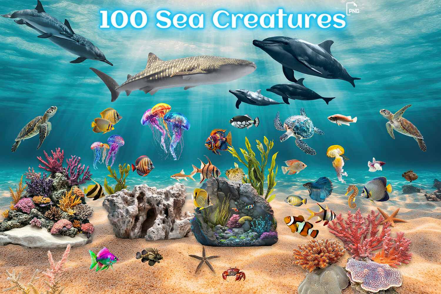 100 Sea Creatures Clipart PNG Bundle, Ocean Animals, Fish, Dolphins, Turtles, Jellyfish, Coral Reef