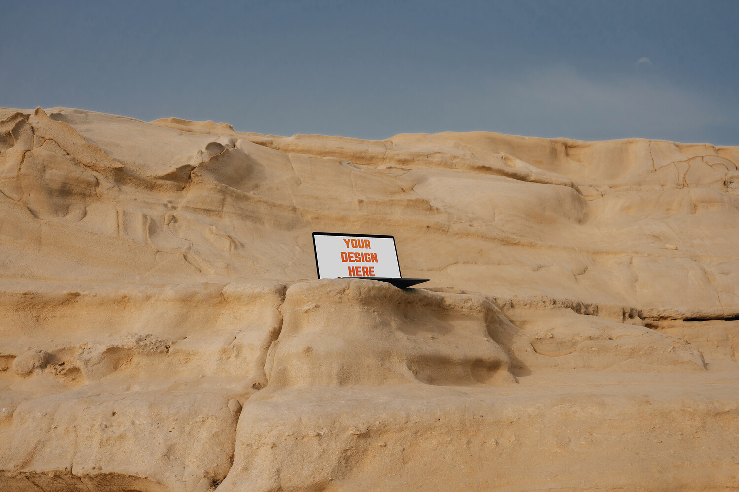 Present your adventurous and rugged digital designs with this unique MacBook Pro mockup. The image features a laptop with a blank screen, resting on a striking, layered rock formation under a vast sky. This template is perfect for showcasing designs for outdoor brands, travel blogs, or any project with a natural or earthy theme.