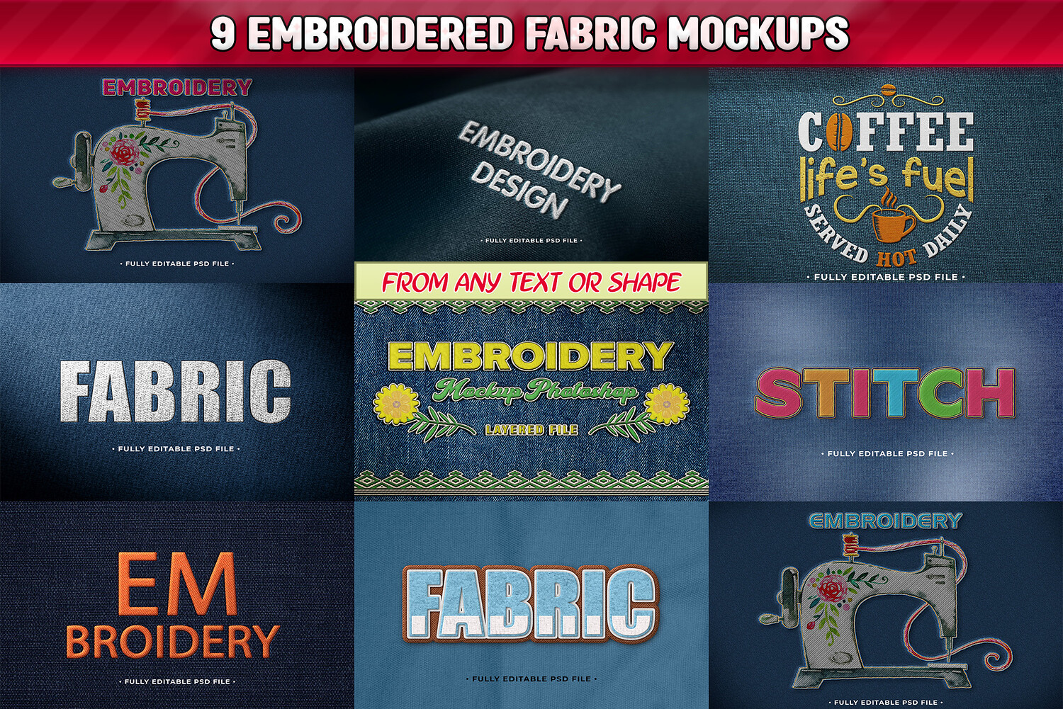 9 Embroidery PSD Fully Editable Text Effect. Layer Style PSD Mockup Template