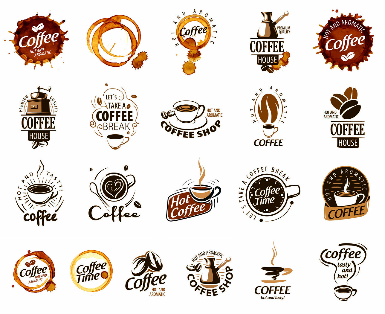 A diverse set of coffee logos and emblems showcasing warm browns, cups, beans, and playful typography. Ideal for branding, marketing, and creative projects centered on coffee culture.