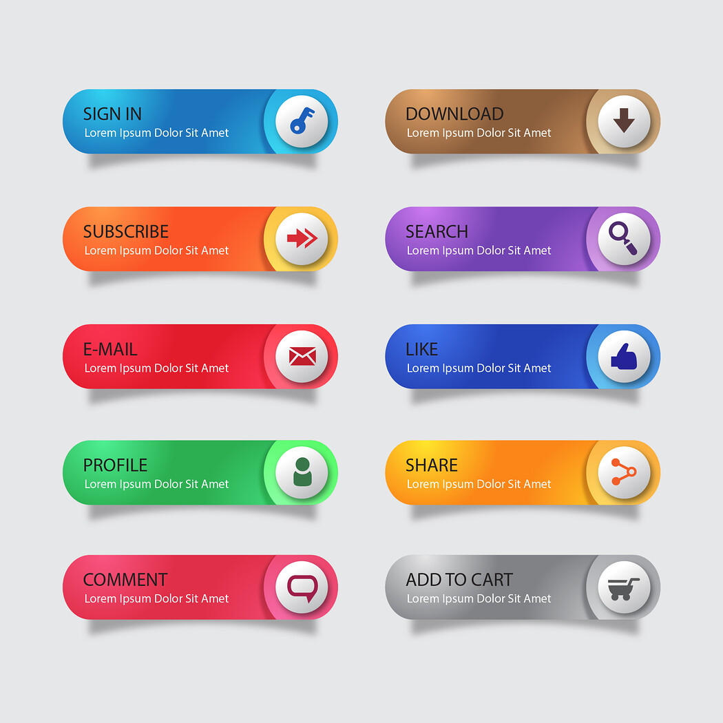 10 Colorful Web UI Action Buttons, Sign In, Download, Subscribe, Search, Like Icons