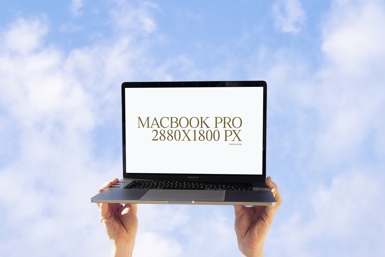 Elevate your digital designs with this unique MacBook Pro mockup. The image features a laptop held up against a clear blue sky with fluffy clouds, creating a sense of freedom and possibility. This template is perfect for showcasing projects with a light, optimistic, or cloud-based theme.