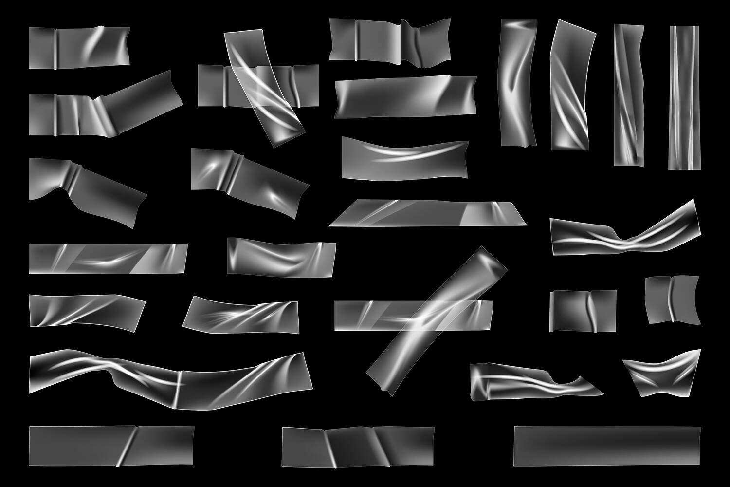 Collection of high-quality transparent duct tape illustrations showing curls, folds, and textures for graphic design, mockups, and creative art projects requiring adhesive objects.