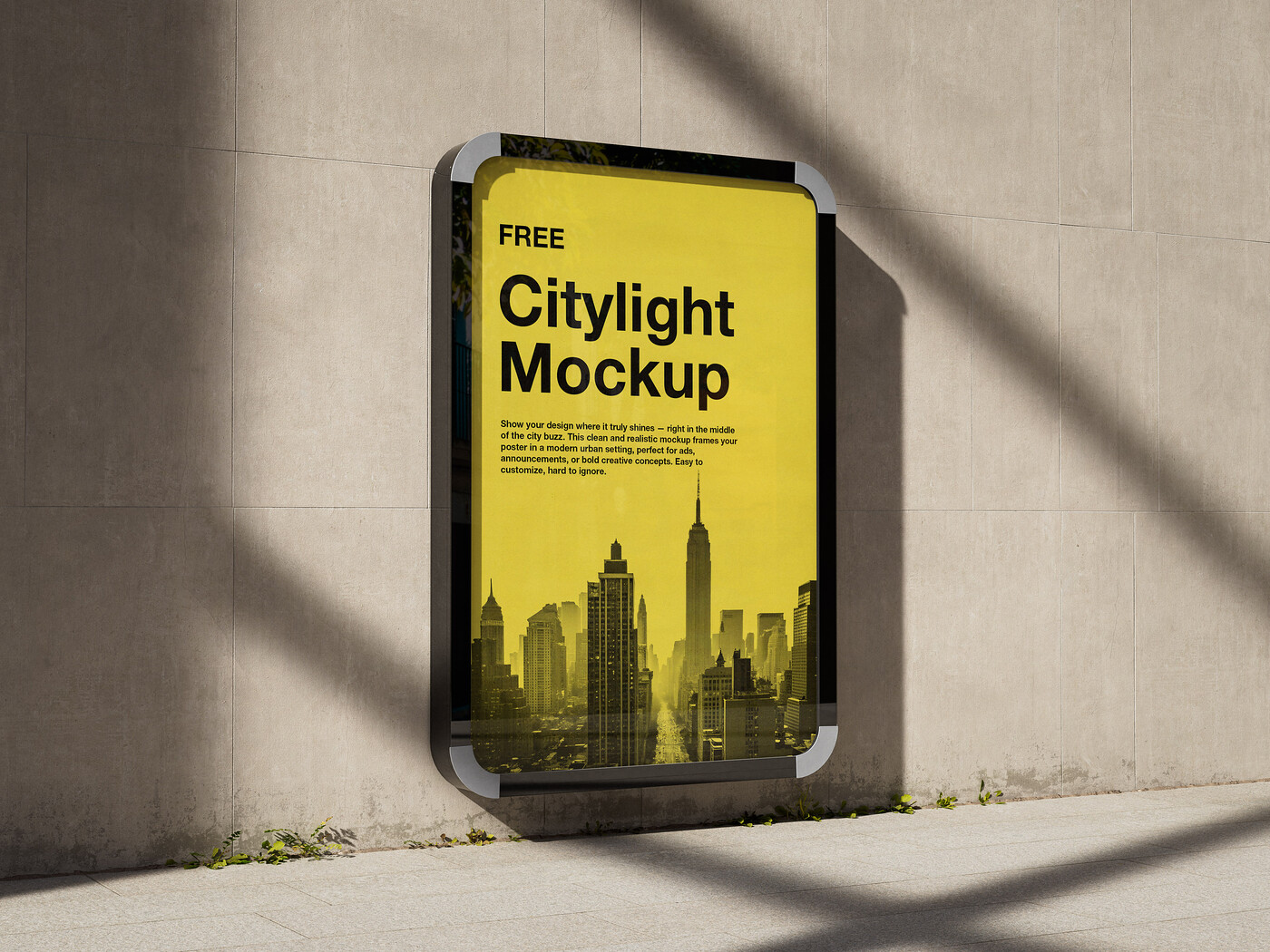 Advertising, public service announcements, or event promotions with this realistic Vertical Citylight Poster Mockup PSD Template. This high-quality visual features an illuminated, rounded-frame advertising panel mounted on a textured concrete wall under bright, directional sunlight, casting sharp shadows. The setting is ideal for displaying large-format prints, transit shelter ads, or striking outdoor campaigns in an authentic urban environment. Easily place your custom poster design onto the display using the smart object in the PSD file.