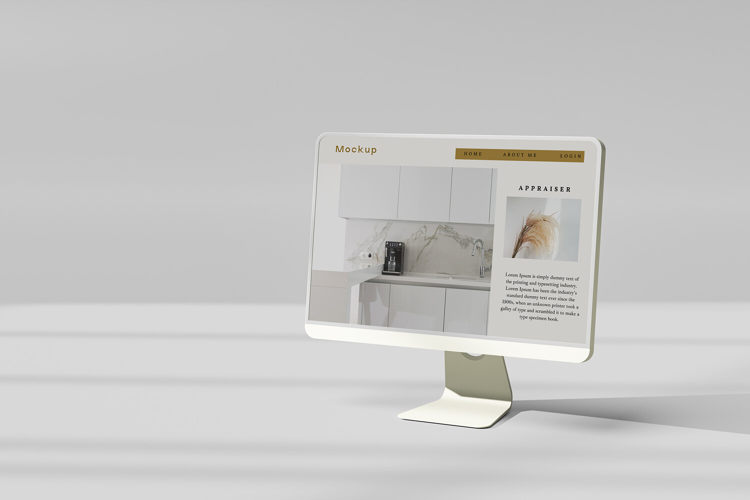 Showcase your website or UI designs with this clean, minimalist clay desktop monitor mockup. The template features a floating screen with a modern, artistic style, perfect for presenting web designs, app interfaces, or branding in a professional setting. Easily customize the on-screen display using smart objects.
