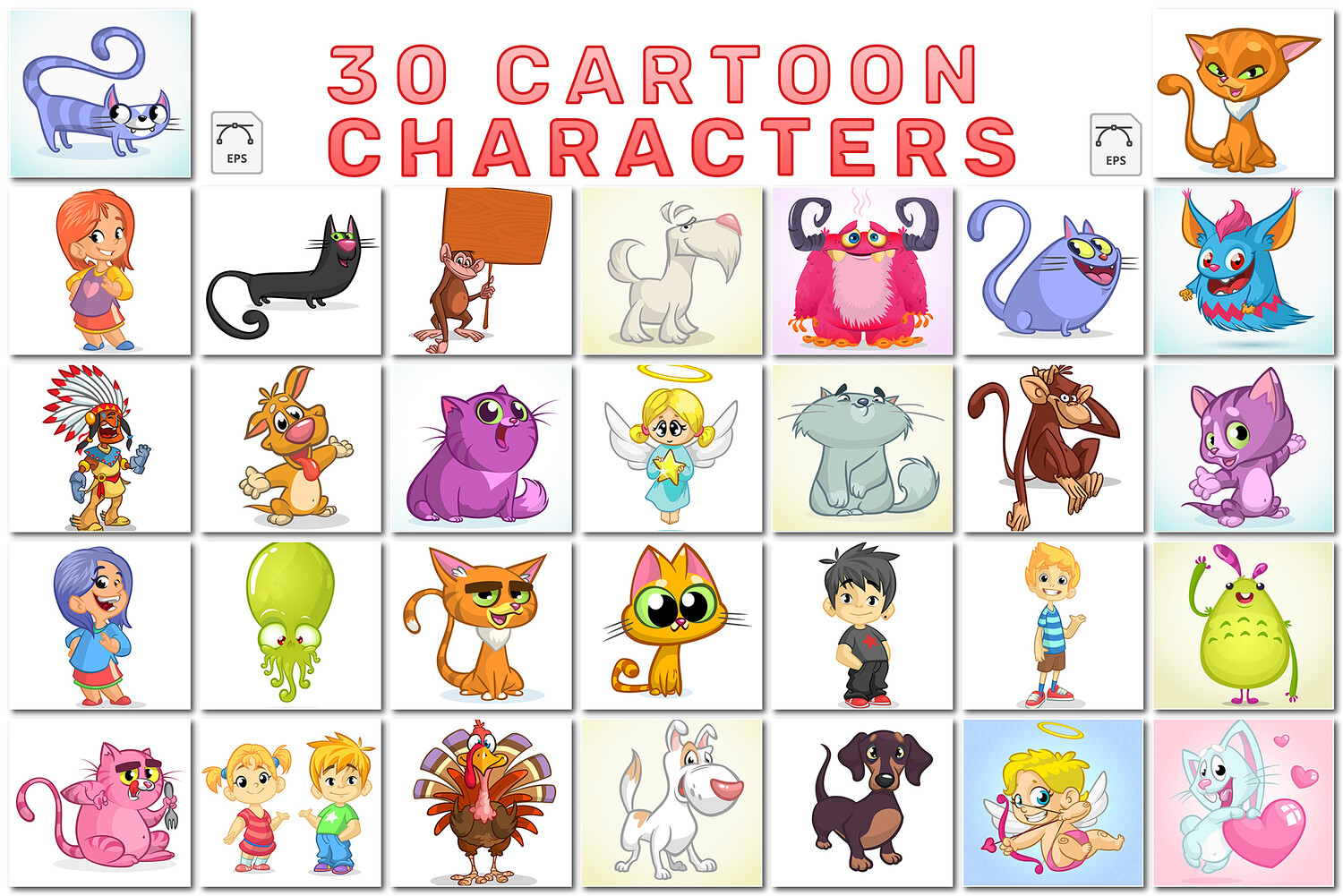 30 Cartoon Character Illustrations, Cute Animals, Kids, Fantasy Heroes, Humans, EPS File
