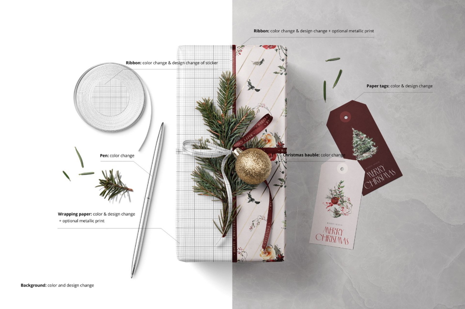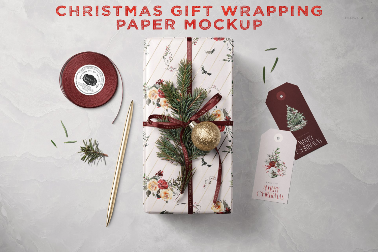 Showcase your holiday patterns, wrapping paper designs, and seasonal branding with this high-end Christmas mockup. This top-down flat lay features a beautifully wrapped gift box, two customizable gift tags, a gold pen, a spool of burgundy ribbon, and natural pine sprigs on a textured marble background. It is the perfect tool for stationery designers, illustrators, and boutique owners looking to present their Christmas collection in a warm, professional, and sophisticated setting.