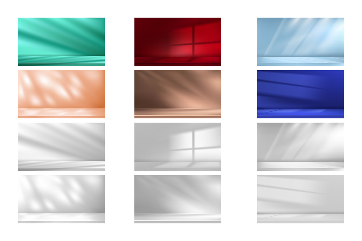 A professional set of studio backgrounds with realistic light and shadow effects, perfect for graphic design, product presentations, or mockups. Each background features a clean, modern look and comes in editable EPS vector format, allowing easy customization and resizing without quality loss. Ideal for branding, creative projects, and realistic 3D scenes.