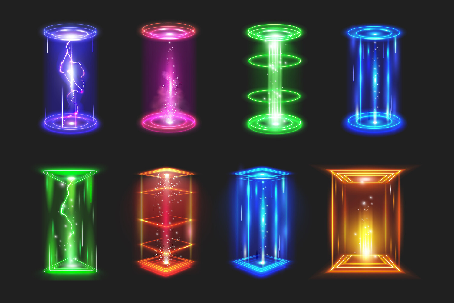 Bright futuristic portals with colorful glowing neon energy designs against a dark background. These vibrant elements evoke advanced technology, modern sci-fi aesthetics, and mystical concepts.