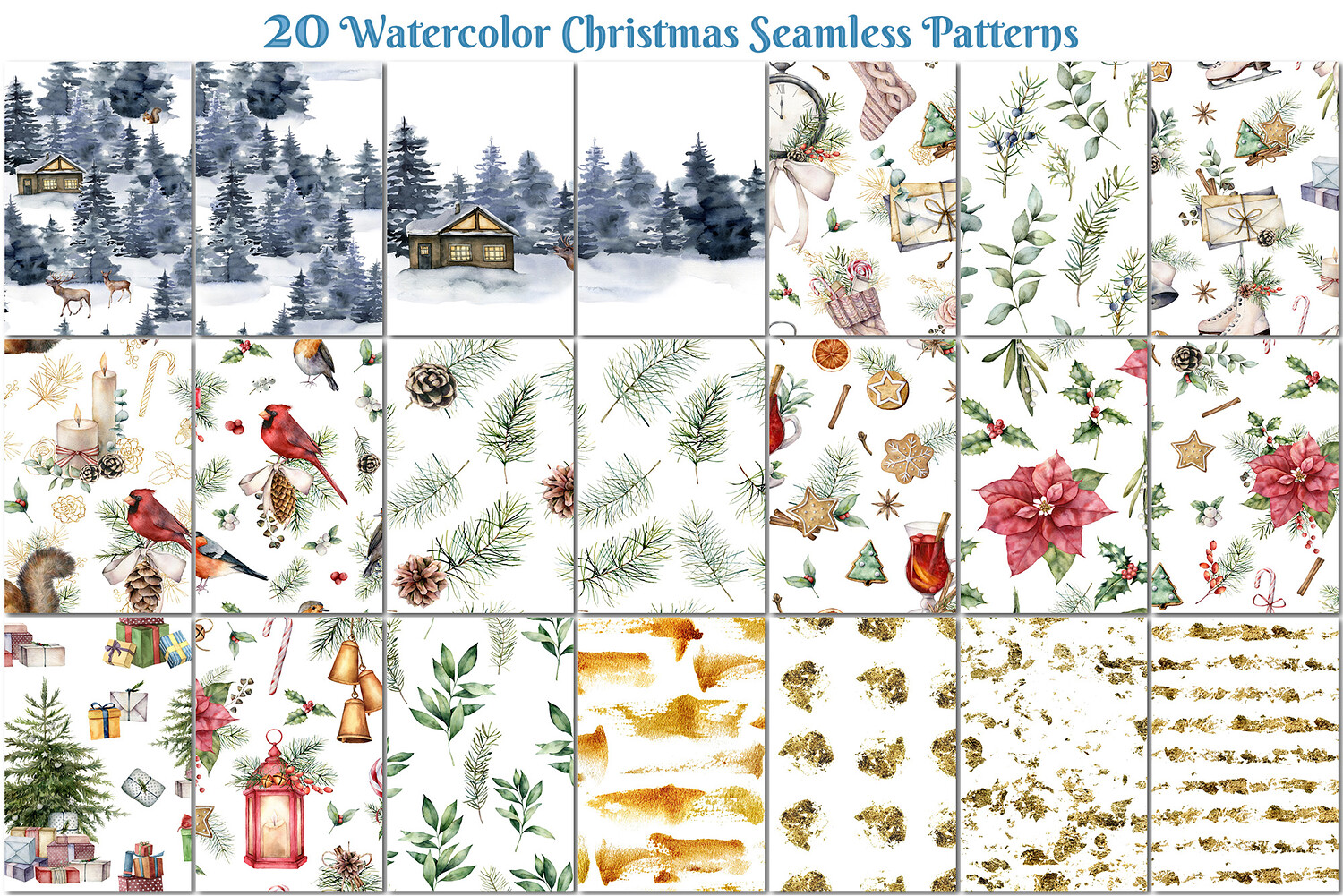A 20-piece watercolor seamless pattern collection showcasing cozy winter scenes, pine branches, holly, poinsettias, candles, lanterns, gifts, and festive botanicals for holiday design projects and stock visuals.