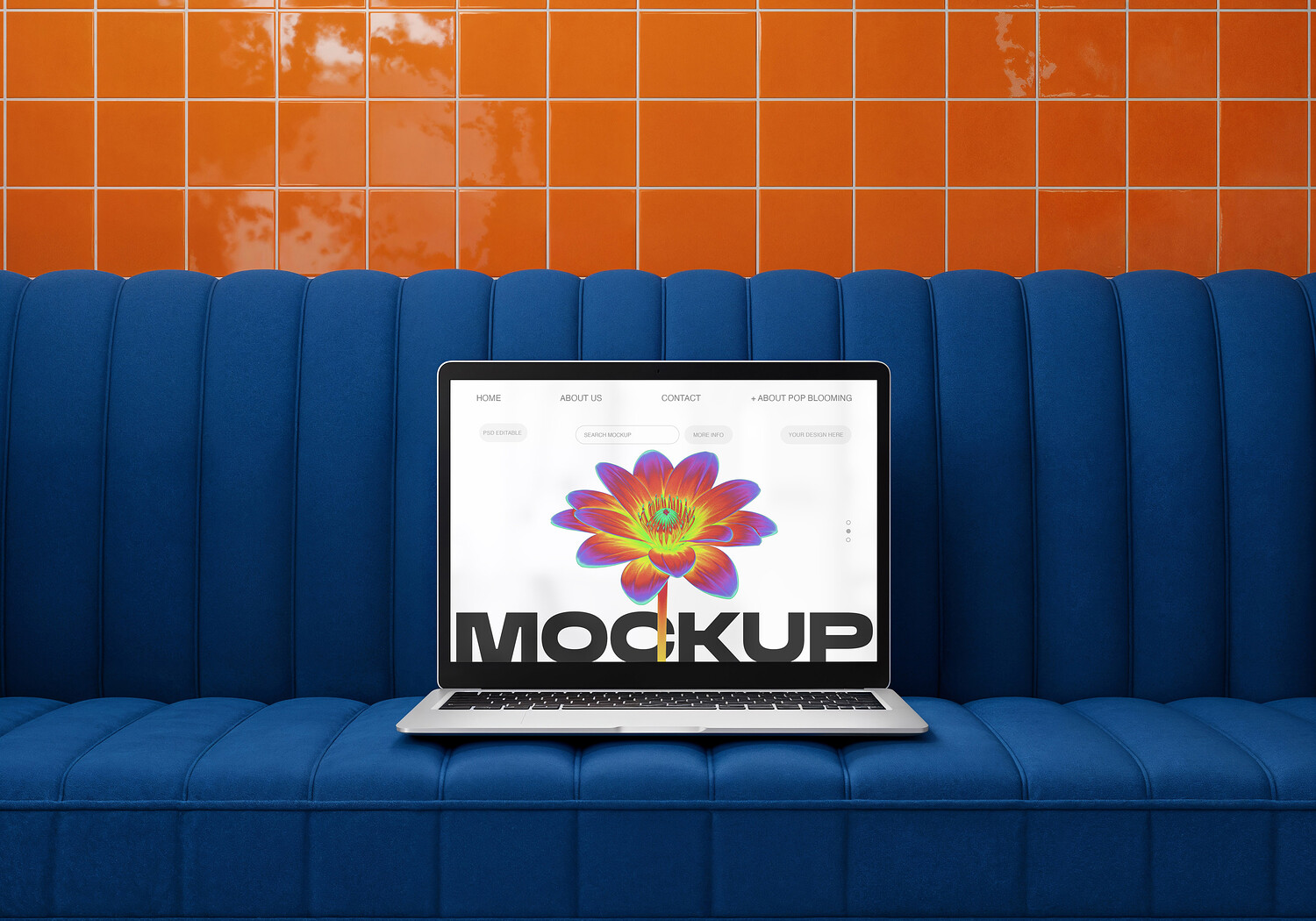 Present your website, digital art, or app interface with a vibrant, eye-catching aesthetic using this Modern Laptop on Blue Sofa Mockup PSD Template. This unique, high-contrast scene features a sleek laptop resting on a bold cobalt blue velvet couch set against a striking orange tiled wall. The playful, contemporary environment is perfect for showcasing projects with a modern, retro, or maximalist design style, ideal for creative portfolios or social media posts. Use the smart object in the high-resolution PSD file to effortlessly display your custom screen design in this memorable setting.
