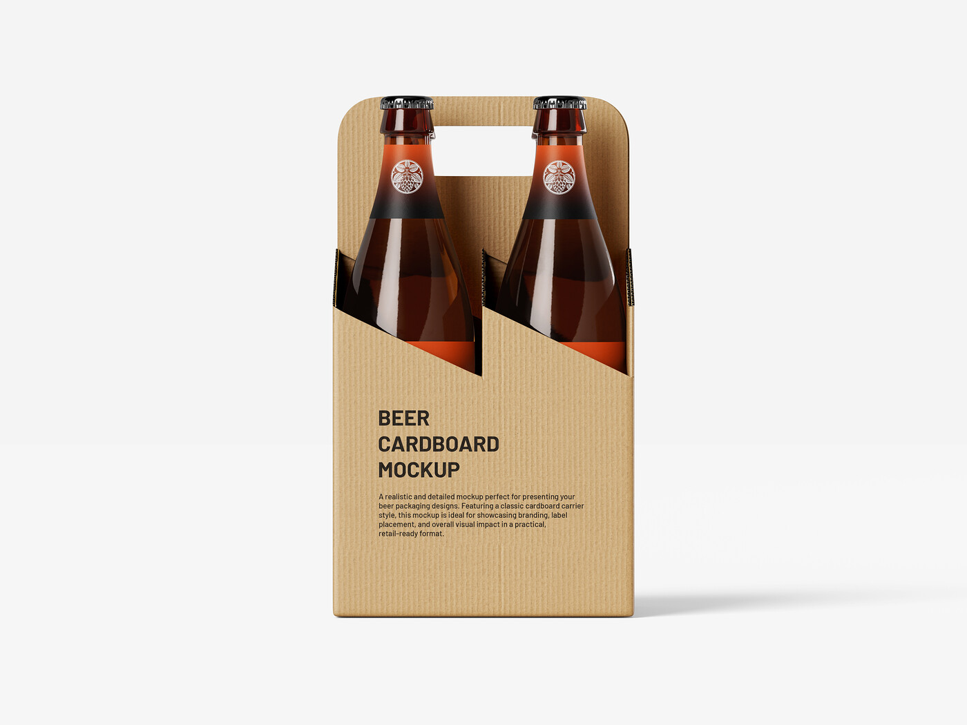 Present your craft beverage brand, specialty beer, or limited-edition drinks with this clean and focused Two-Pack Beer Bottle Carrier Mockup PSD Template. This straight-on view features two amber glass bottles securely held within a kraft cardboard carrier with a classic handle cutout. The minimalist design of the plain cardboard makes it ideal for showcasing custom label artwork, bold logo placement, and premium retail packaging for small-batch brews. This high-resolution asset is perfect for e-commerce product views, promotional shots, or print collateral. The smart objects in the PSD file allow for easy customization of the cardboard design and the bottle labels.