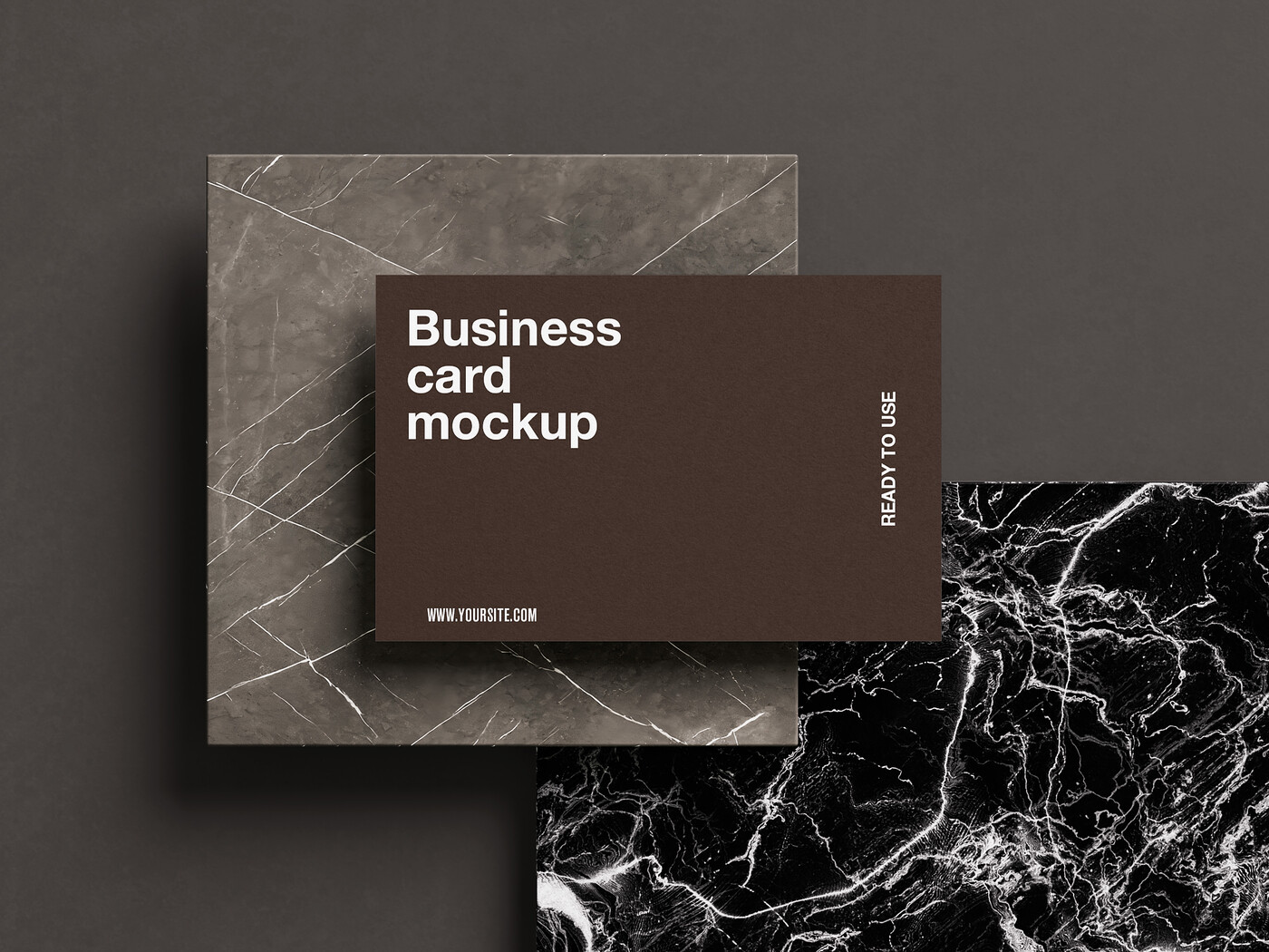 Present a sophisticated and high-end brand identity with this striking overhead business card mockup. The composition is set against a complementary dark grey background, creating a minimalist yet luxurious display. This mockup is perfect for showcasing premium branding, high-end services, architectural firms, or modern design portfolios.