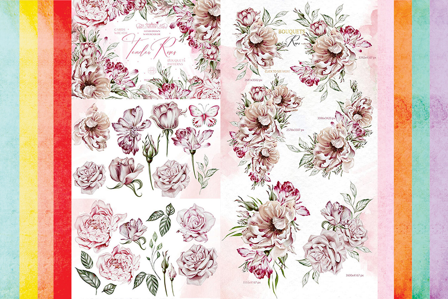 - 6 Watercolor Bouquet Roses, PNG