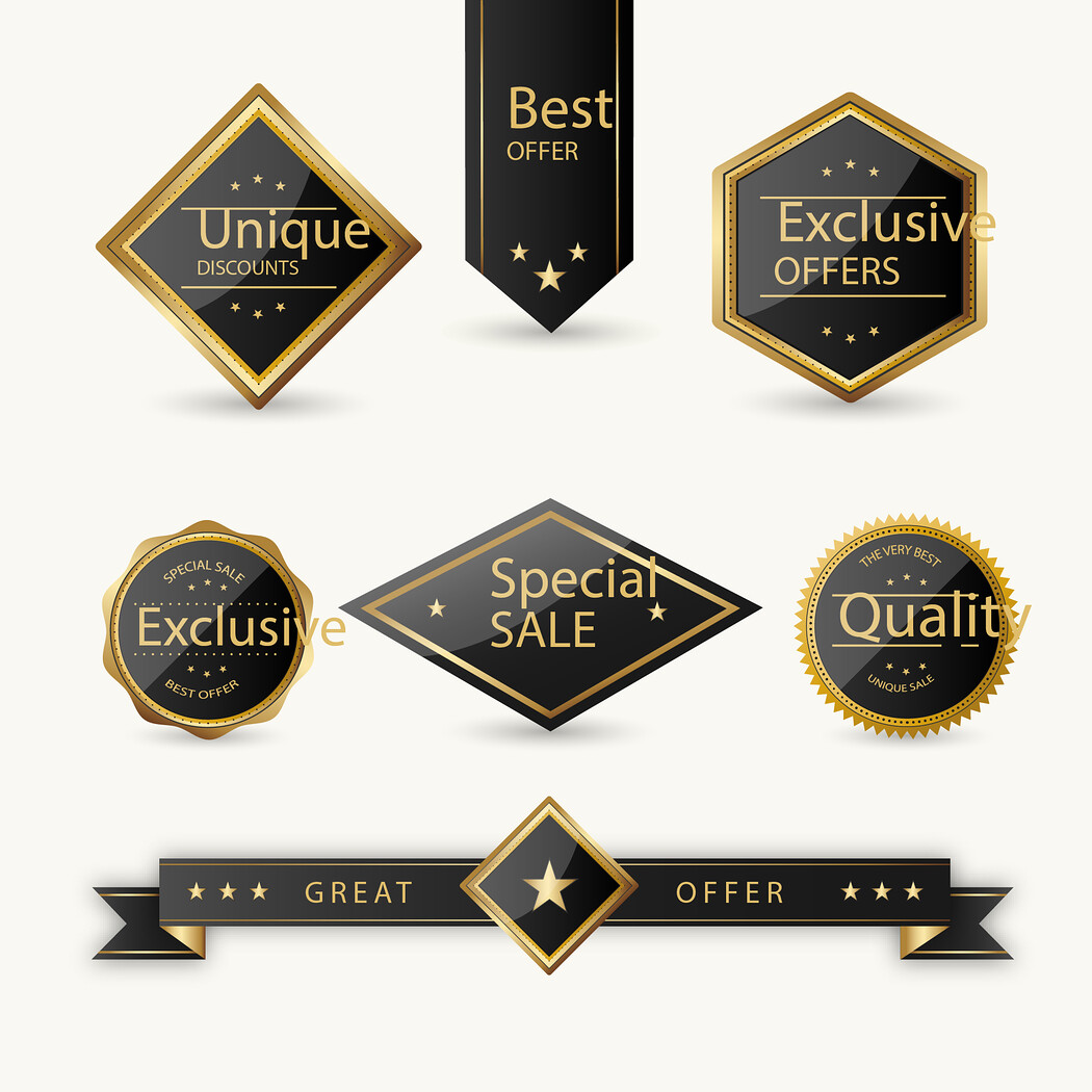 Set of gold sale and offer banners featuring promotional messages and elegant designs. Ideal for advertisements, marketing campaigns, and graphics emphasizing exclusivity and quality.