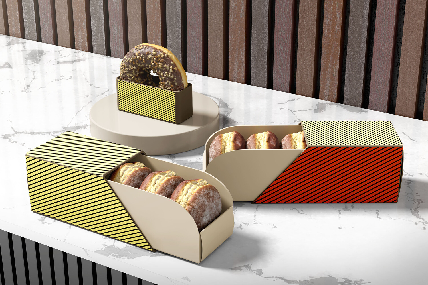 Present your artisanal bakery or sweet treat brand with this colorful and modern packaging mockup, contemporary display for food branding, patisserie, or snack products.