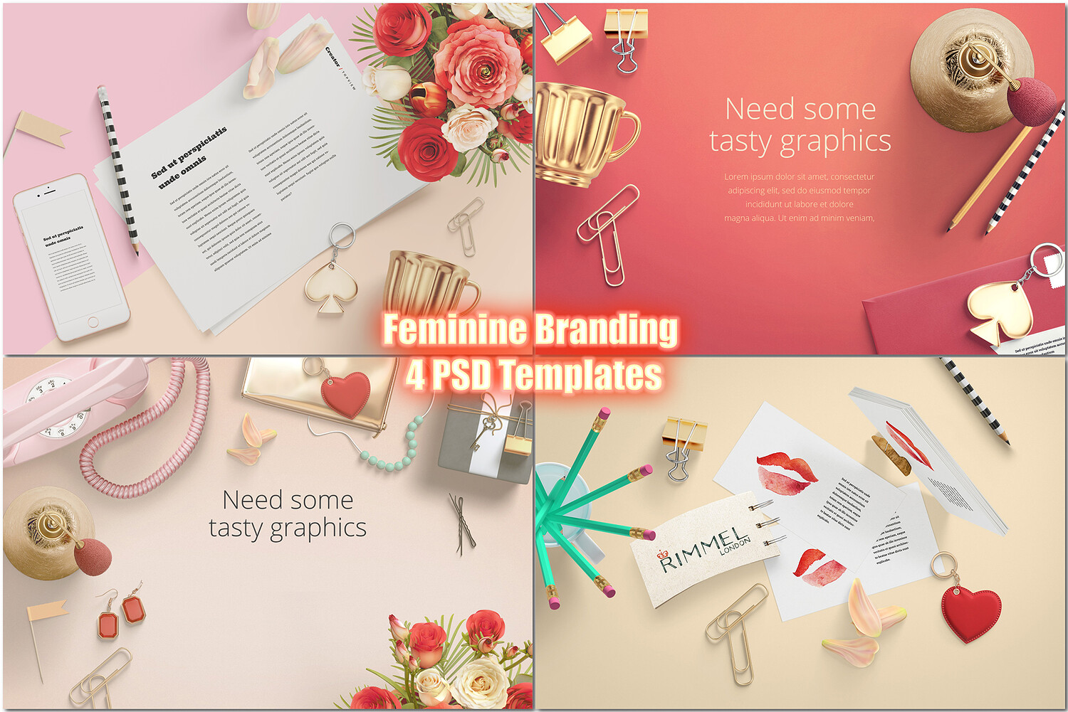 Feminine Branding Mockup, 4 PSD Templates, Elegant Stationery, Florals, Beauty, Office